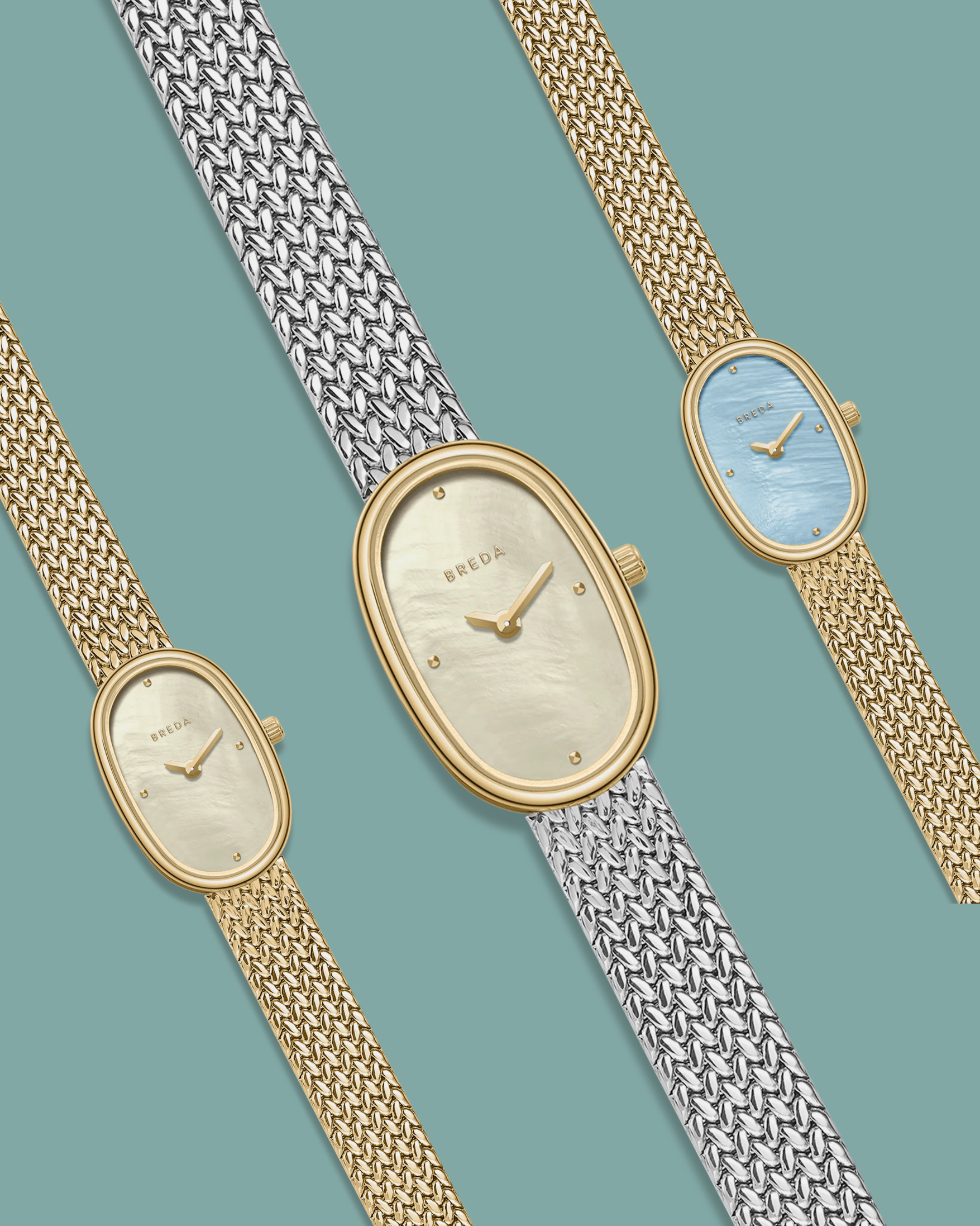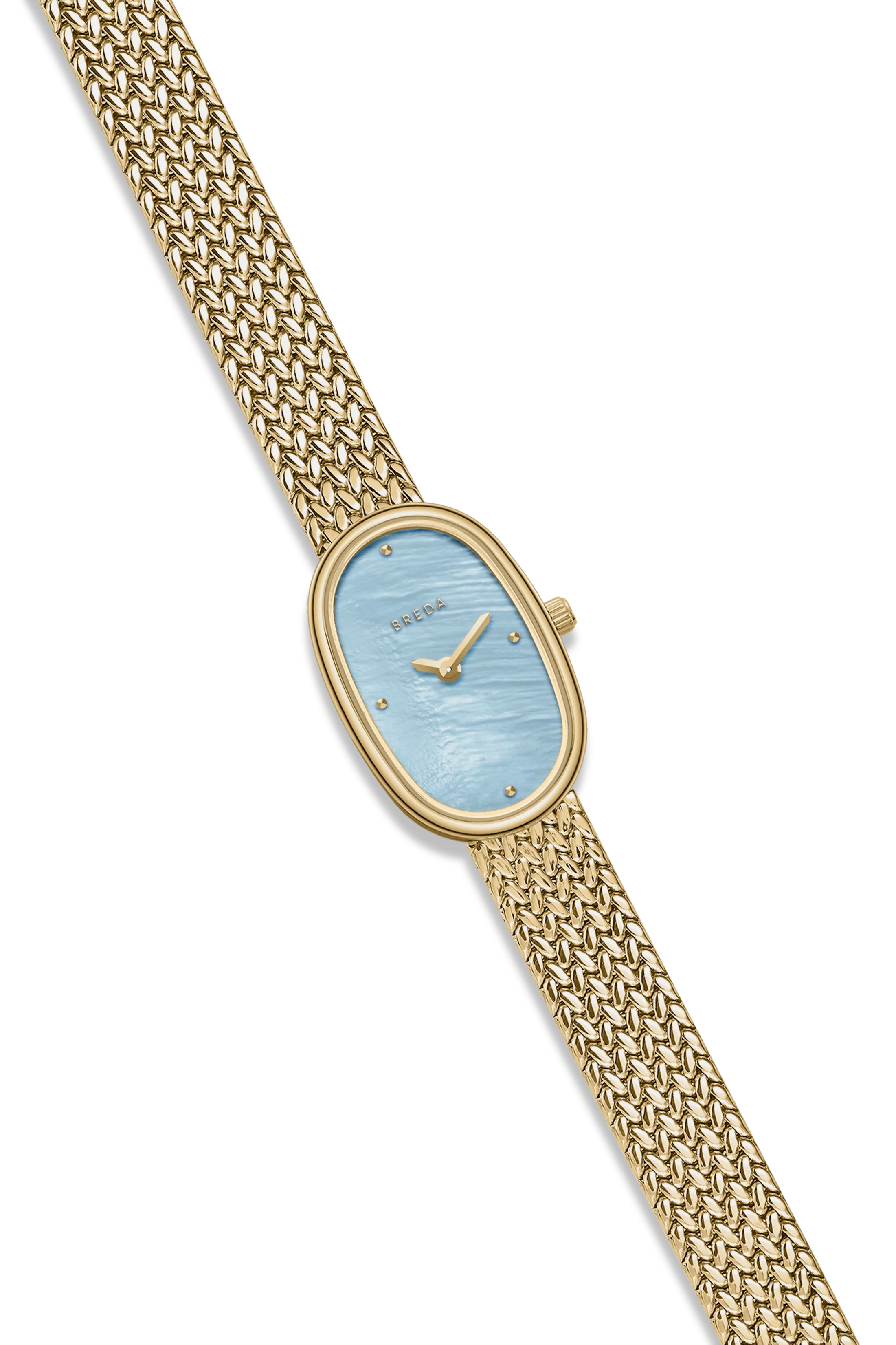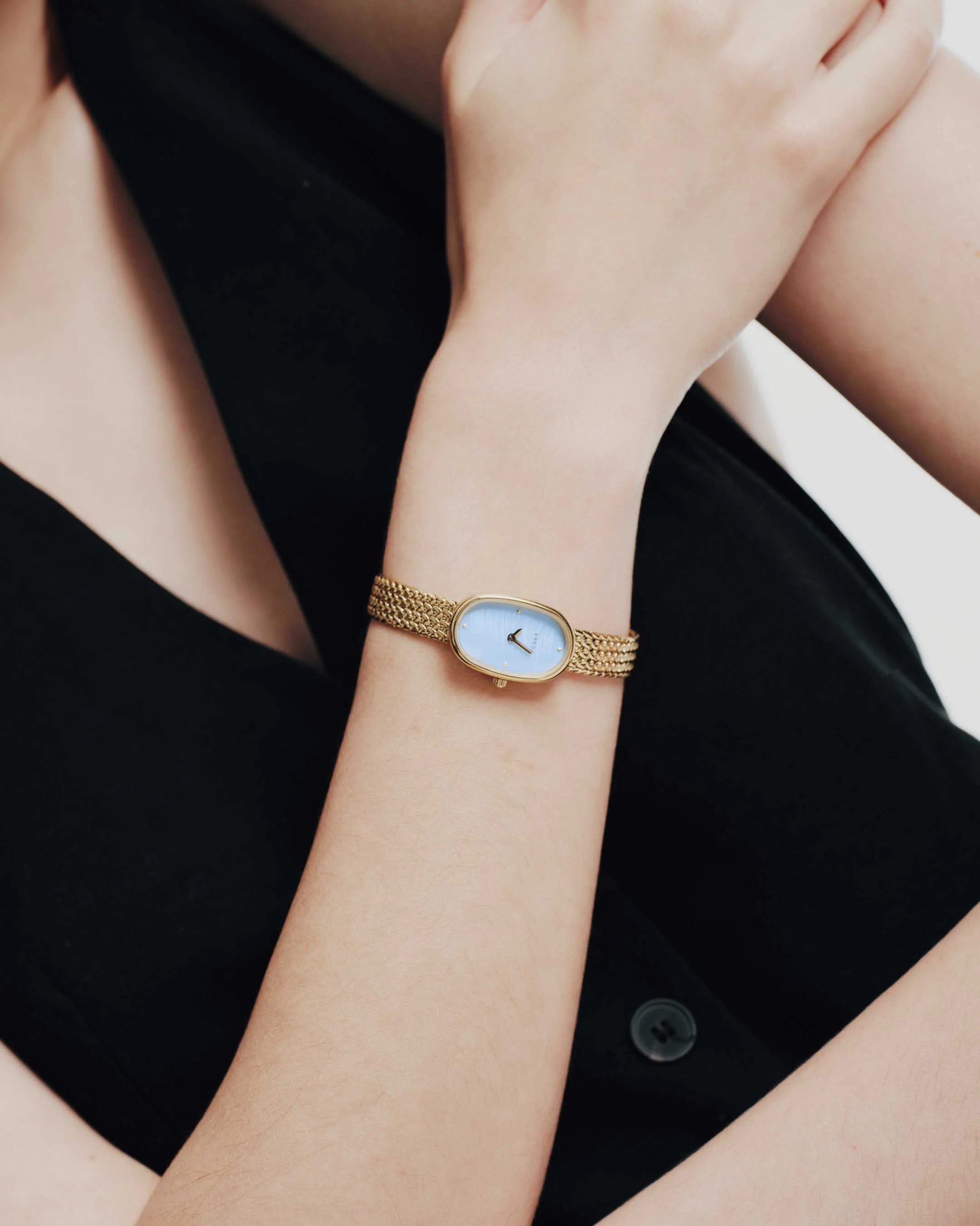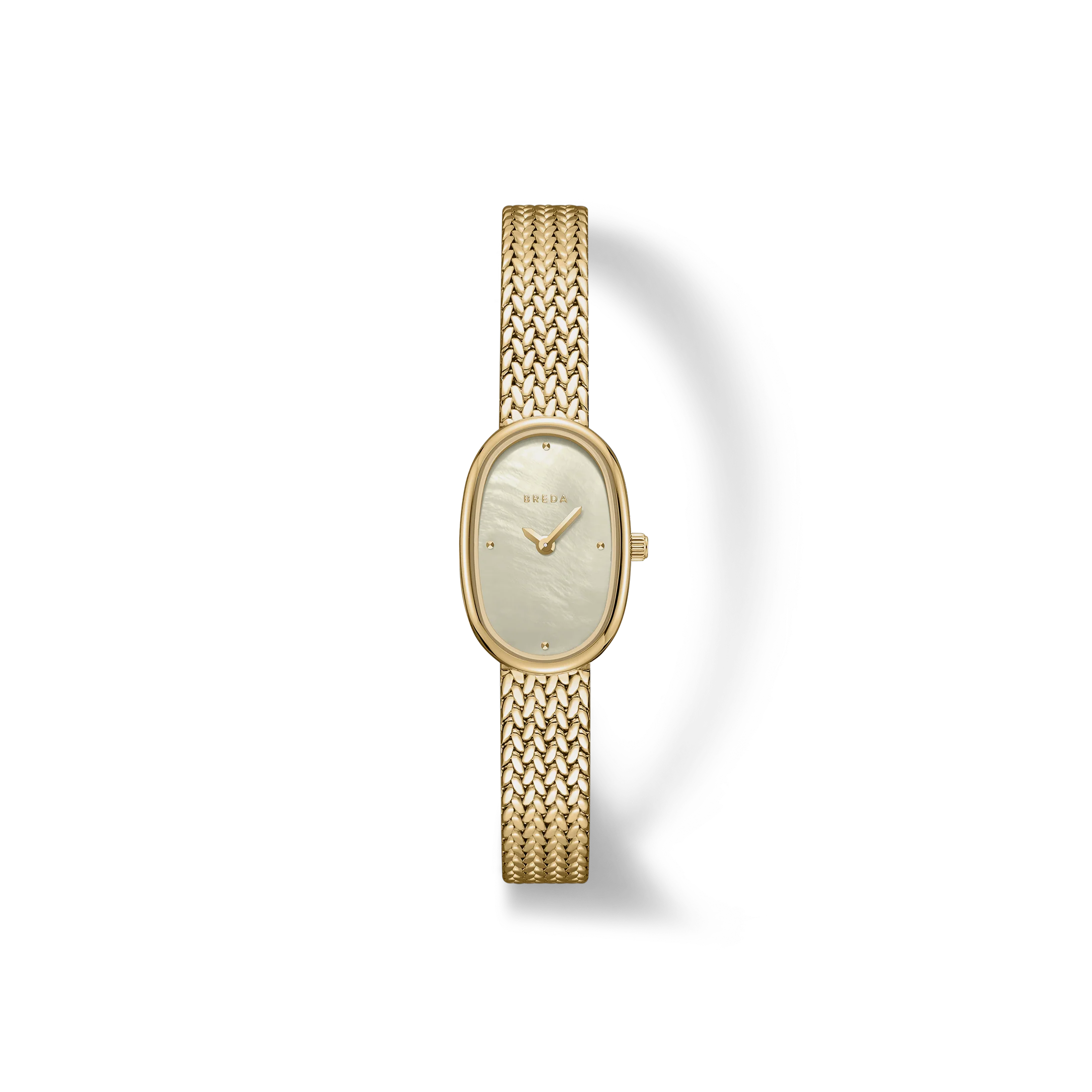 The Jane Tethered Mini Watch celebrates the bonds that tie us together. This petite timepiece features an 18mm oval case paired with a champagne mother of pearl dial that catches the light beautifully. The woven mesh bracelet includes a convenient quick release clasp for easy on-and-off wear. Each dial is uniquely textured—a natural characteristic of mother of pearl that makes your watch one-of-a-kind. Perfect for everyday wear, it's a subtle reminder of connection and shared moments.