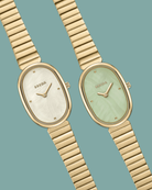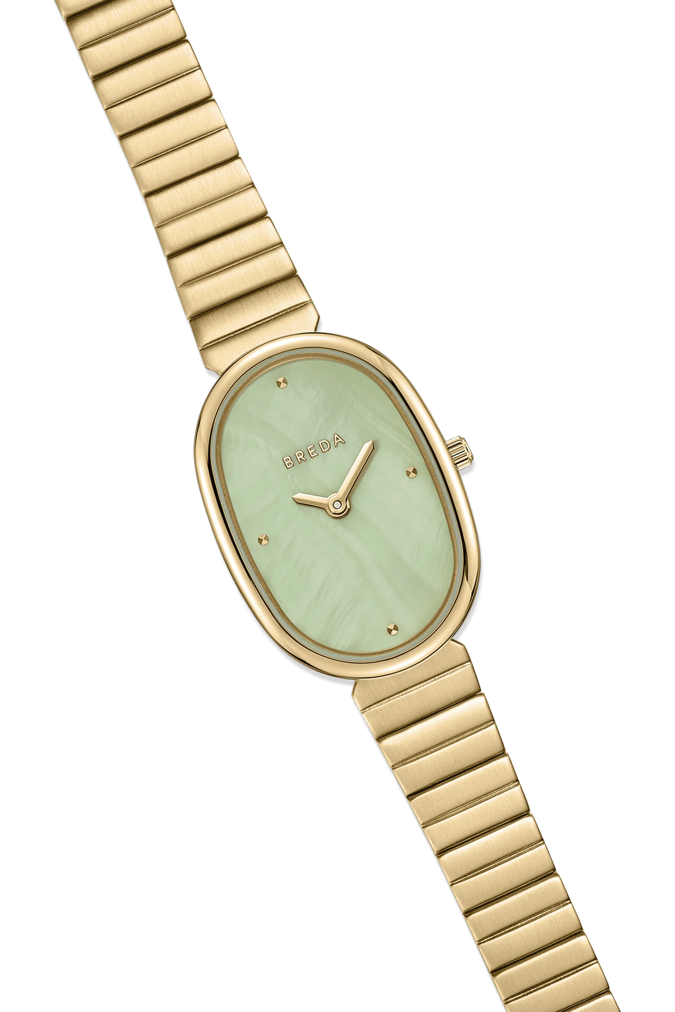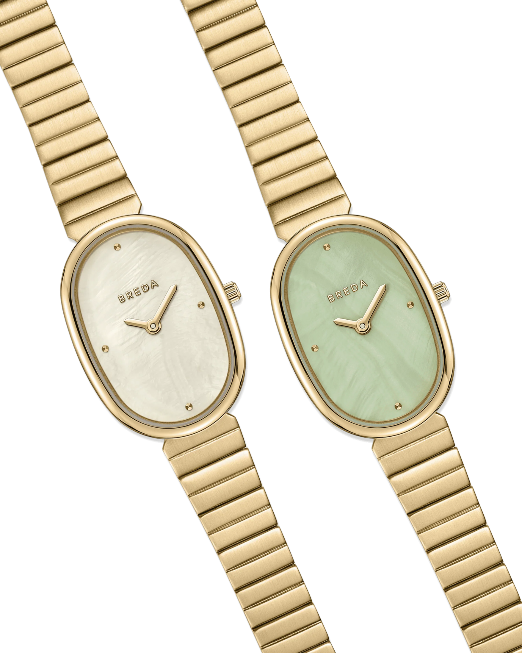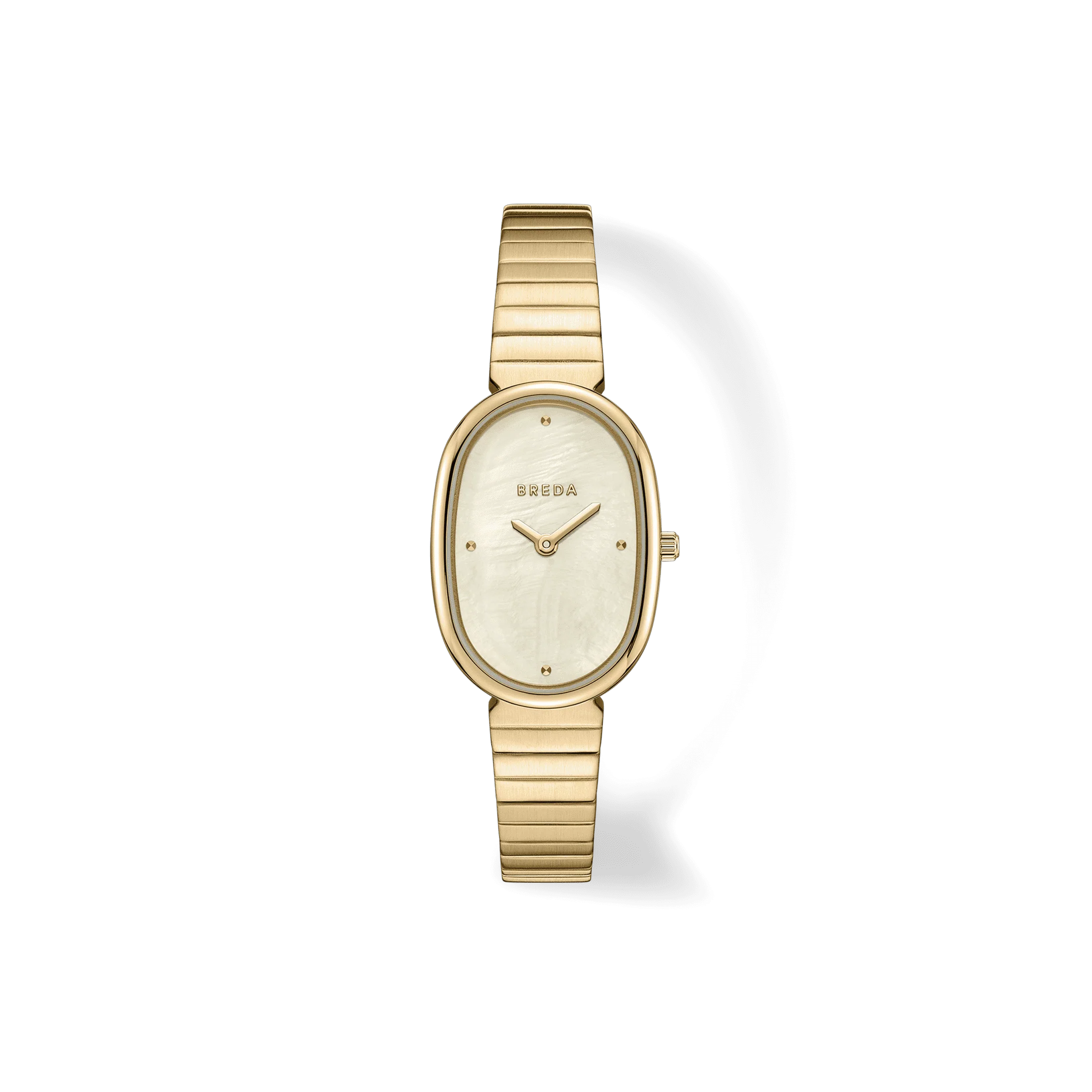 Inspired by sun-soaked days by the water and luxurious evenings, the Jane Watch embodies effortless elegance. This timepiece features a delicate 23mm oval case paired with a champagne-colored mother of pearl dial that catches the light beautifully. The gold-plated stainless steel bracelet fastens with a refined jewelry clasp, making it as much a statement piece as it is functional. A timeless classic that transitions seamlessly from day to night. Note: Mother of pearl is naturally unique—each dial features its own distinct texture variations, making your Jane truly one-of-a-kind.