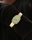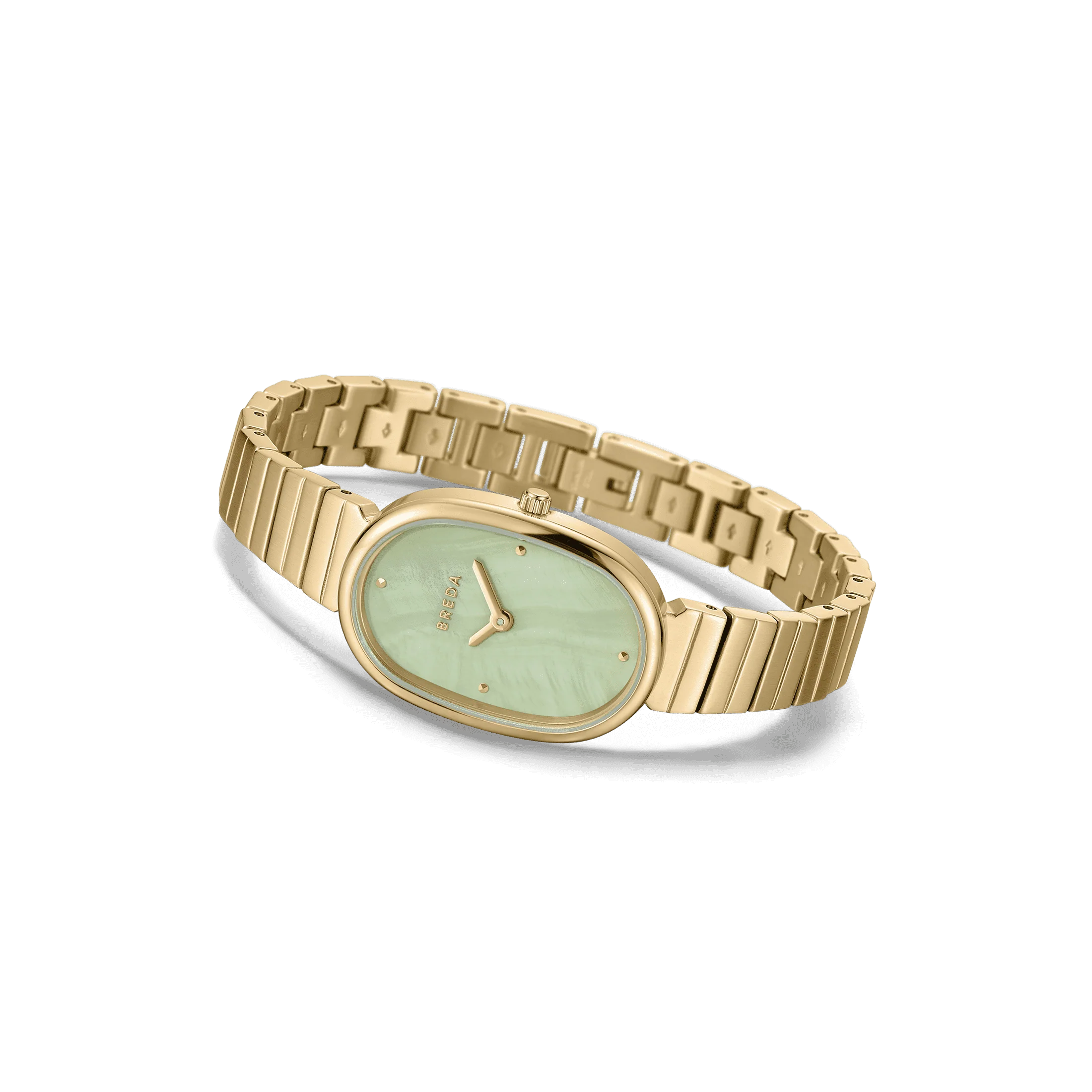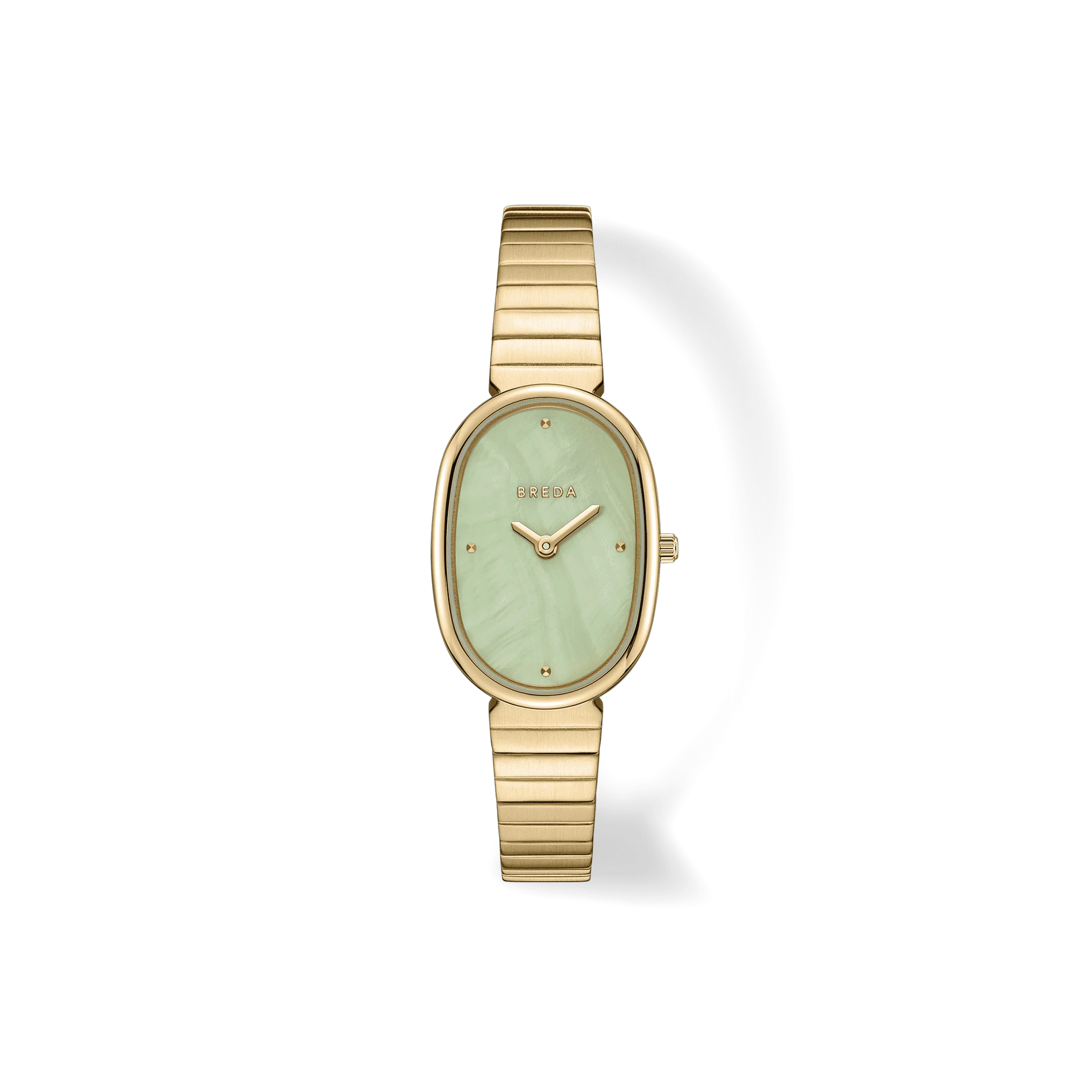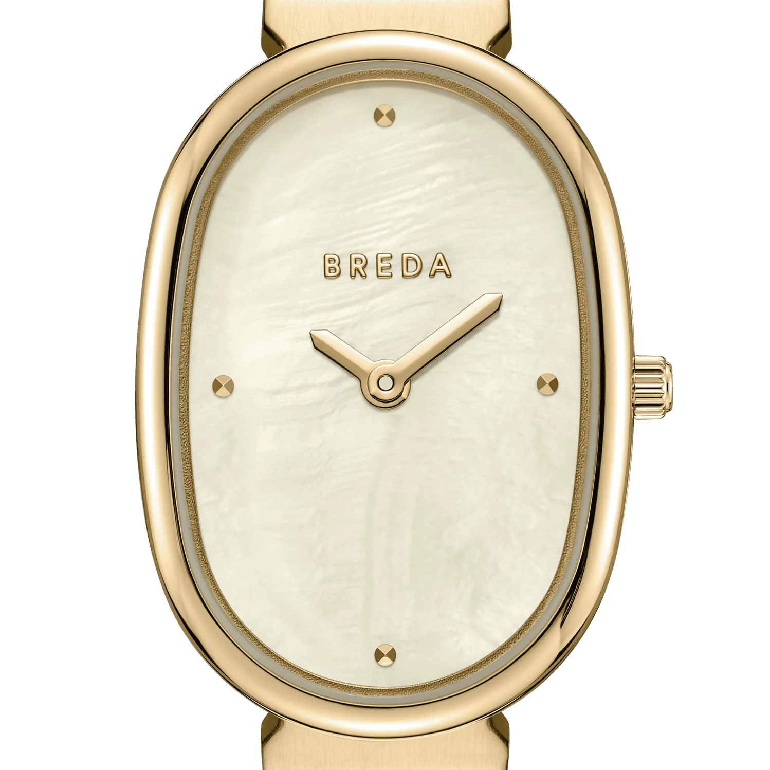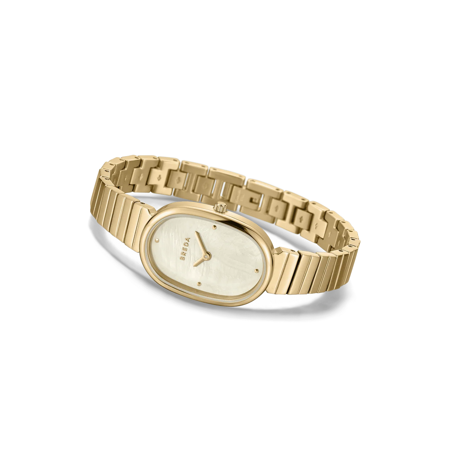 Inspired by sun-soaked days by the water and luxurious evenings, the Jane Watch embodies effortless elegance. This timepiece features a delicate 23mm oval case paired with a champagne-colored mother of pearl dial that catches the light beautifully. The gold-plated stainless steel bracelet fastens with a refined jewelry clasp, making it as much a statement piece as it is functional. A timeless classic that transitions seamlessly from day to night. Note: Mother of pearl is naturally unique—each dial features its own distinct texture variations, making your Jane truly one-of-a-kind.