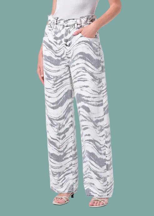 Looks Like: Black and white blurred wave zebra printed denim pant with cinched detailing at the waistband