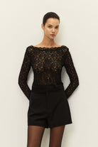 Stay chic in the Alma Lace Top with its boat neck and intricate black lace design. Made with a comfortable blend of 92% nylon and 8% spandex, this long sleeve top is perfect for any occasion. Elevate any outfit and feel confident in this must-have piece.