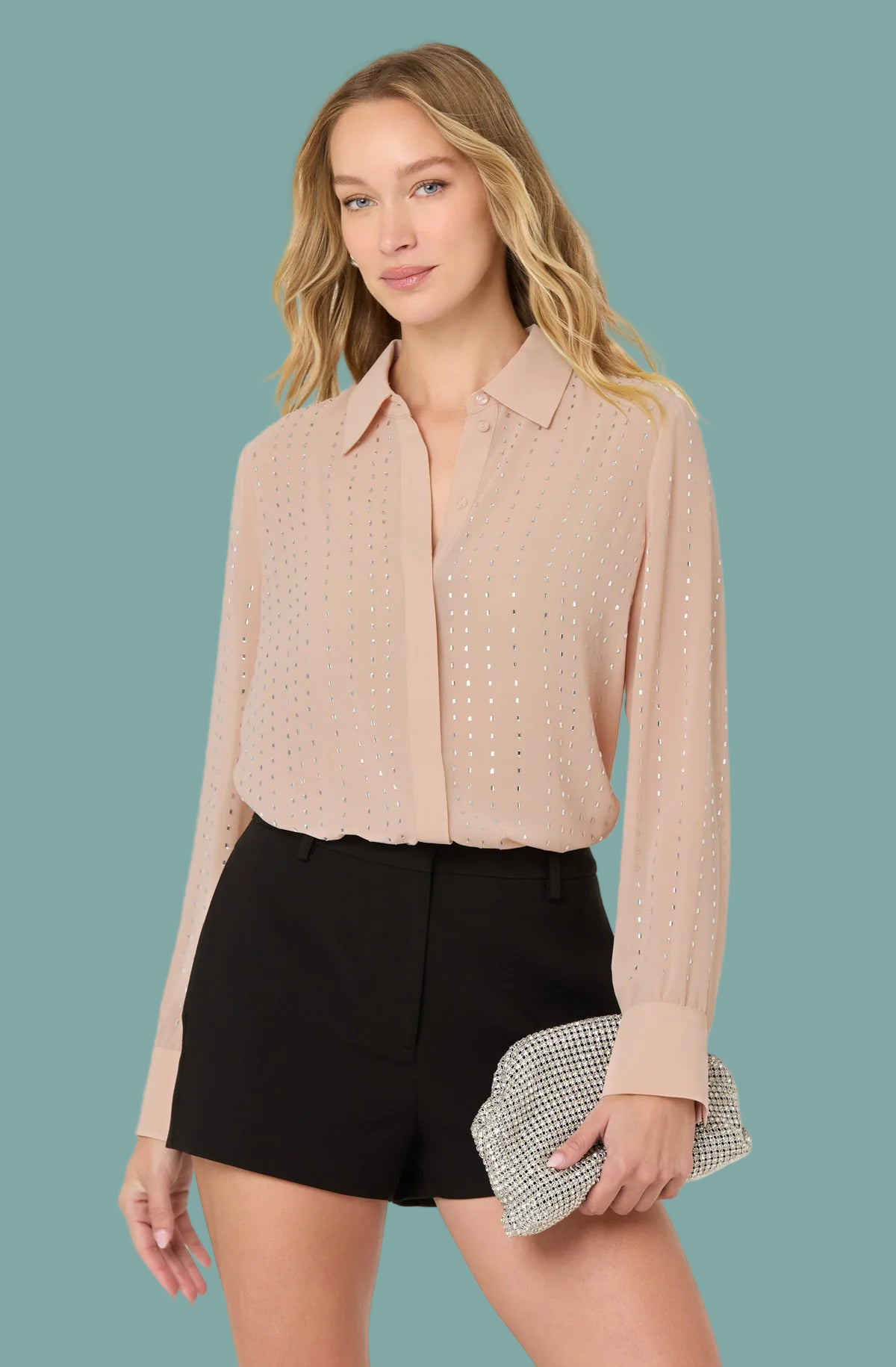 Crafted with a semi-sheer fabric covered in hot fixed rhinestones, this long sleeve button up top is perfect for layering under jackets, styling with denim for the office, or dressing up for date night.