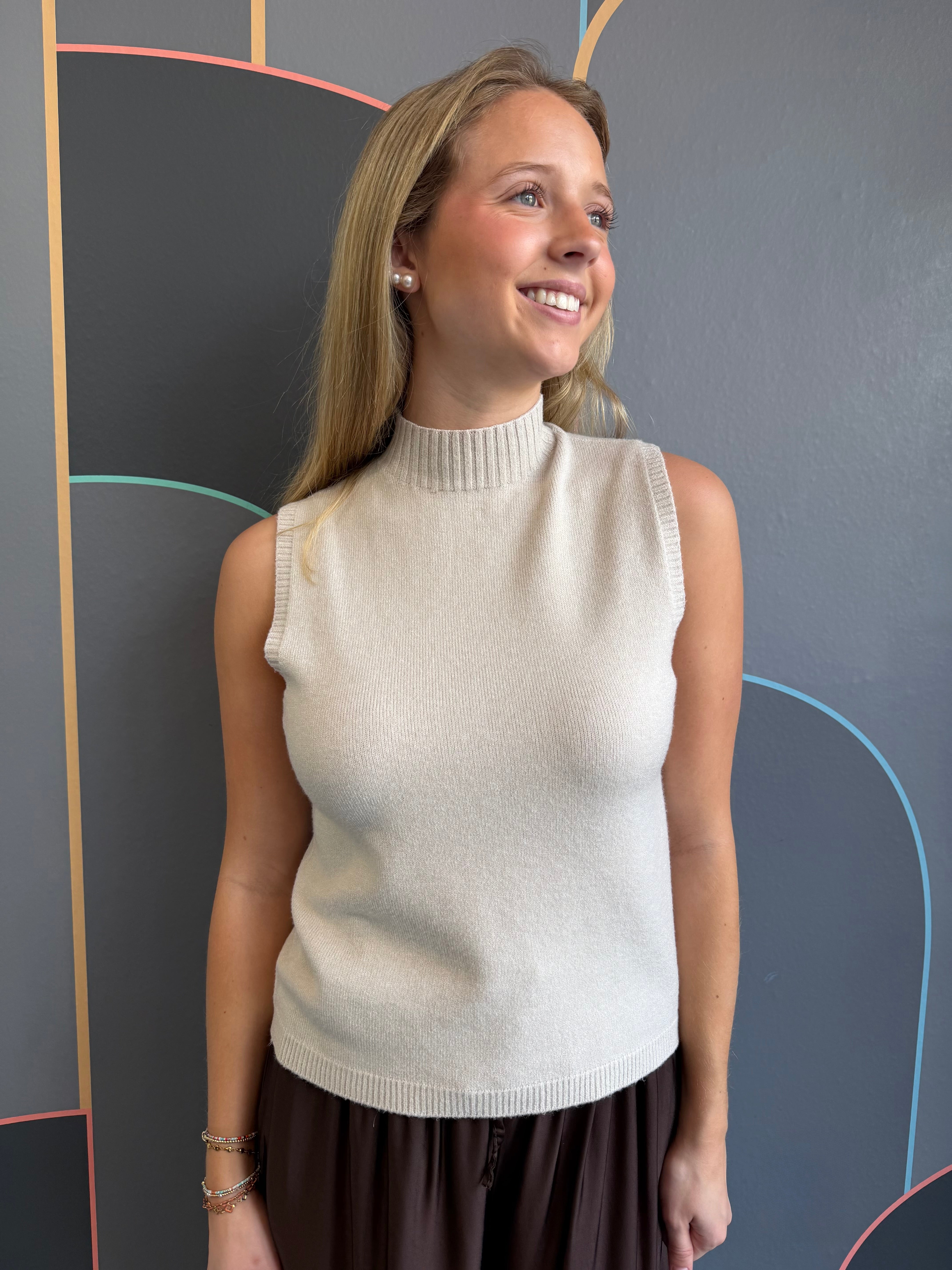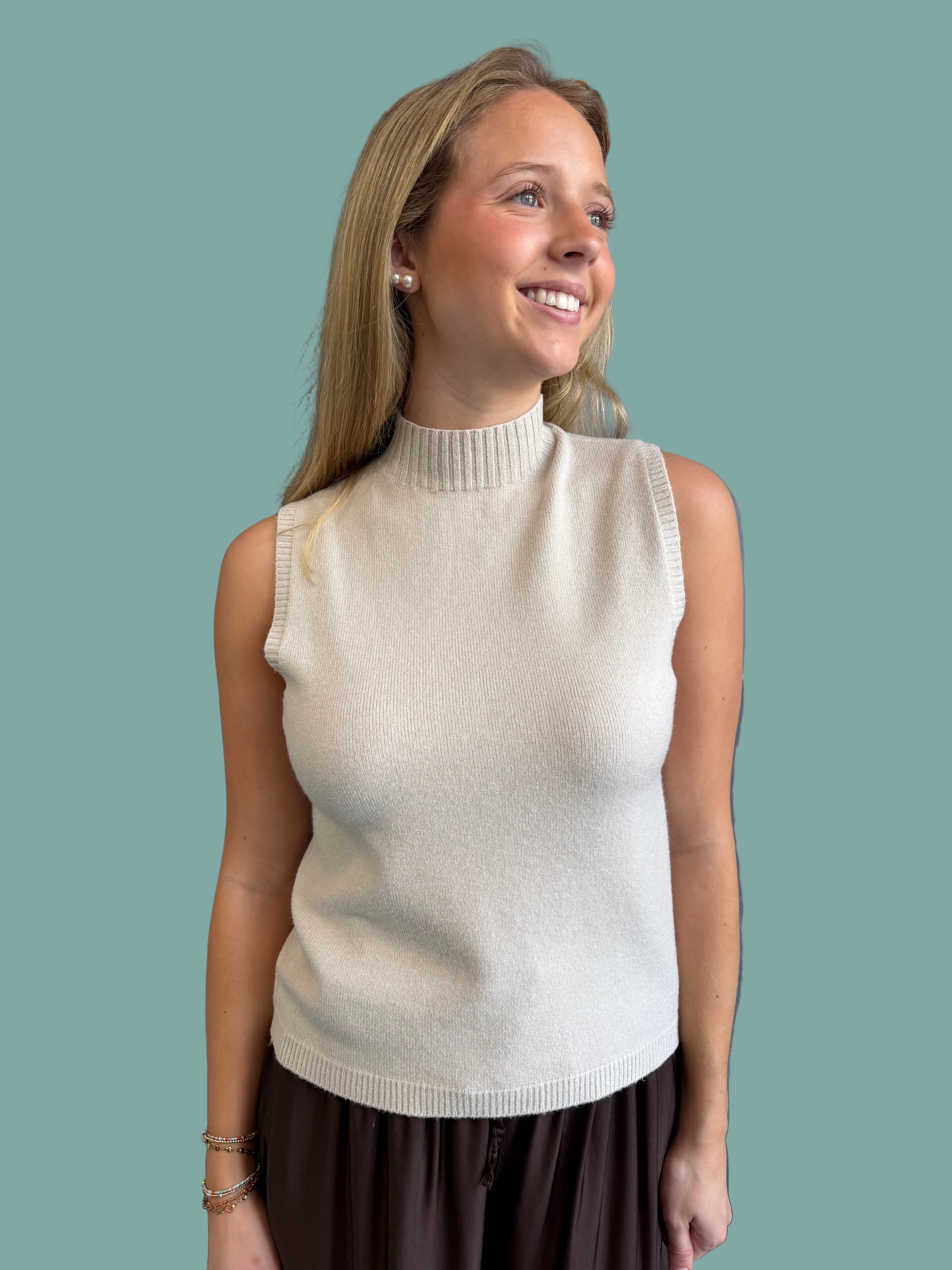 Effortless elegance meets everyday comfort in this Italian knit mock neck tank. Crafted from premium Italian knit fabric, this sleeveless essential features a chic mock neck silhouette that works beautifully layered or worn solo. The timeless beige hue pairs seamlessly with any wardrobe, making it a versatile staple for transitional dressing. Perfect for creating polished looks that feel relaxed and put-together.