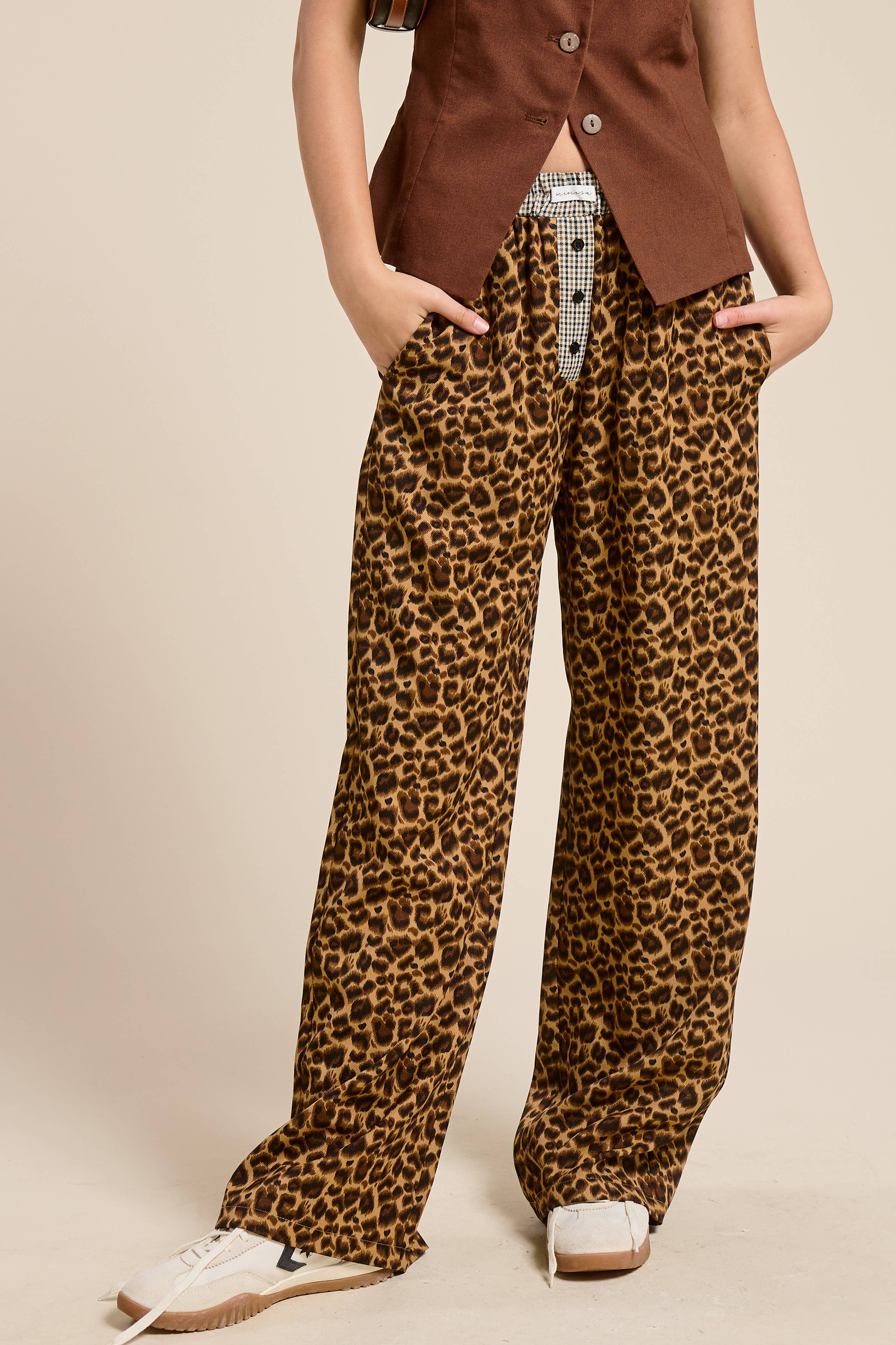 These relaxed fit pants feature an allover leopard print on a soft, wrinkle-resistant woven fabric. Designed with a mid to low rise, they include an elastic waistband with contrast plaid detail, decorative button placket, and side pockets. The wide-leg silhouette adds a laid-back feel - perfect for loungewear, cozy layering, or casual streetwear looks from fall into spring.