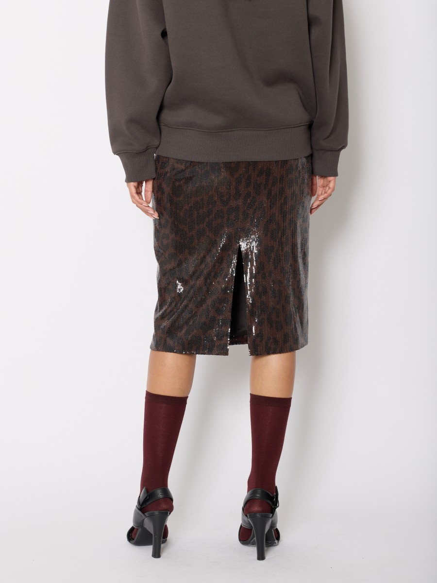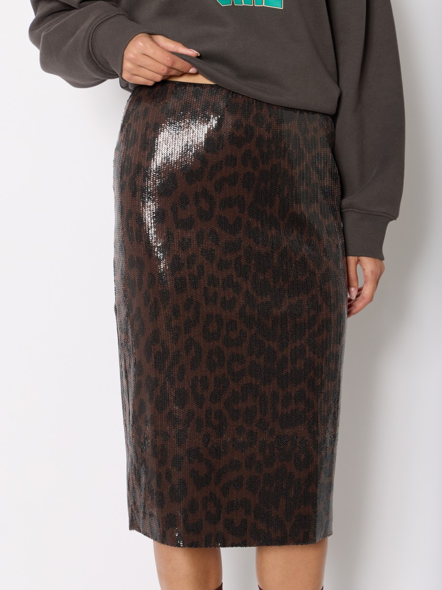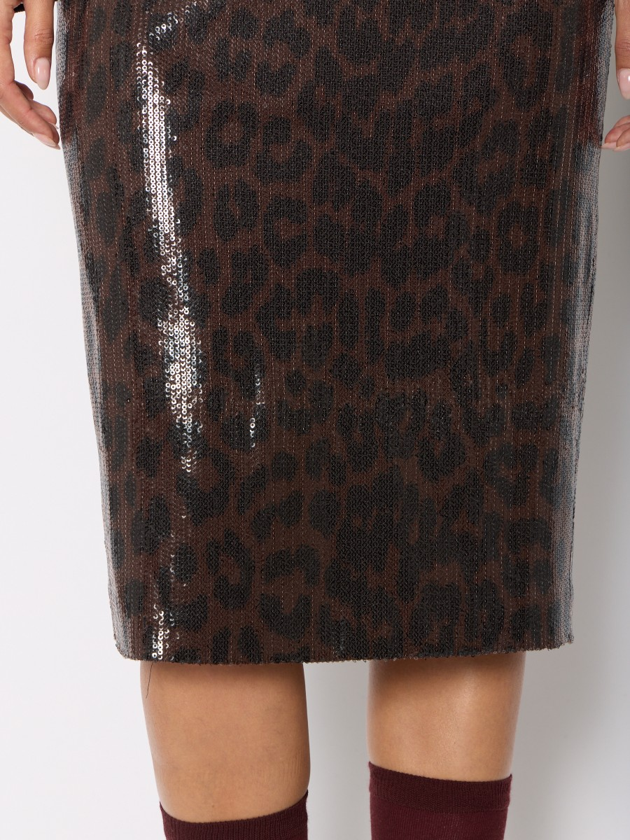 The Leopard Sequin Midi Skirt combines a fluid, feminine silhouette with a bold leopard print and sparkling sequins for a touch of glam. Its flowy design moves gracefully with you, making it the perfect piece to add shine and style to your evening looks.