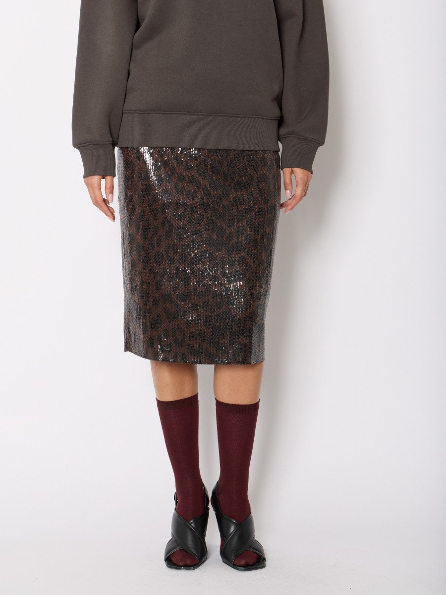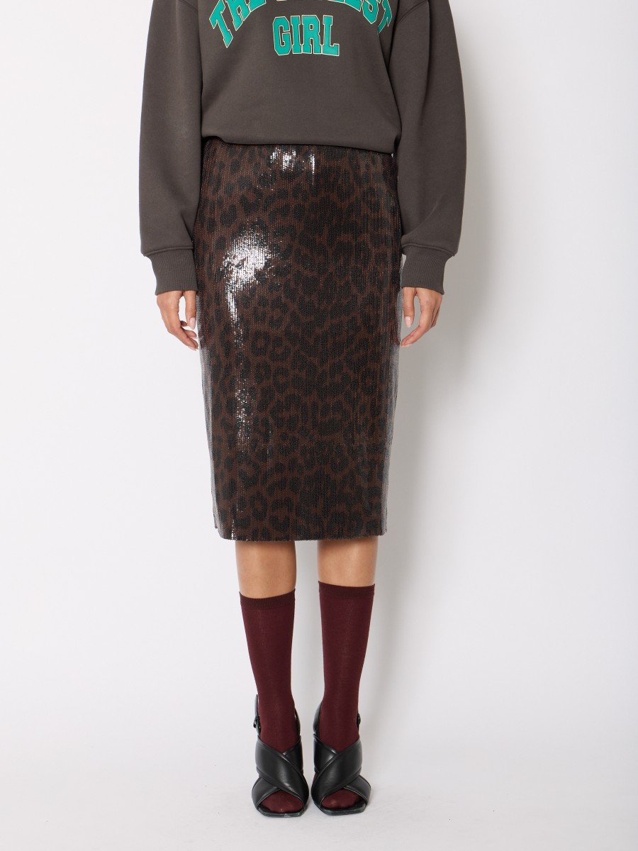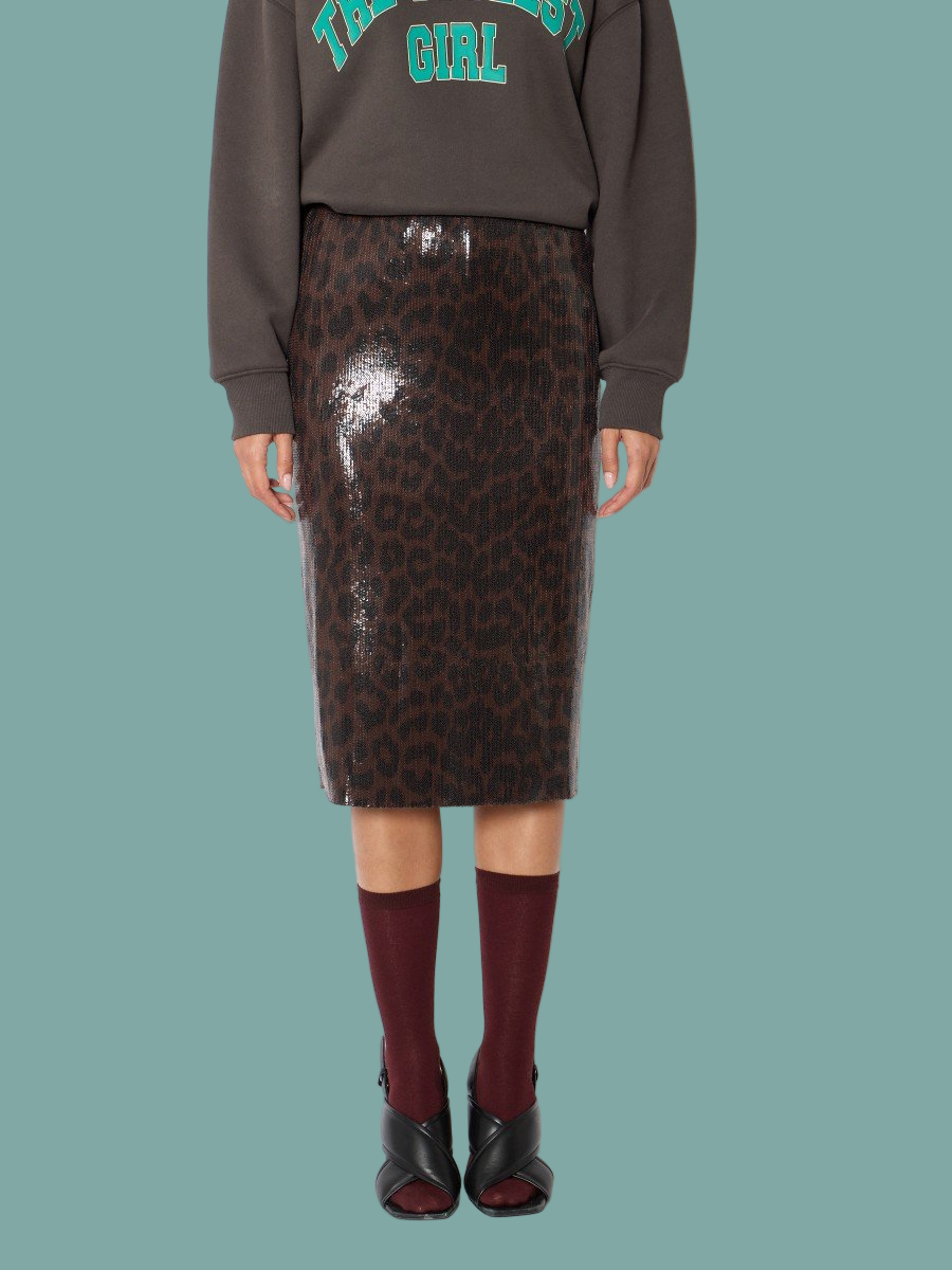 The Leopard Sequin Midi Skirt combines a fluid, feminine silhouette with a bold leopard print and sparkling sequins for a touch of glam. Its flowy design moves gracefully with you, making it the perfect piece to add shine and style to your evening looks.