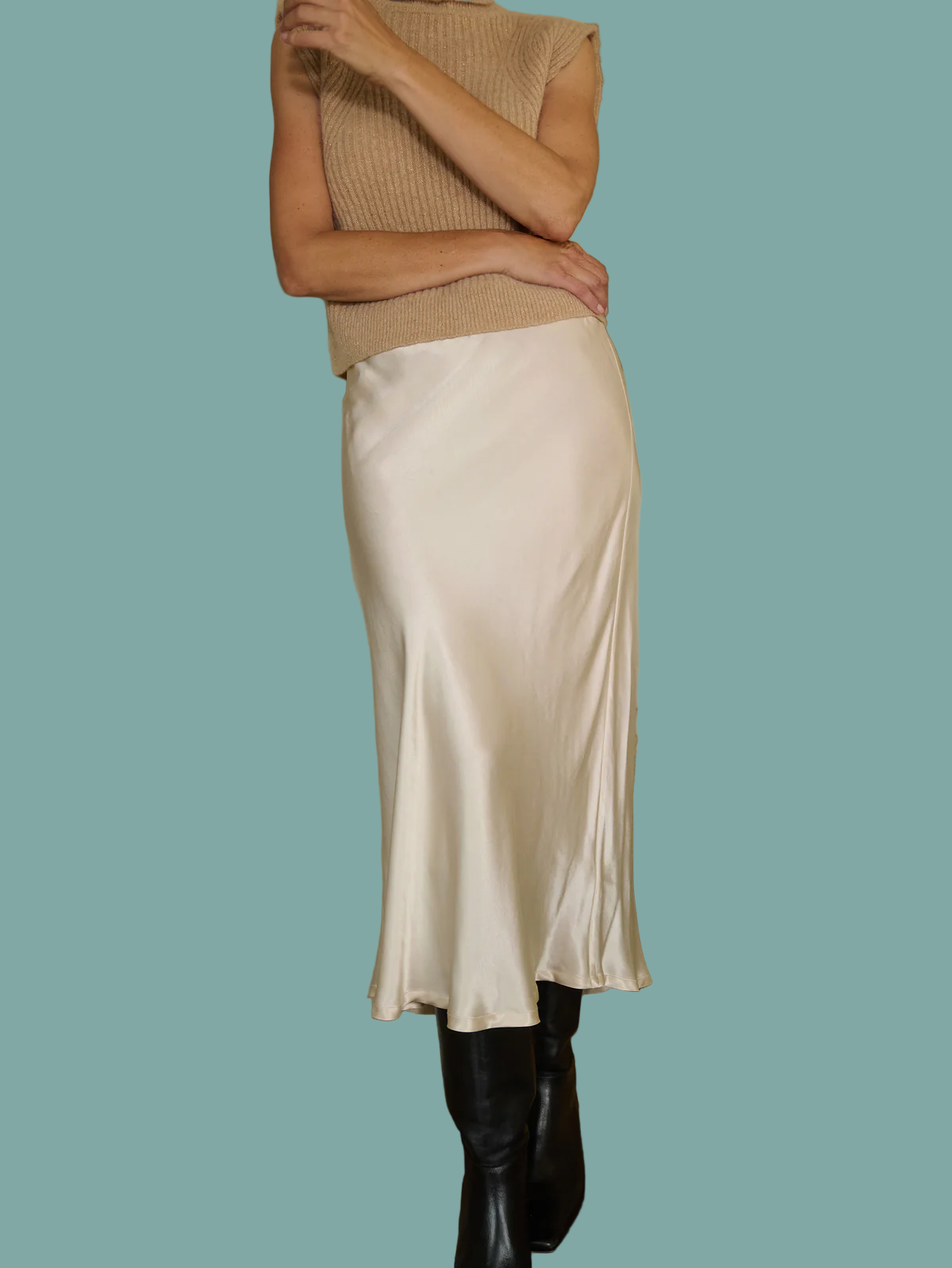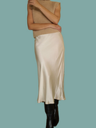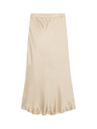 The Mabel Bia Skirt delivers effortless elegance with its bias-cut design that creates a flattering, streamlined silhouette. Crafted in luxurious Hammered Satin, this midi-length piece features a raw hem for an on-trend, relaxed vibe and an elastic waist for all-day comfort. Available in a soft Moonbeam shade that pairs with everything in your wardrobe.