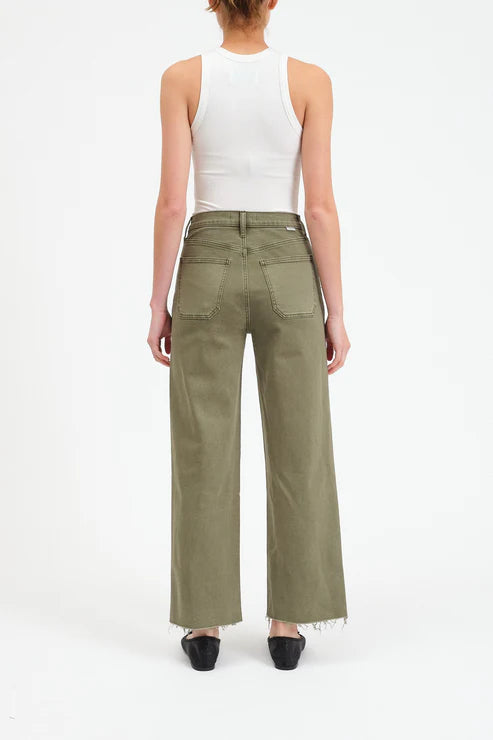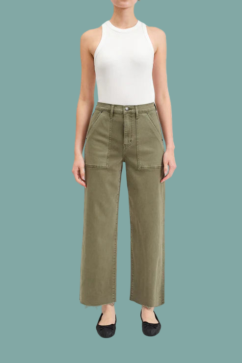 The Pleaser in Jade is our ultra-flattering high rise wide ankle in a rich green wash. Patch pockets and raw hems give this pair a utility-inspired look.