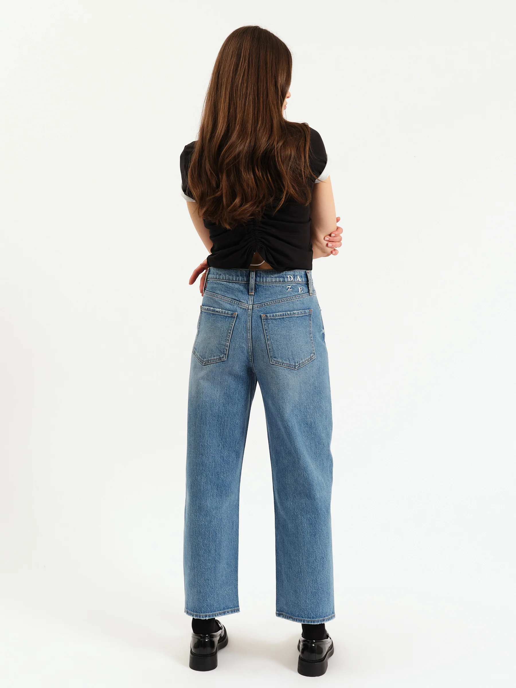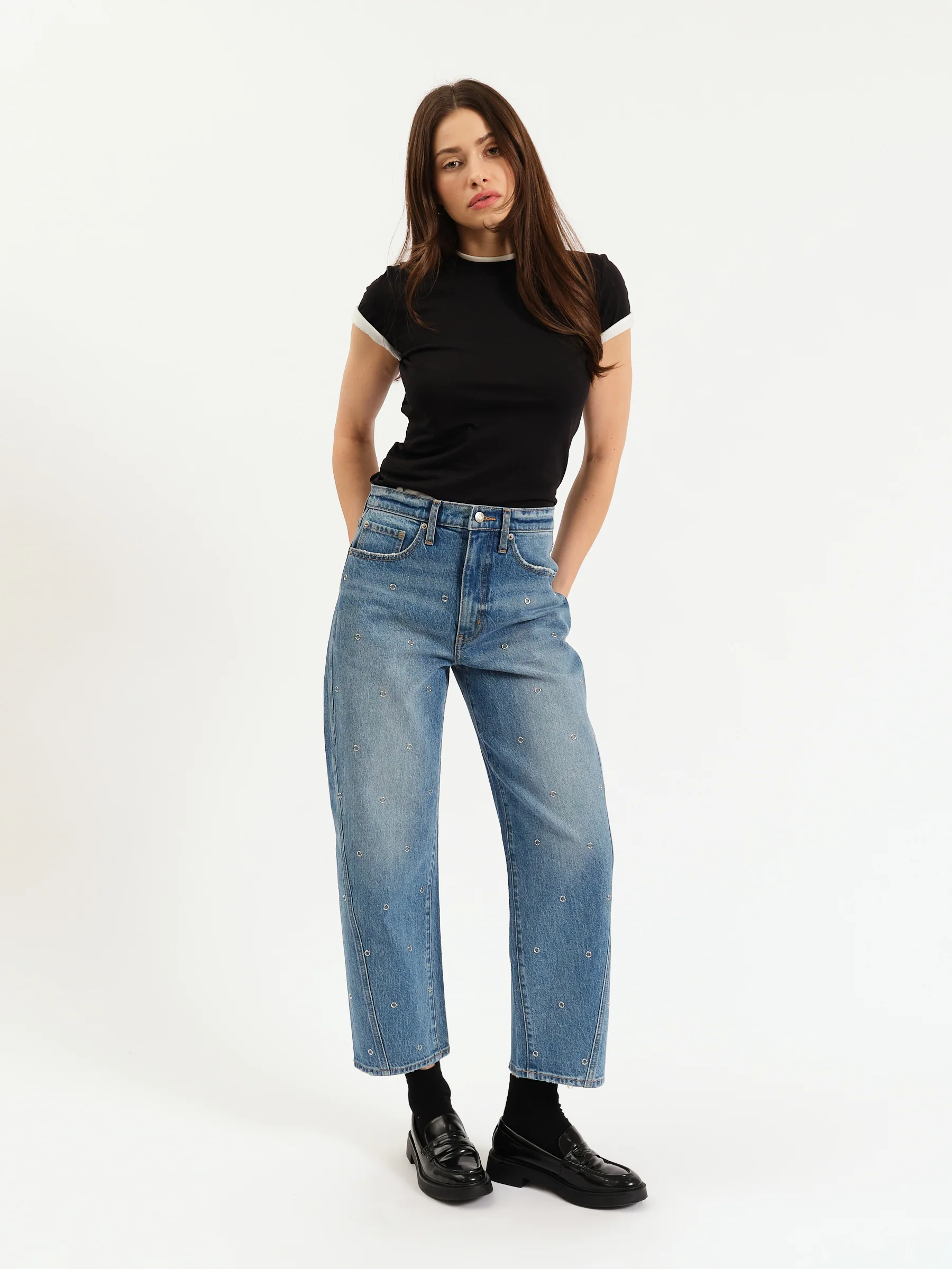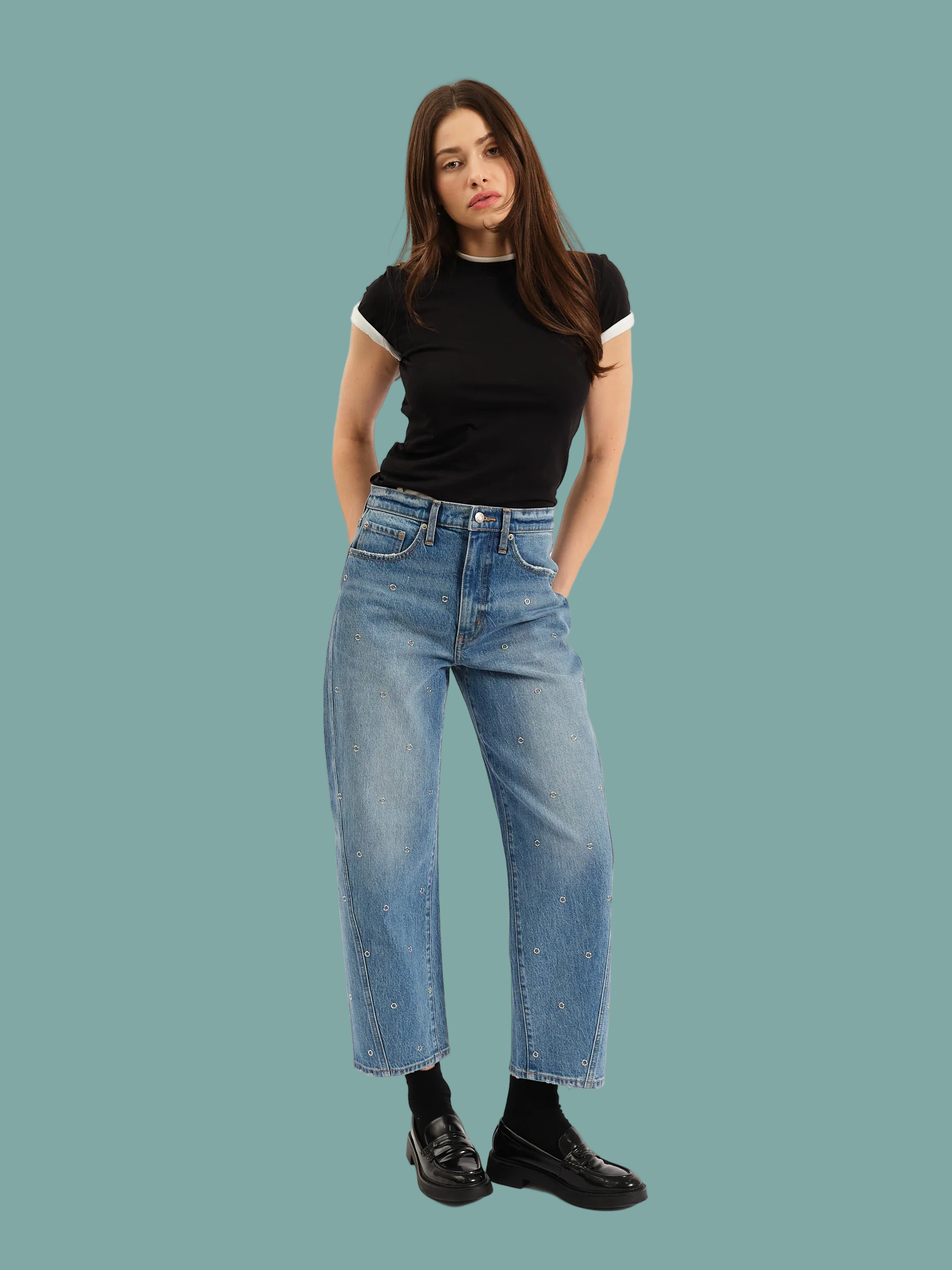 Meet the Westward High Rise Barrel Leg—a jean that commands attention with its bold silhouette and thoughtful construction. This authentic style features a striking 11¾" rise paired with a barrel leg that bows at the thigh before tapering at the ankle, creating an effortlessly cool vibe. Grommet detailing adds edge against the medium wash, while the cinched waist keeps everything in place. Built from our Tough Love fabric—99% cotton with just enough stretch—these jeans start structured but mold to your body exactly where it matters. Durable, comfortable, and undeniably stylish.