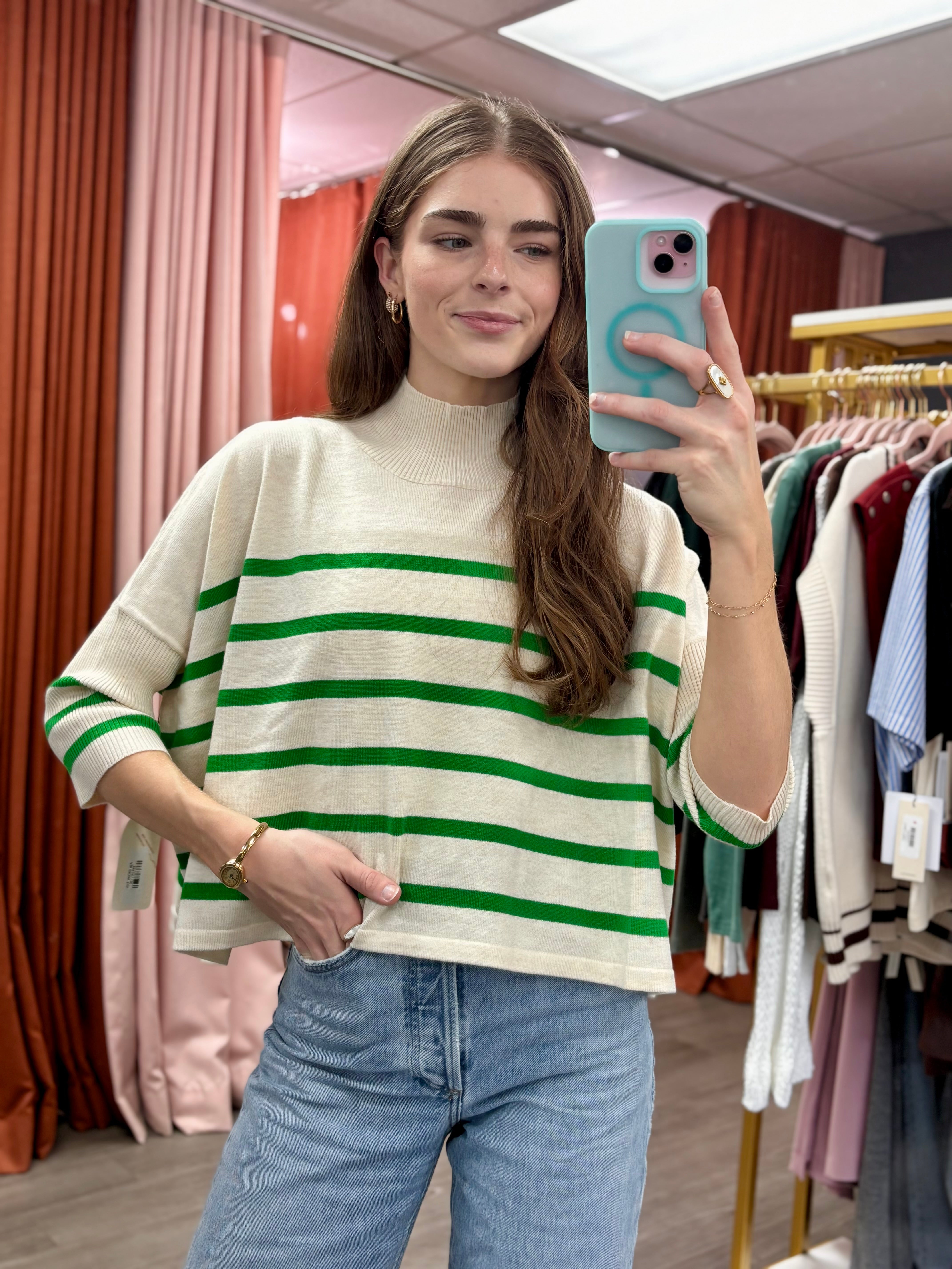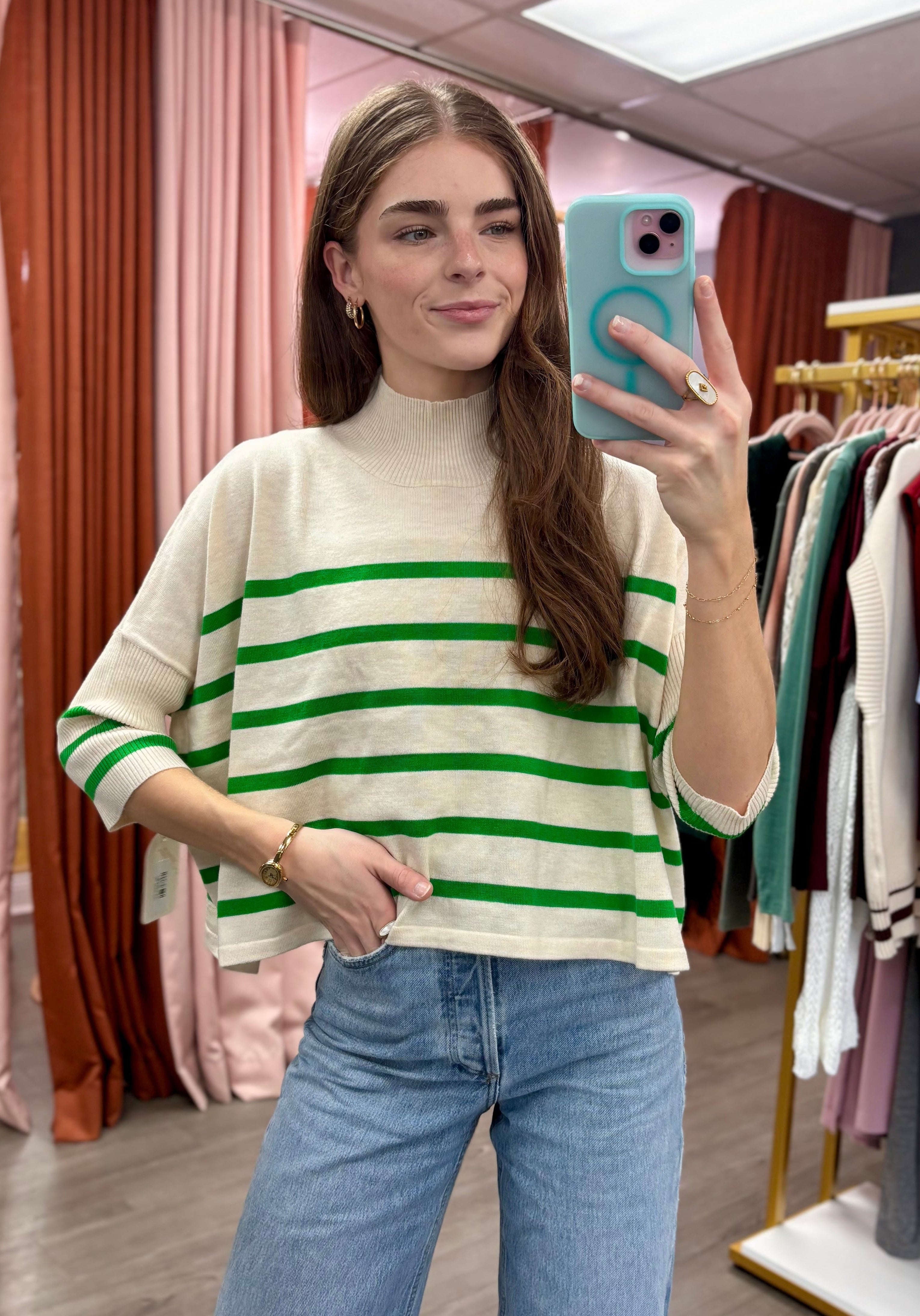 The Aja Stripe Top brings effortless style to your everyday rotation. This knitted sweater features a timeless ivory and green striped pattern that pairs easily with your favorite bottoms. The thoughtful blend of materials—including wool, nylon, acrylic, polyester, and spandex—creates a comfortable, durable piece that moves with you. Perfect for layering or wearing solo, it's a versatile staple that works across seasons.