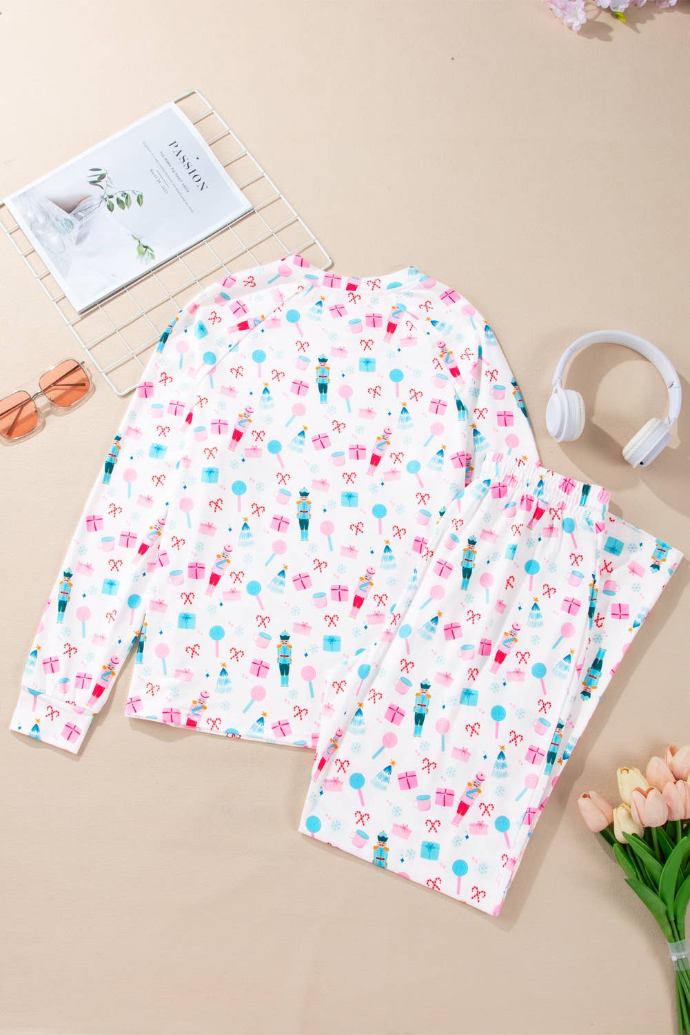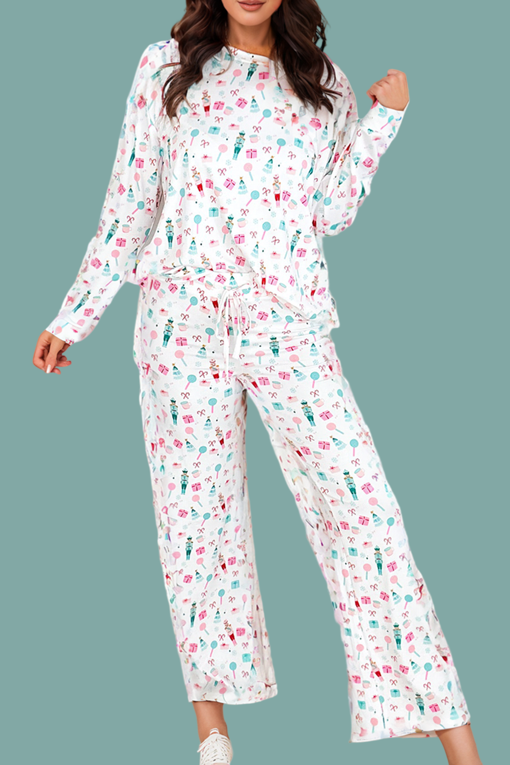 Get cozy this holiday season with our Jolly Nutcracker Pants Set, featuring a festive nutcracker and candy cane print perfect for spreading seasonal cheer. This matching set includes a comfortable long sleeve top and drawstring pants, ideal for lounging at home, holiday gatherings, or gift-giving. The relaxed fit and soft fabric make it your go-to choice for staying warm and stylish throughout the winter months. Embrace the holiday spirit in comfort and fun.