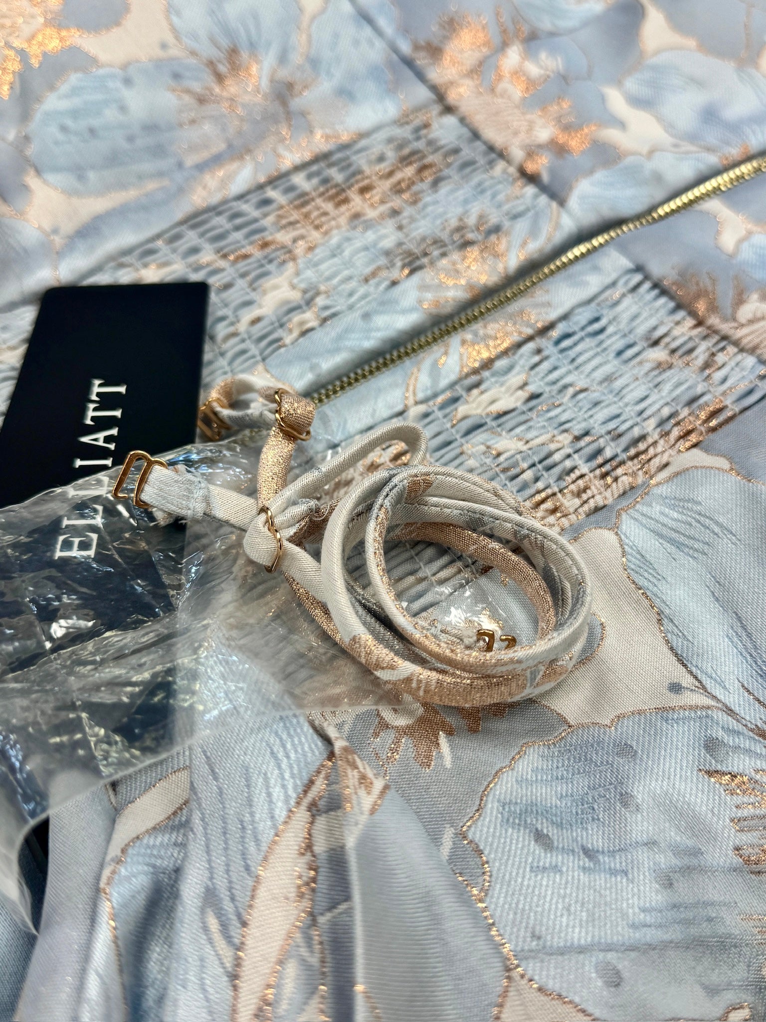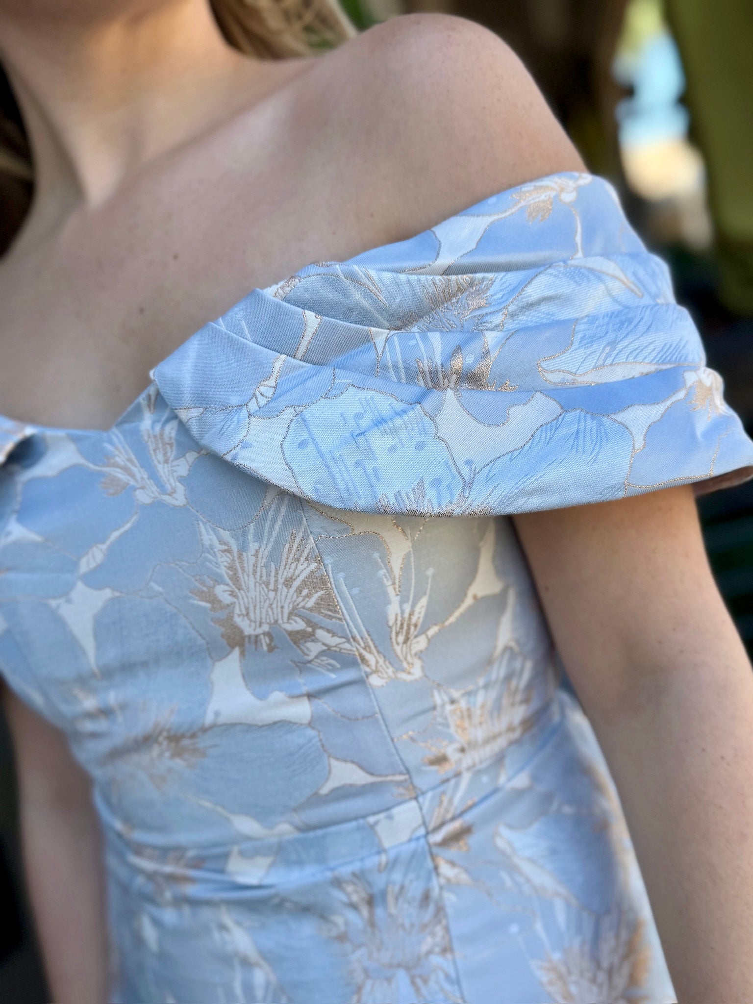 The Fiorella Mini Dress features a charming off-the-shoulder design with a fresh blue floral pattern set against a crisp white background. Delicate gold detailing adds a subtle touch of elegance, making it perfect for casual outings or summer gatherings. Its mini length keeps the look playful and light, ideal for warm days when you want to feel both comfortable and stylish.