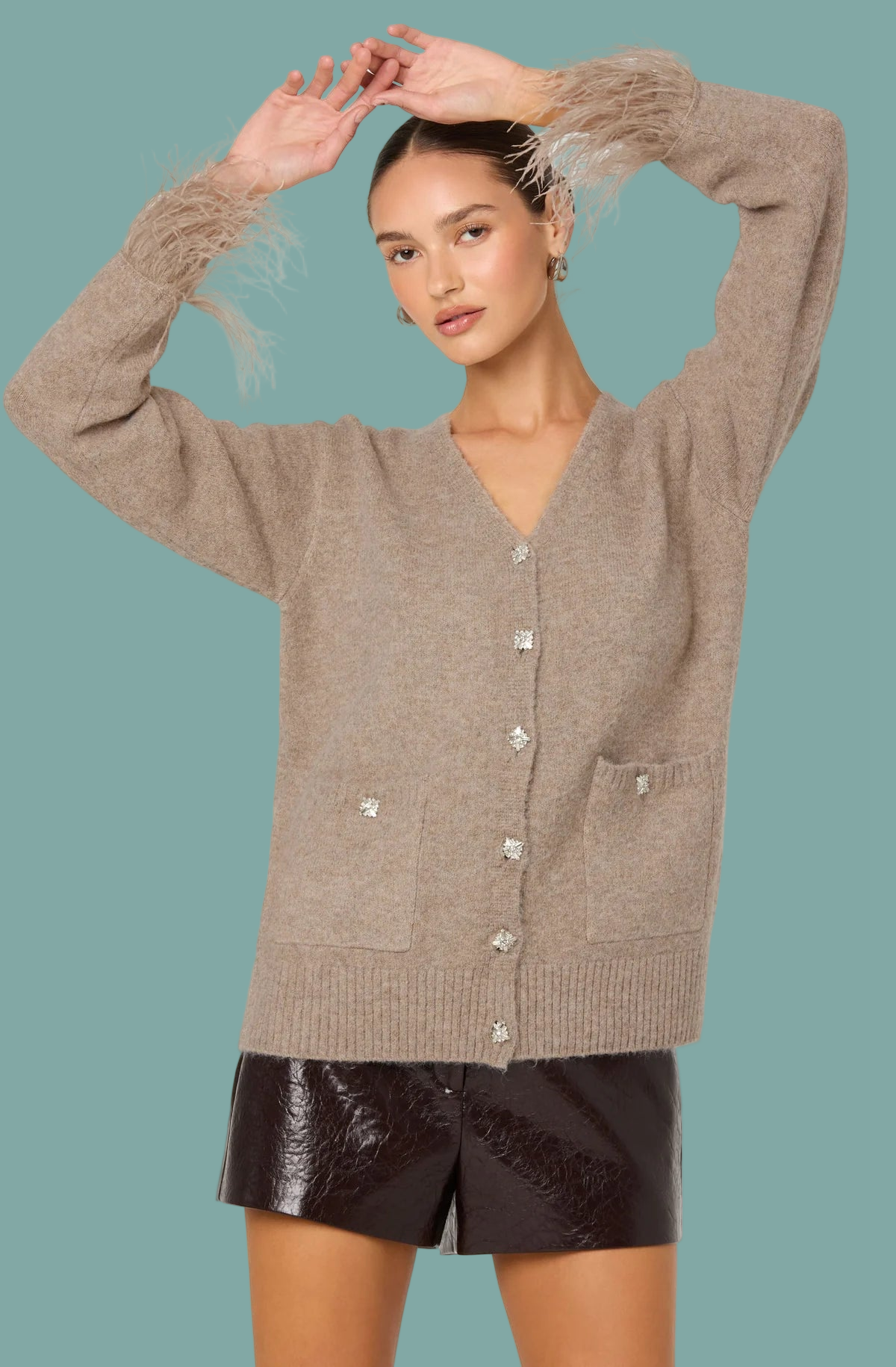 Sweet meets sophisticated in this rhinestone embellished sweater - a charming cardigan with feather trimmed sleeves. Perfect for brunch dates, office chic or cozy weekends with a stylish twist.
