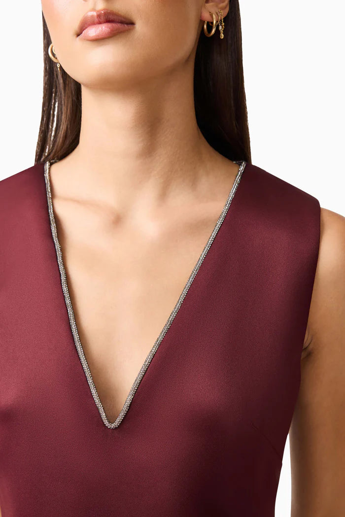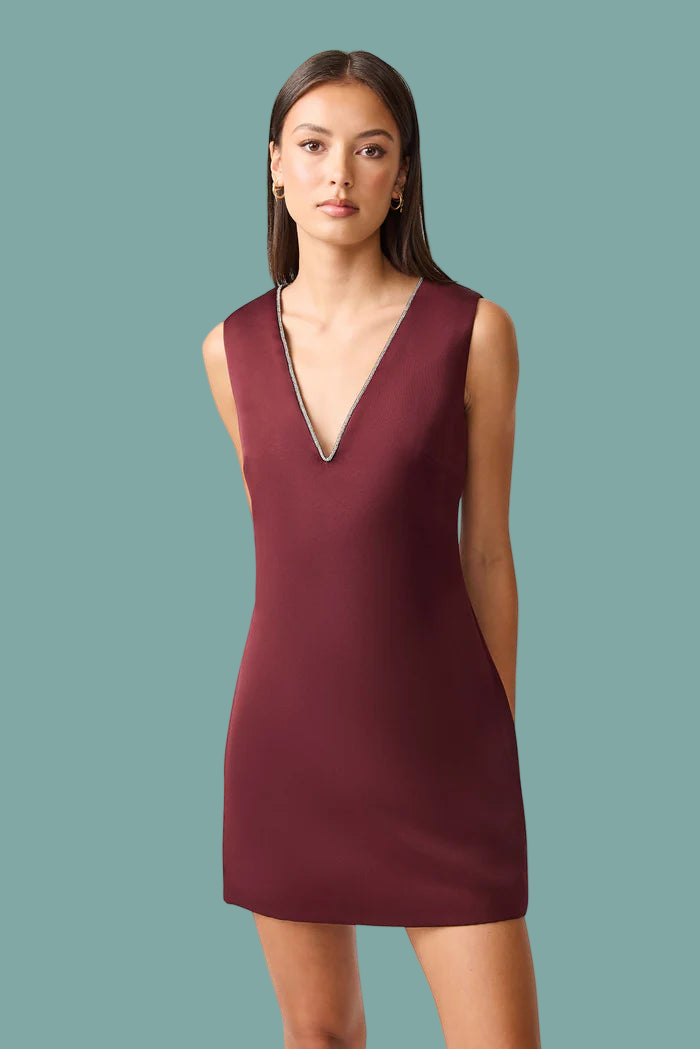 Make a statement in the Livia Shift Mini Dress in Burgundy – an elevated mini silhouette designed to turn heads. Crafted from structured duchess satin, this piece offers a luminous finish and refined feel, perfect for evenings or cocktail occasions. The V-shaped neckline is accented with a delicate rhinestone trim, adding just the right amount of sparkle while framing the décolletage beautifully.