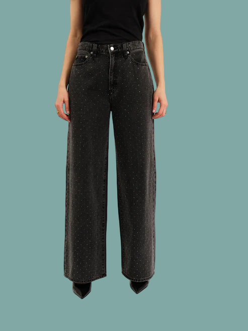 These mid-rise palazzo jeans bring party-ready sparkle to your everyday wardrobe with festive studs scattered throughout the relaxed, wide-leg silhouette. In classic black with just enough shimmer, they're the perfect balance of comfortable and eye-catching—because who says you can't sparkle on a Tuesday?