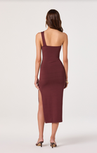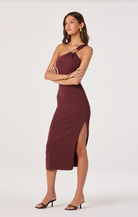 Elevate your wardrobe with the Ania Dress, a sophisticated one-shoulder silhouette in rich brown. This fitted design features a luxe gold hardware accent complemented by intricate turquoise and brown beadwork that adorns the end of the gold embellishment. Perfect for cocktail events or upscale occasions, the Ania combines modern asymmetrical styling with artisanal details for a truly standout look.