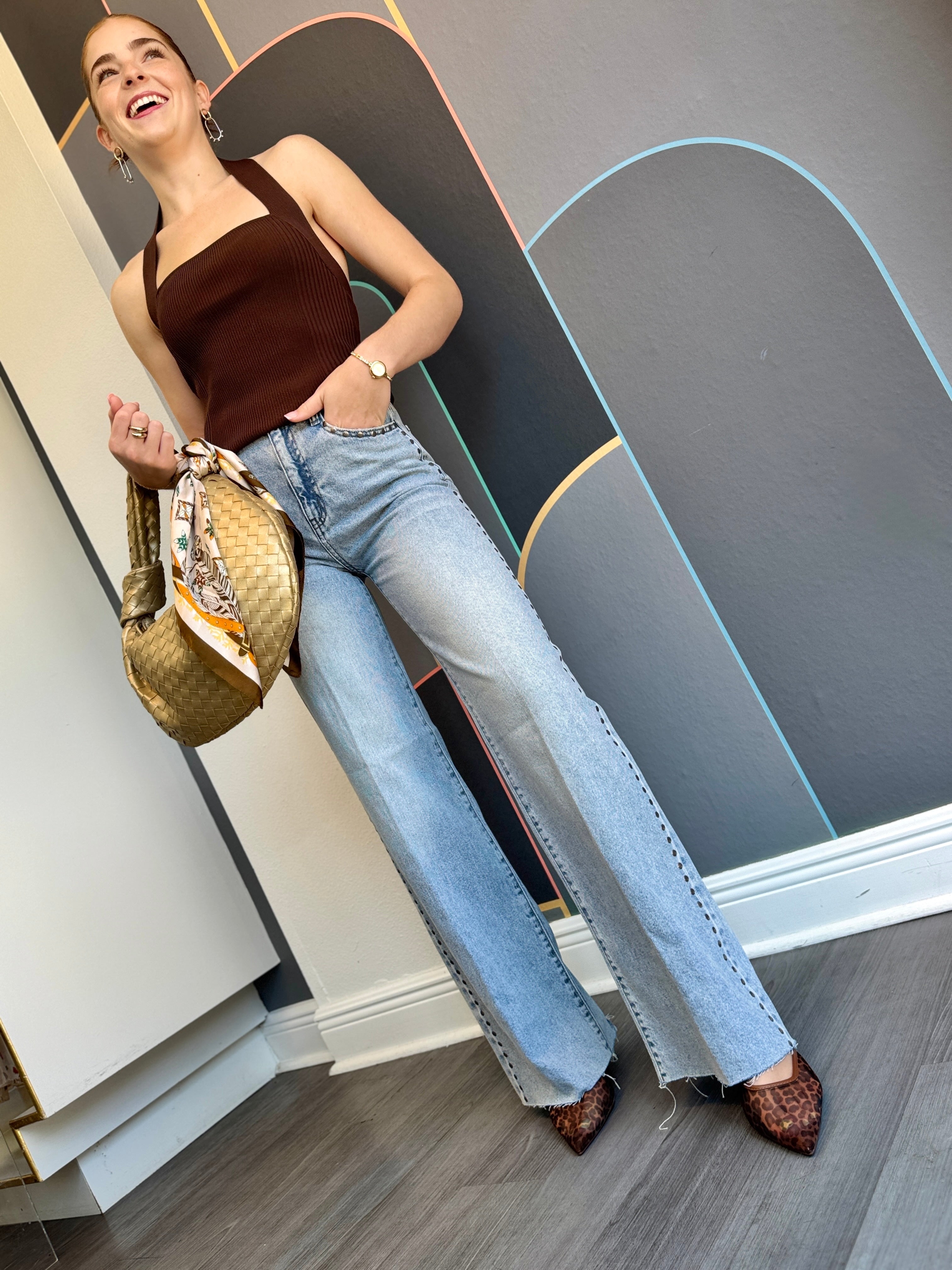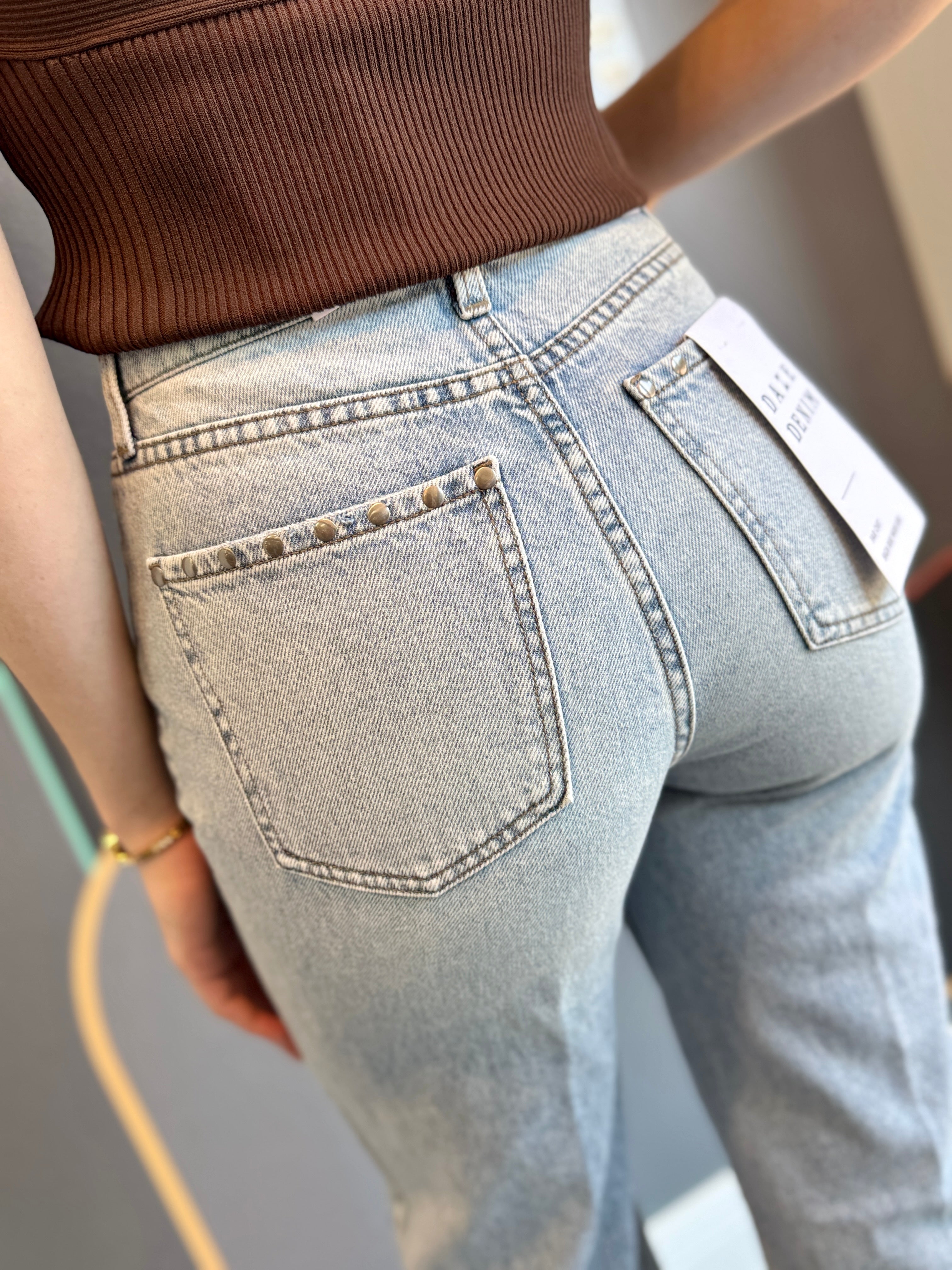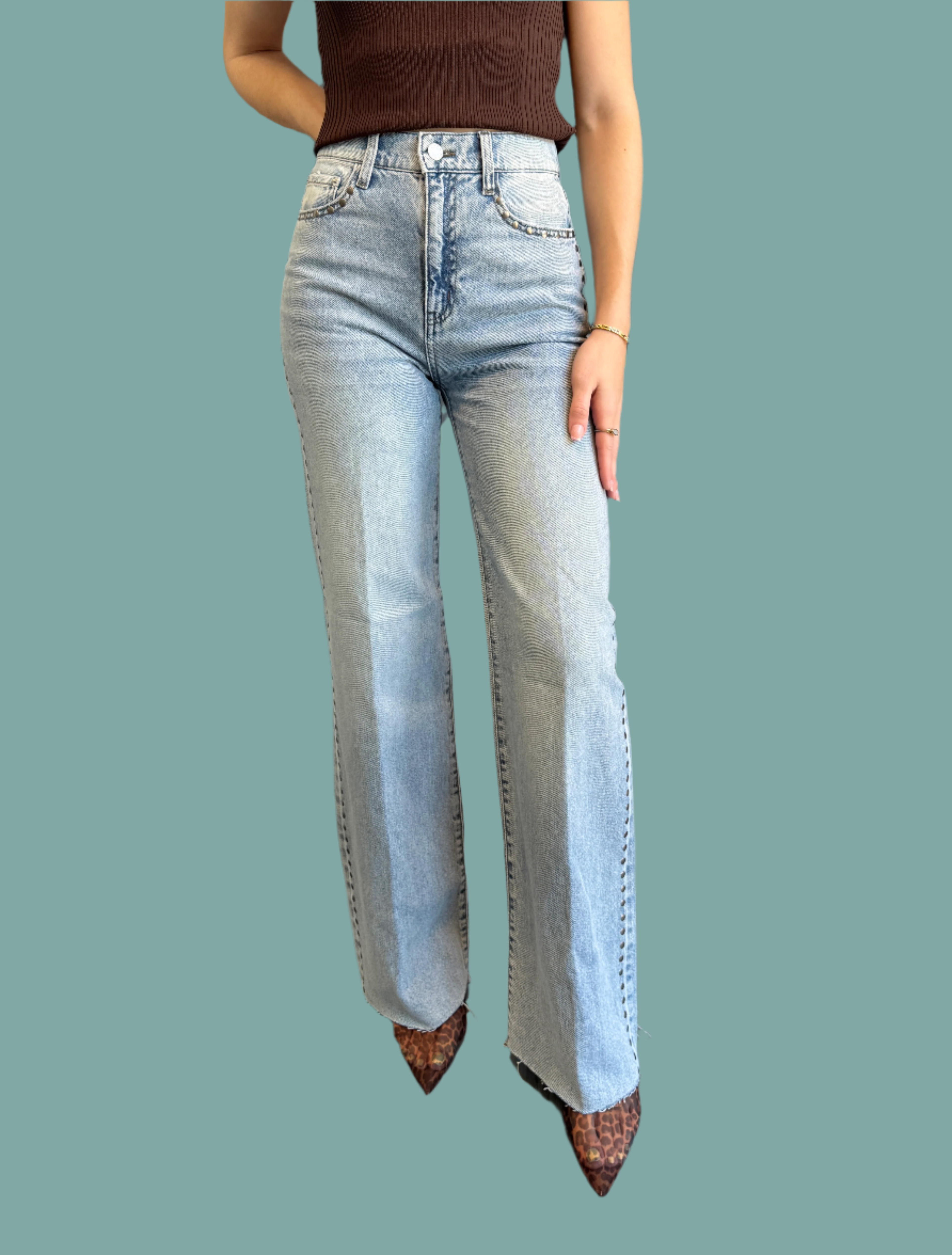 Step into the spotlight with these light wash wide leg jeans featuring a playful raw hem and sparkling studs lining both outside seams. The high-rise fit flatters your silhouette while adding a fun, retro vibe to your look. Perfect for dancing through the day or night, these jeans bring effortless style and a touch of sparkle to every move.