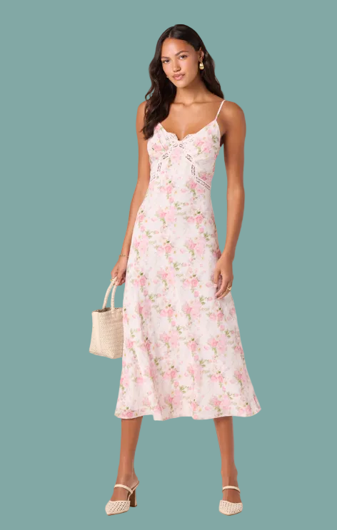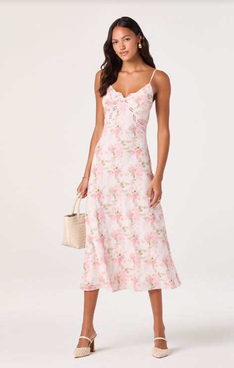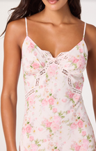 Elevate your wardrobe with the Liran Dress, a stunning pink floral midi that combines romantic elegance with modern sophistication. Delicate strappy details frame the shoulders while intricate lace trim adorns a chic cutout neckline, creating an eye-catching focal point. The flowing midi length offers versatile styling for garden parties, weddings, or special occasions. Soft florals and refined lace detailing make this dress a timeless piece that transitions beautifully from day to evening wear.