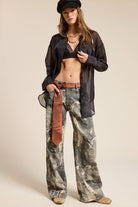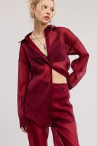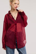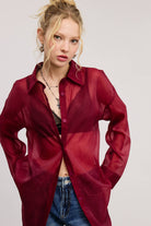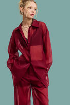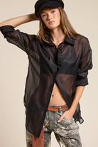 This oversized button-down shirt features a collared design and is crafted from sheer organza fabric. It offers a fully transparent look with a shirttail hem, while the solid contrasting collar and sleeve cuffs bring a stylish, laid-back edge.