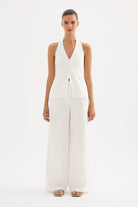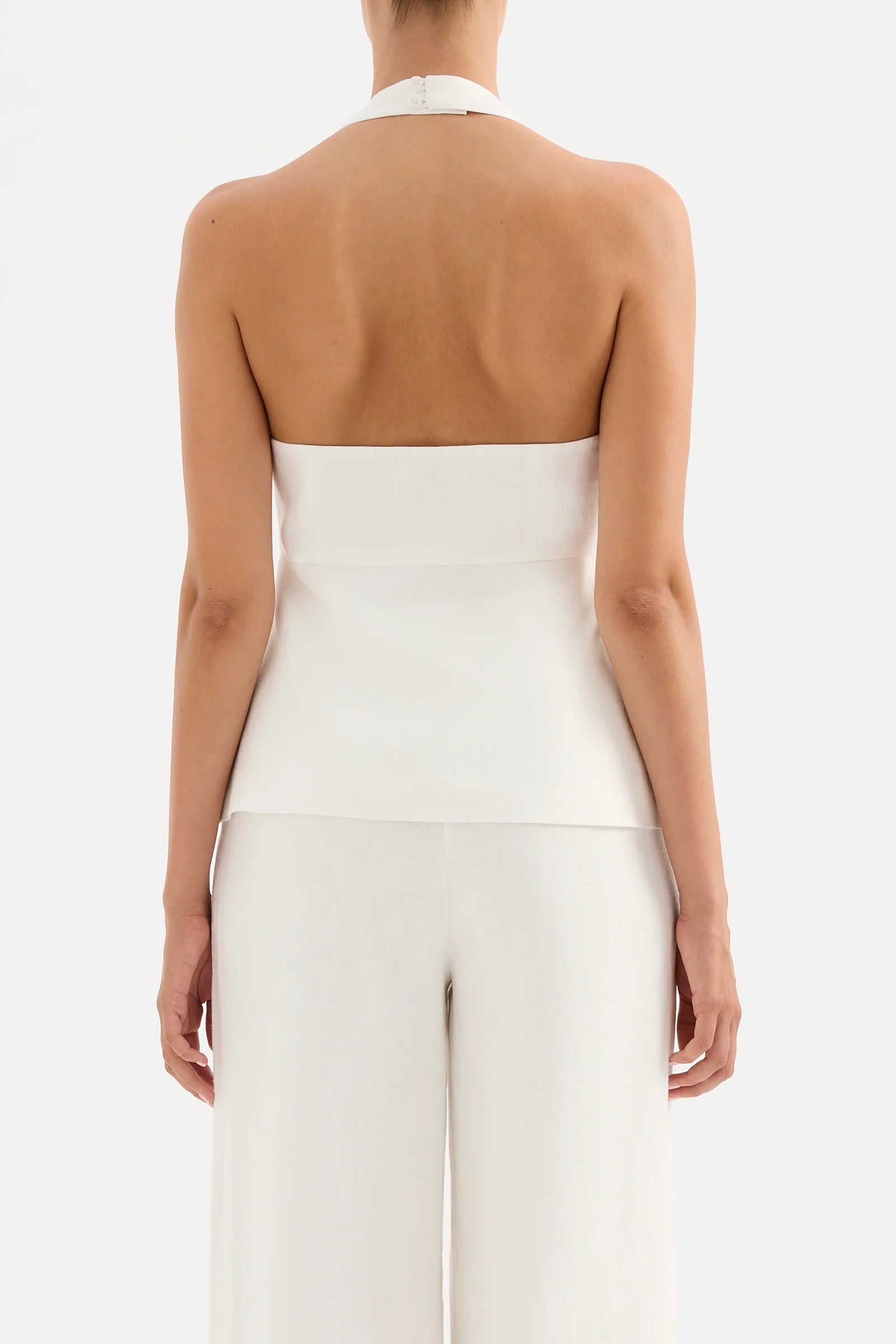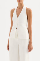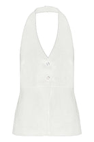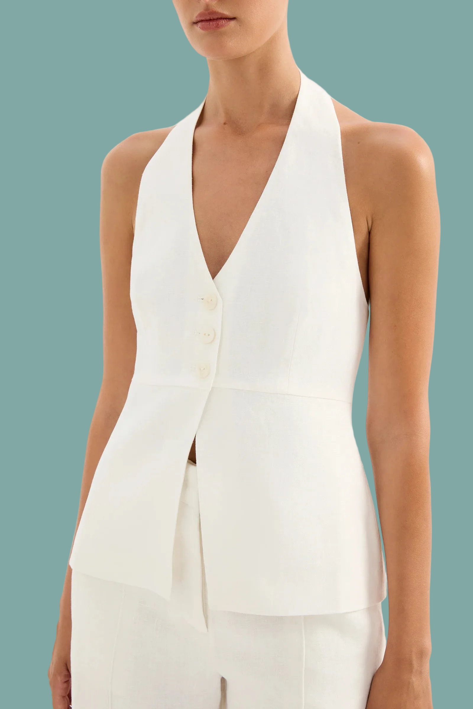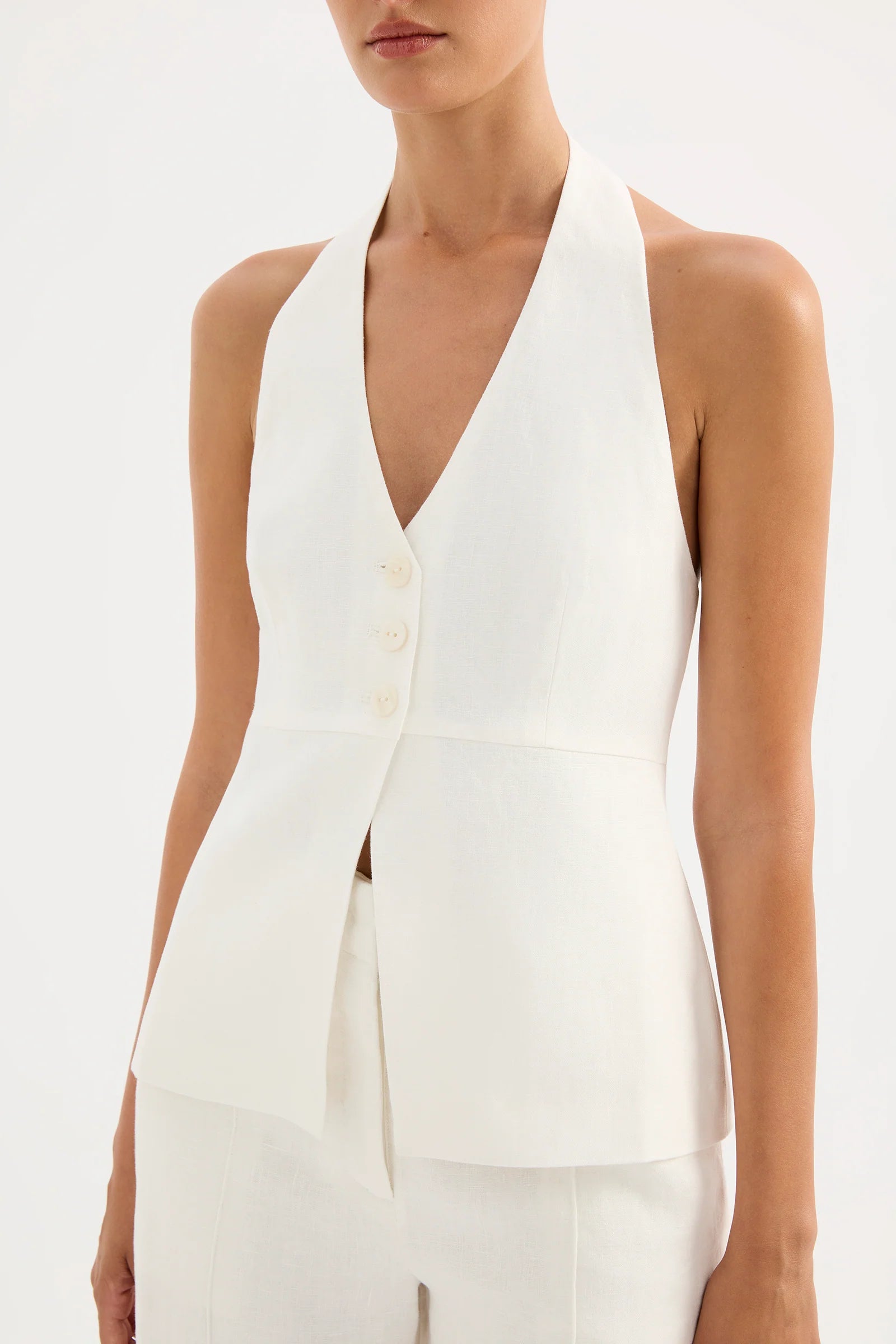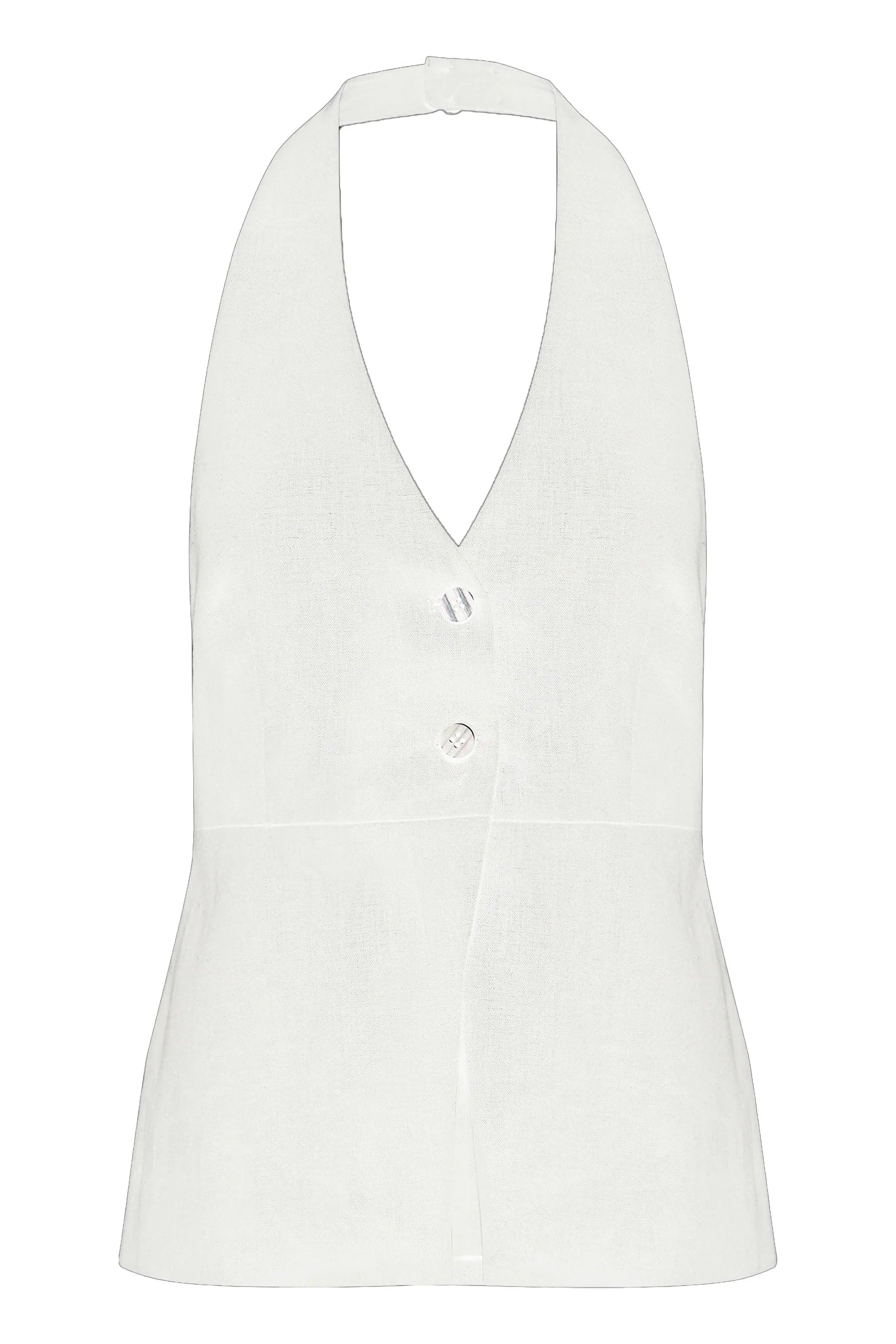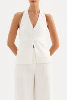 The Zayda Linen Vest brings effortless elegance to your warm-weather wardrobe. Crafted from 100% linen and softly washed for ultimate breathability, this tailored piece hugs your curves with a flattering halter neck and V neckline. The open back adds a flirty touch, while the button front keeps things polished. Fully lined and hitting just below the hips, it's the perfect layering piece or standalone statement. Comfortable, chic, and ready for anything.