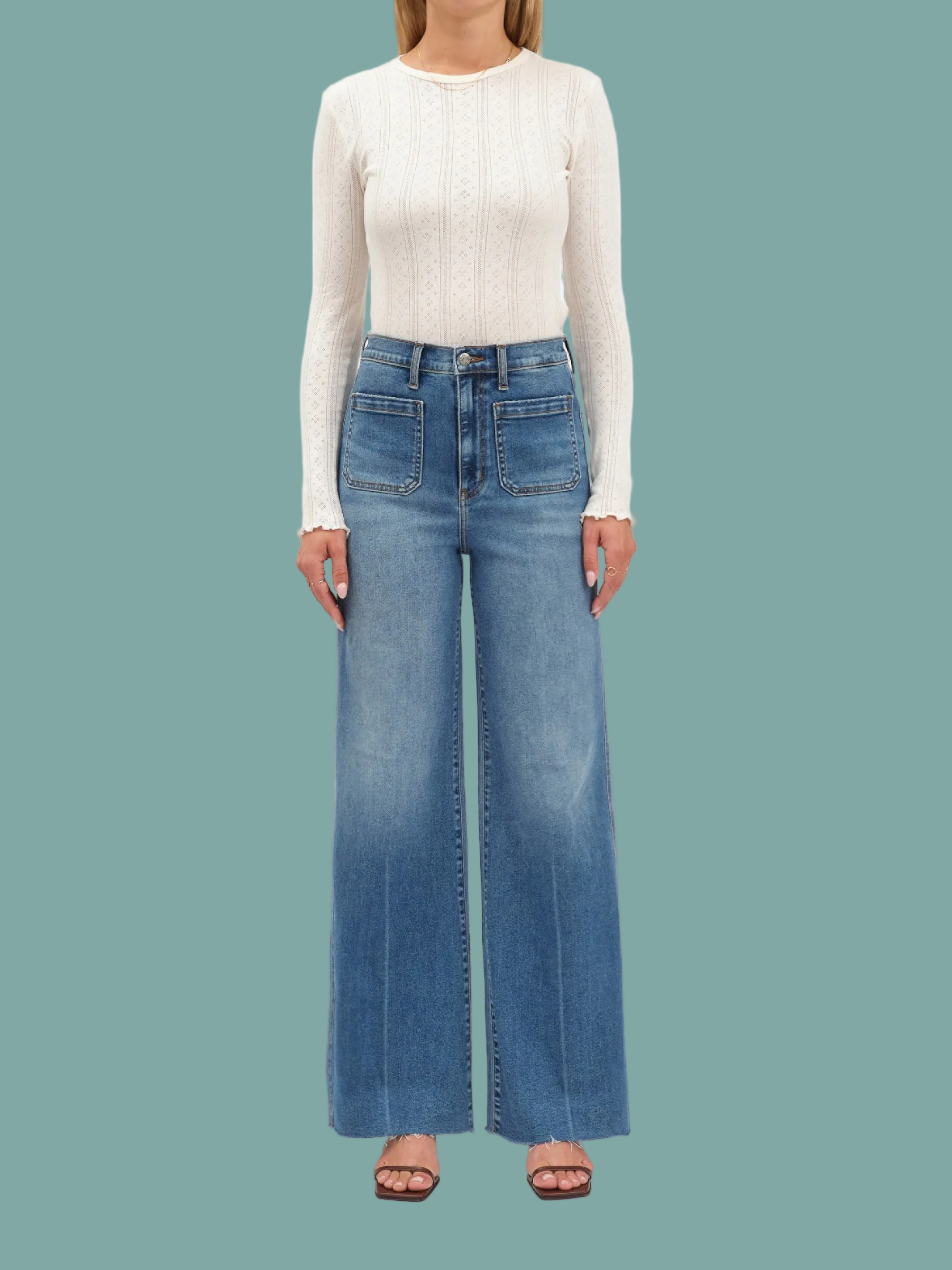 The cool girl jean, Far Out is a modern silhouette in a trending vintage city wash with front pockets. This season's sophisticated essential, this wide leg is constructed in our comfort stretch denim.