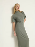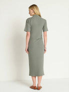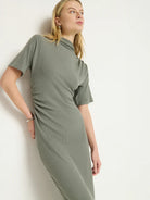 The Rebecca Mock Neck Dress, crafted from soft sweater-like Hacci Rib fabric, offers a flattering midi fit that hugs your curves. Its versatile design easily transitions from a polished look with heels to a laid-back vibe paired with a denim jacket. Available in a stylish Castor Grey, it’s perfect for both casual outings and dressier occasions.