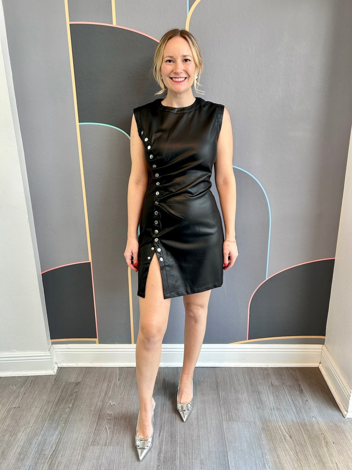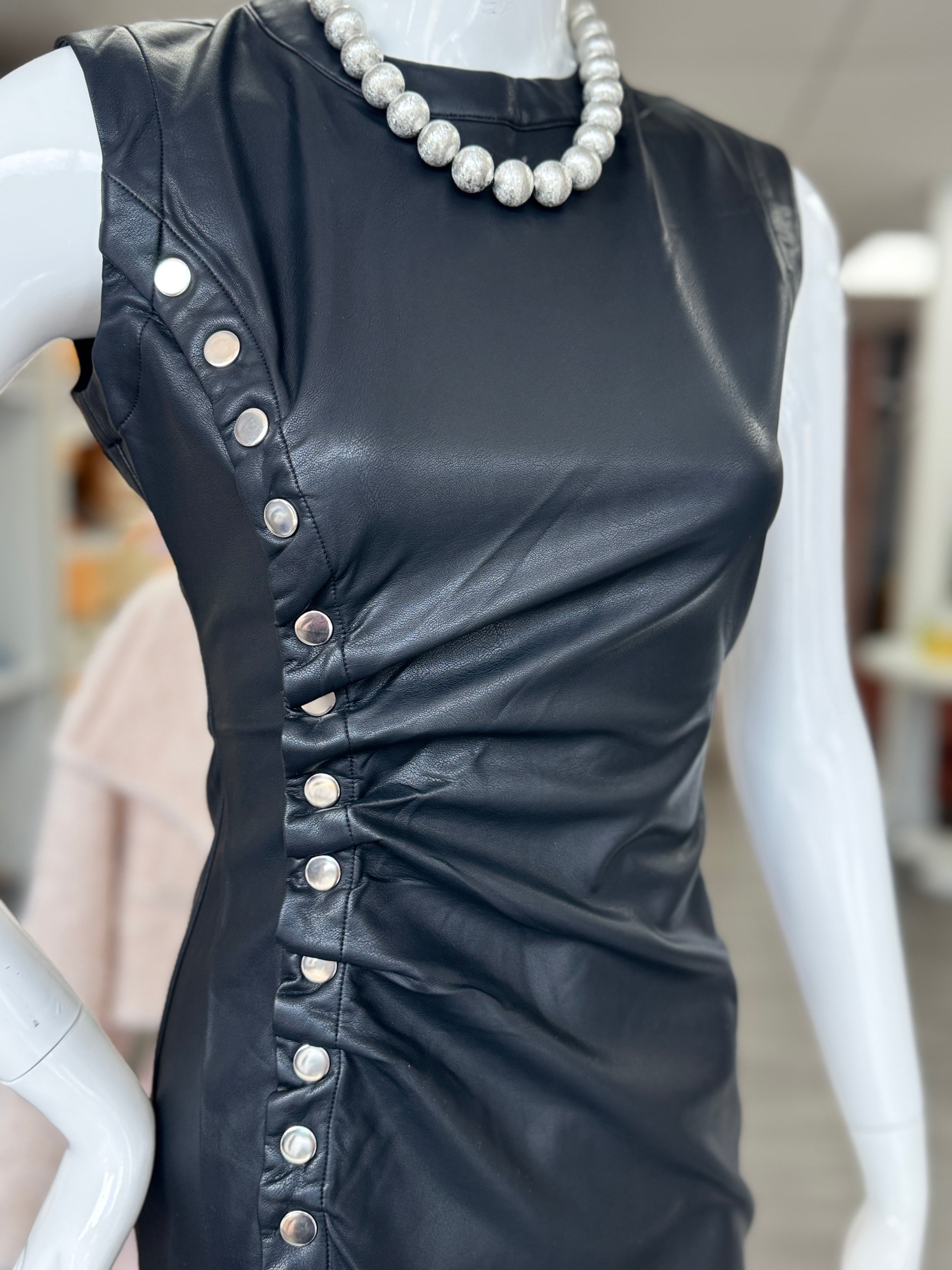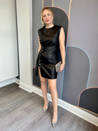 The Robin Dress is a chic vegan leather mini dress designed for effortless style. Featuring side ruffle button details, it adds a playful touch while maintaining a sleek silhouette. Perfect for casual outings, this dress combines comfort with modern edge, making it an ideal choice for your wardrobe.