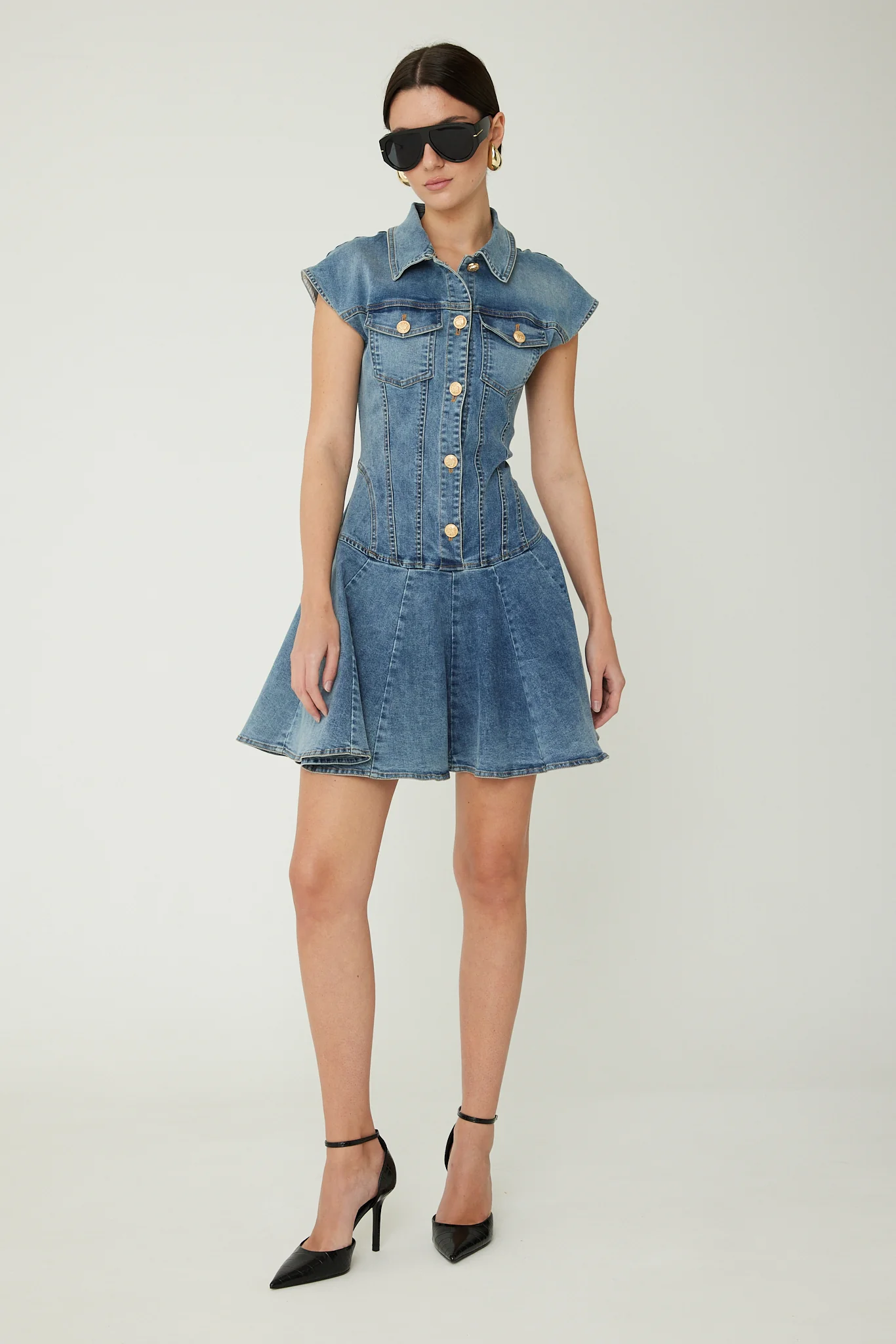 Crafted from JS71's stretch denim in a medium wash, the Tina dress features elegant gold hardware accents. Its fit-and-flare silhouette enhances your shape beautifully. Versatile in style, it transitions effortlessly from casual to refined with just a change of footwear.