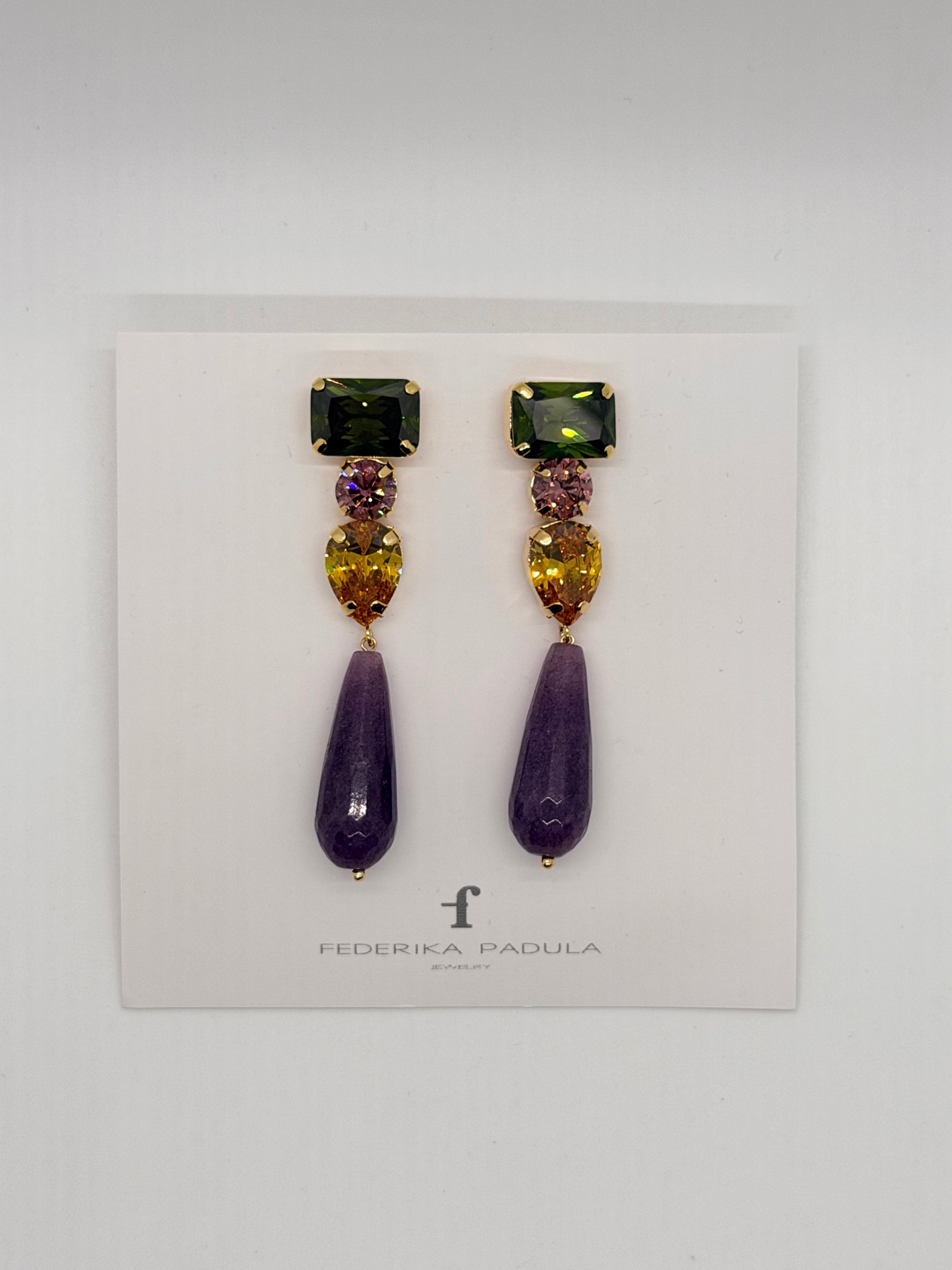 Make a statement with these vibrant drop earrings that blend olive, yellow, and purple stones in varying cuts for eye-catching dimension. The purple dangling stone adds movement and playful flair to your look. Perfect for adding a pop of color to any outfit, these earrings bring good vibes wherever you go.