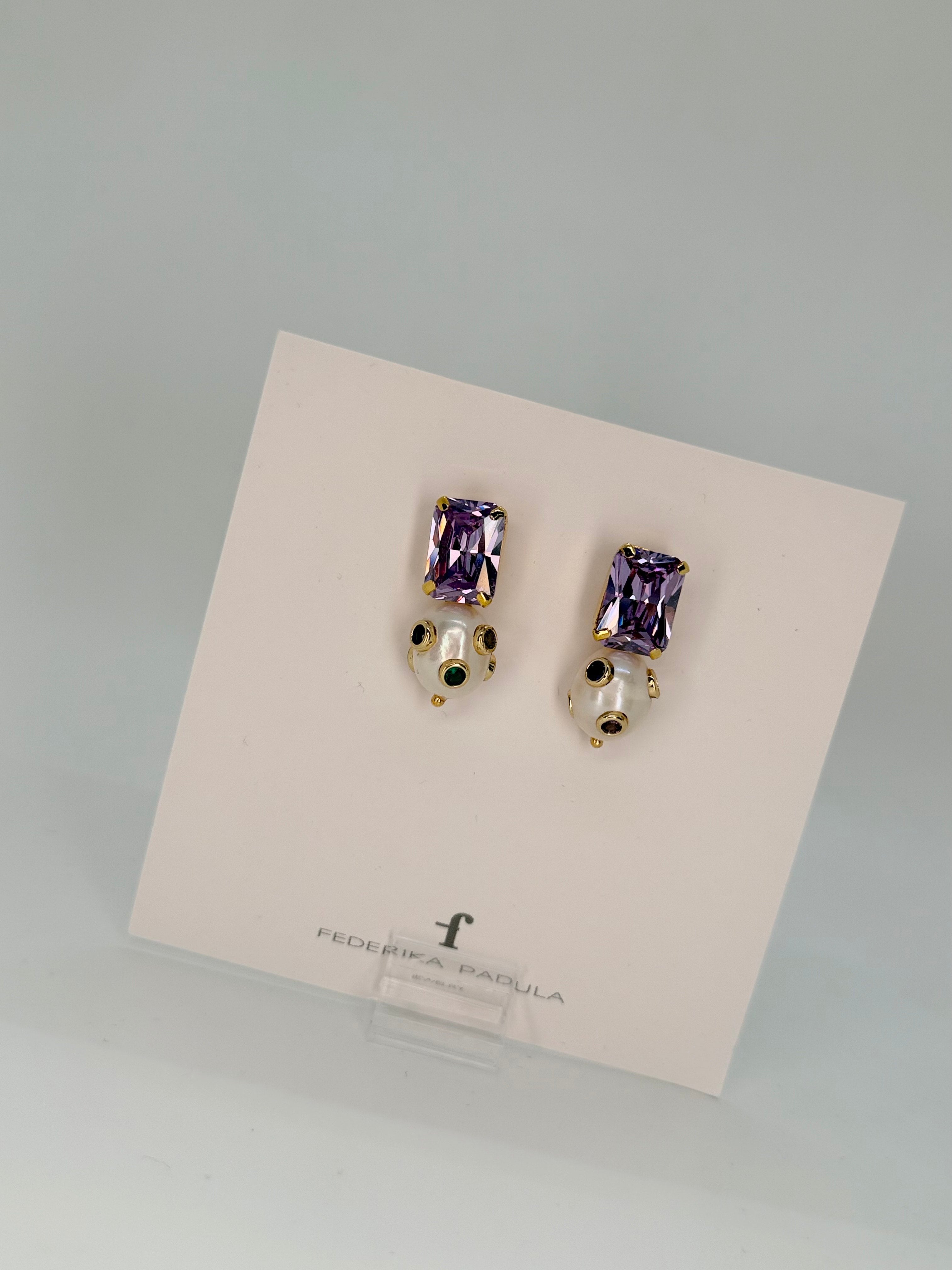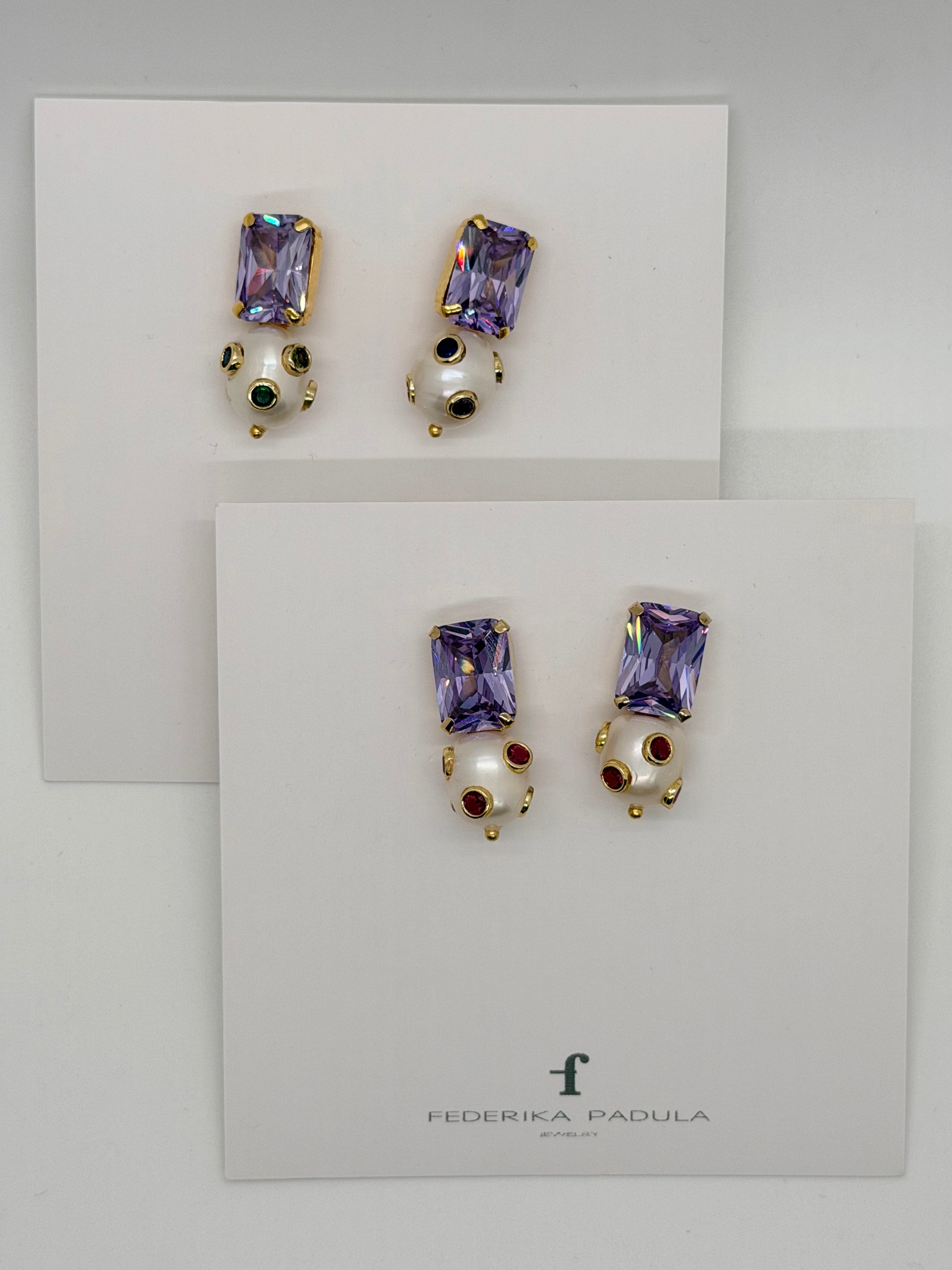These stunning Royal Pearl Earrings feature an emerald cut diamond nestled in lavender, beautifully paired with a lustrous pearl. Choose your vibe: go bold with multicolored studs for an eclectic look, or keep it classic with rich red studs for timeless elegance. Each version delivers sophisticated sparkle with a playful edge, perfect for elevating any outfit from day to night.
