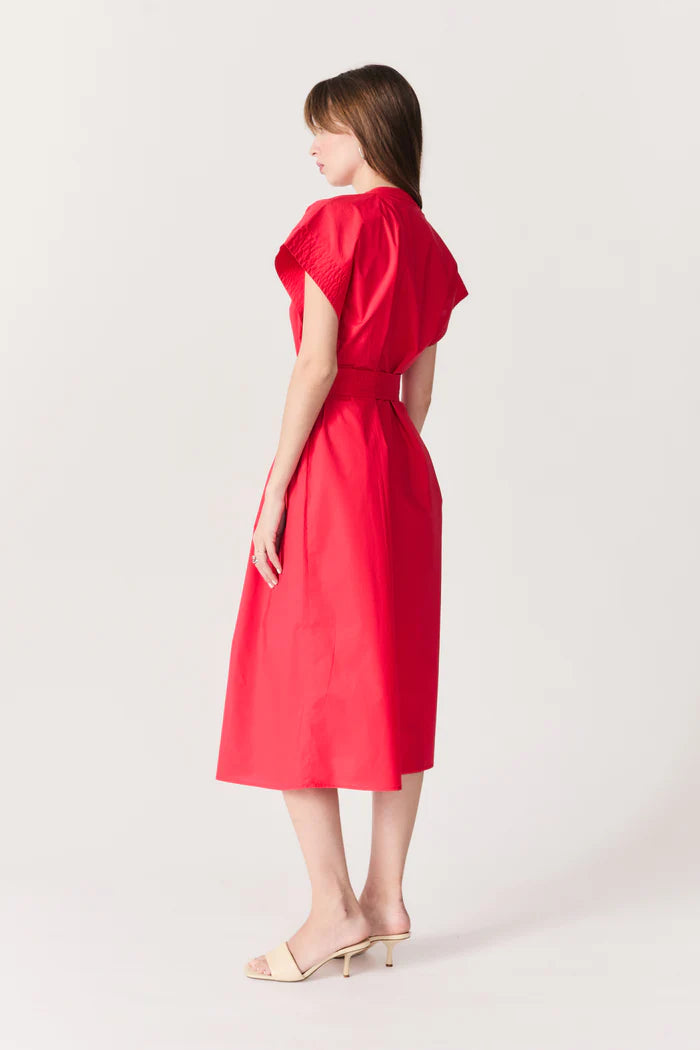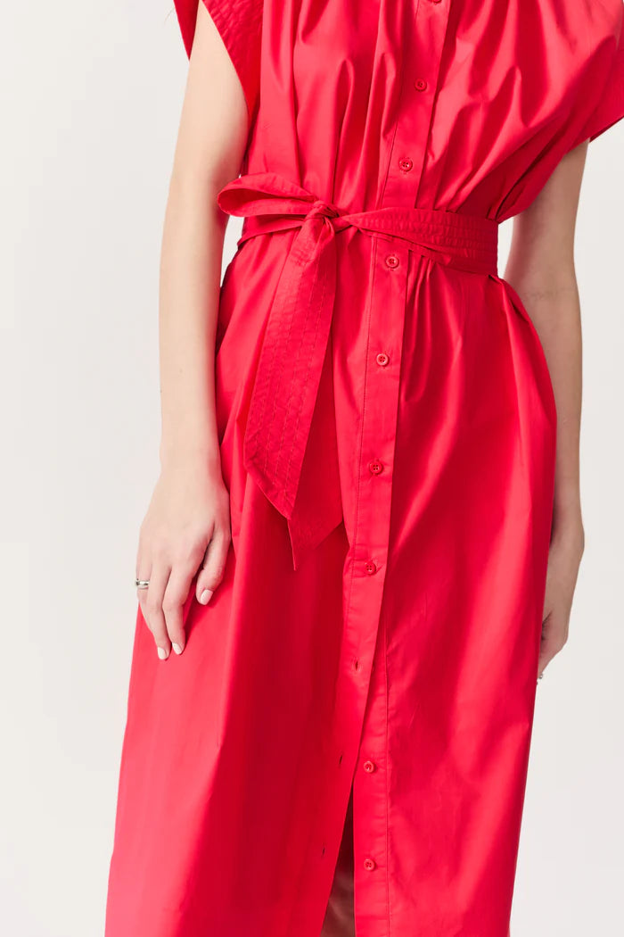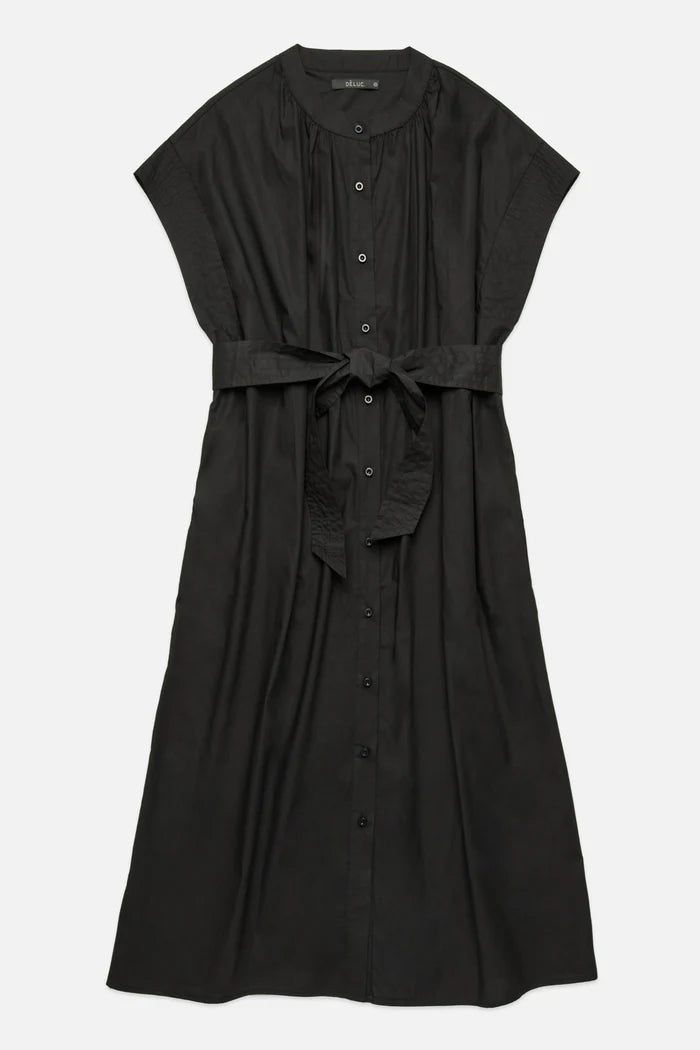 Poplin sleeveless shirt dress with mandarin collar. Self tie belt and pockets at side seam. Front button closure