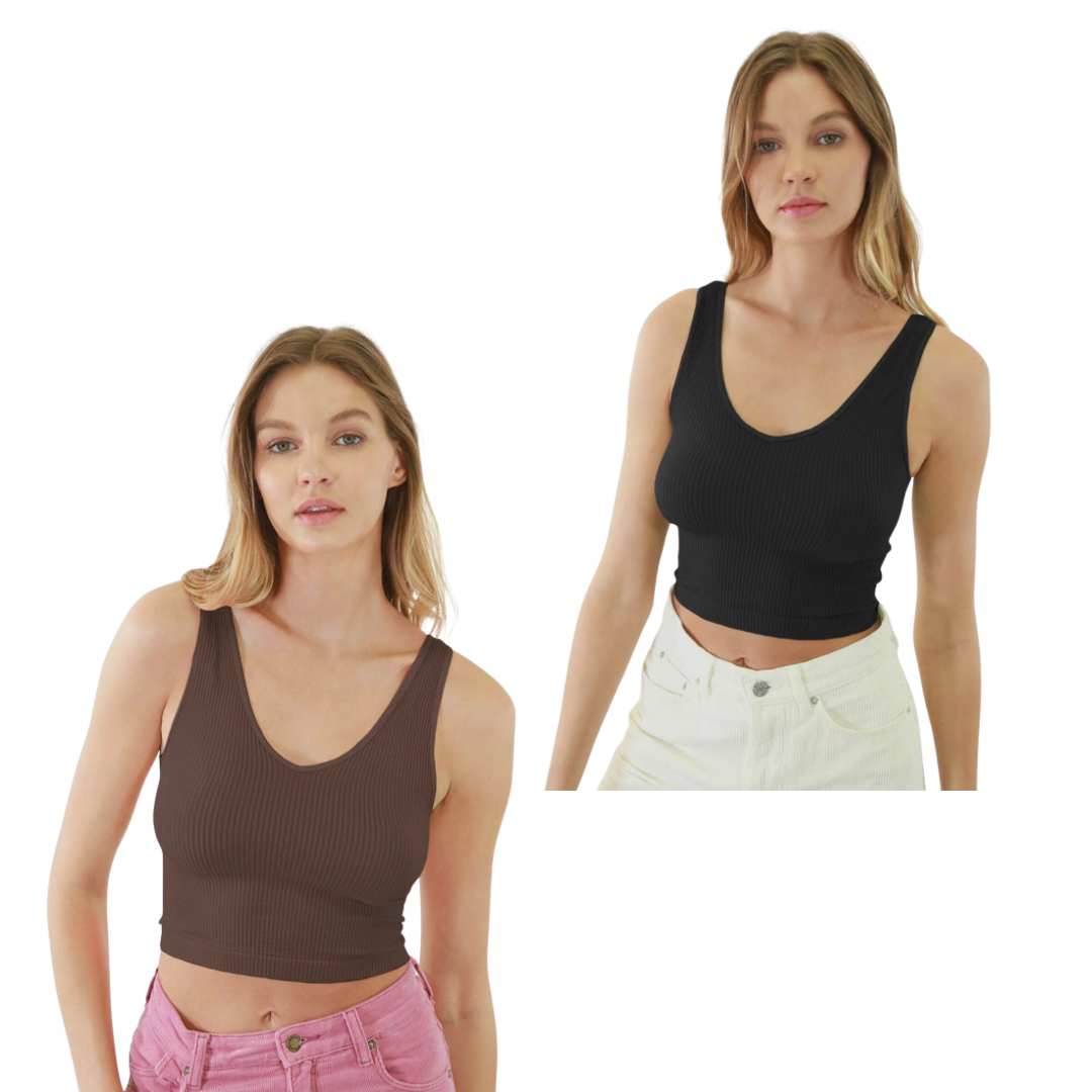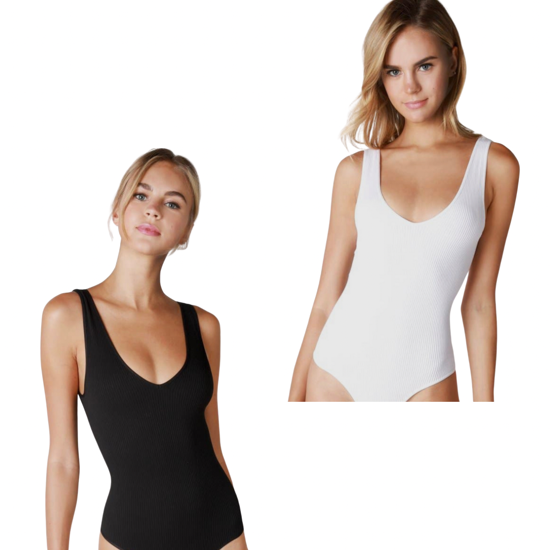 Seamless ribbed knit bodysuit with V-neckline and wide straps..