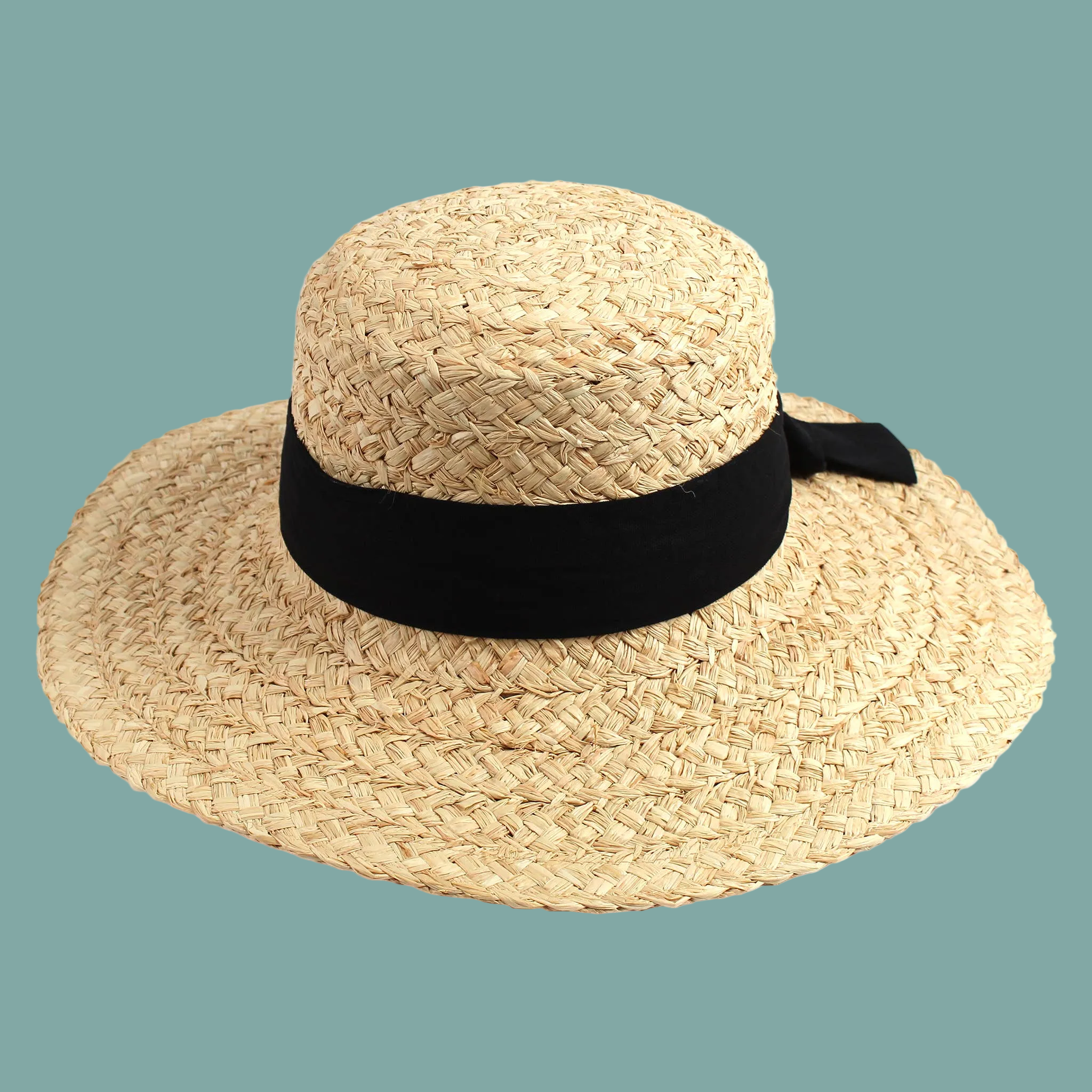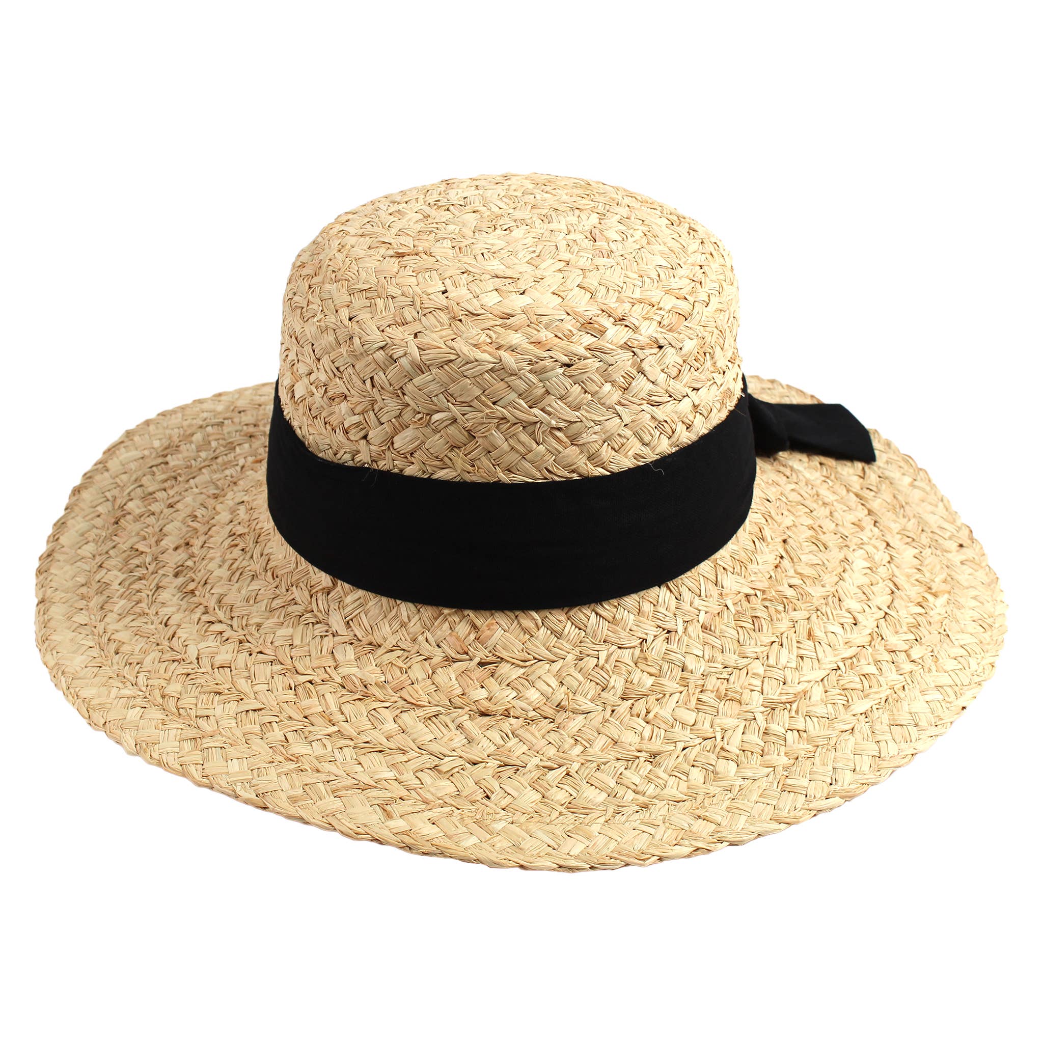 Raffia, Large Flat Brim, wide braid, black ribbon tie in back, elastic tie sweat band, 57 cm This stylish raffia hat features a large flat brim and a wide braided design, complemented by a chic black ribbon tie at the back. With an elastic sweat band for comfort, it fits a head size of 57 cm, making it perfect for both sunny days and fashionable outings.