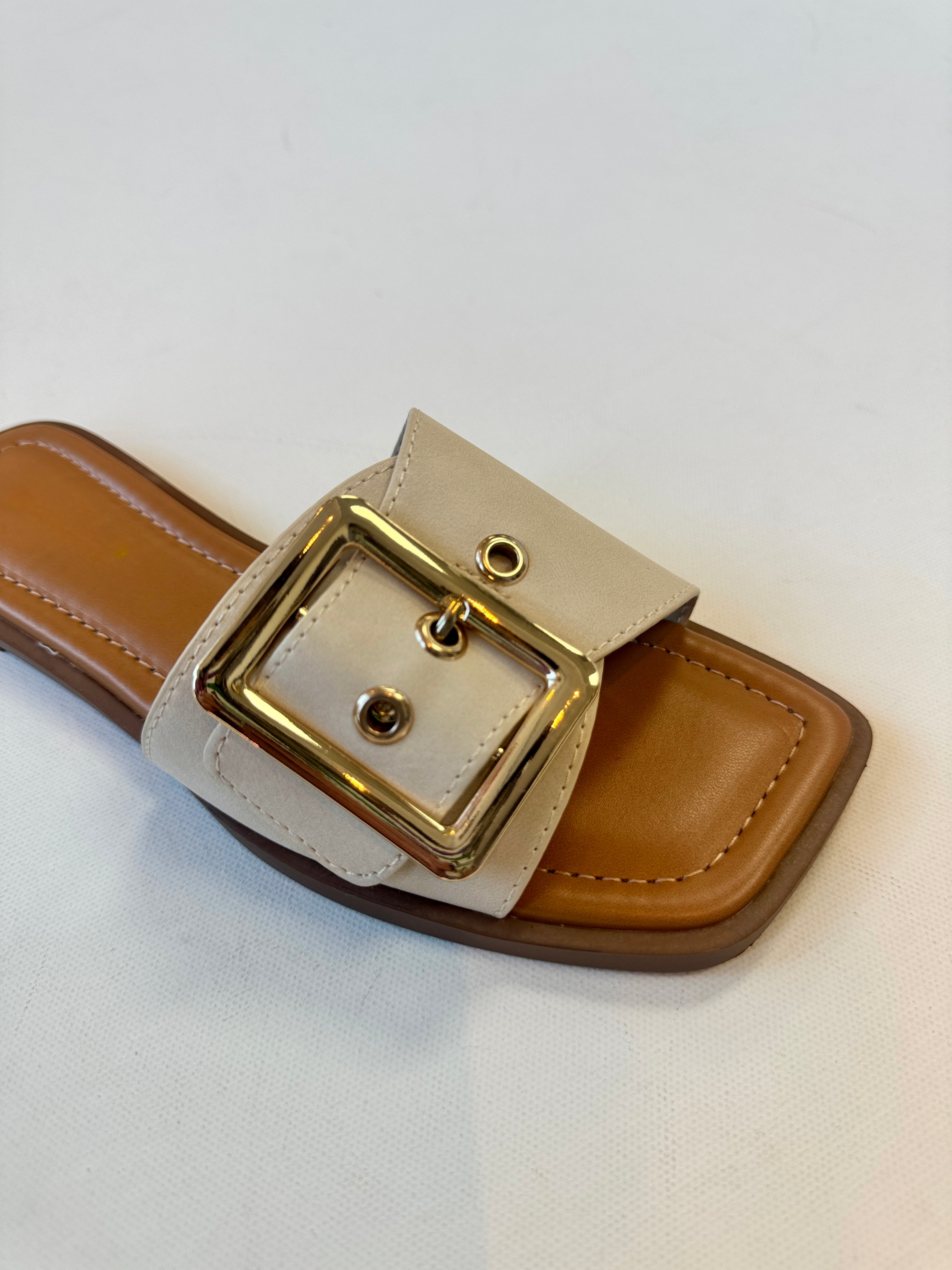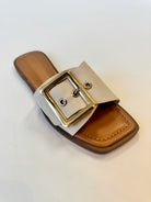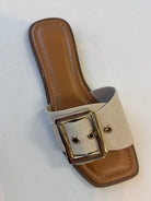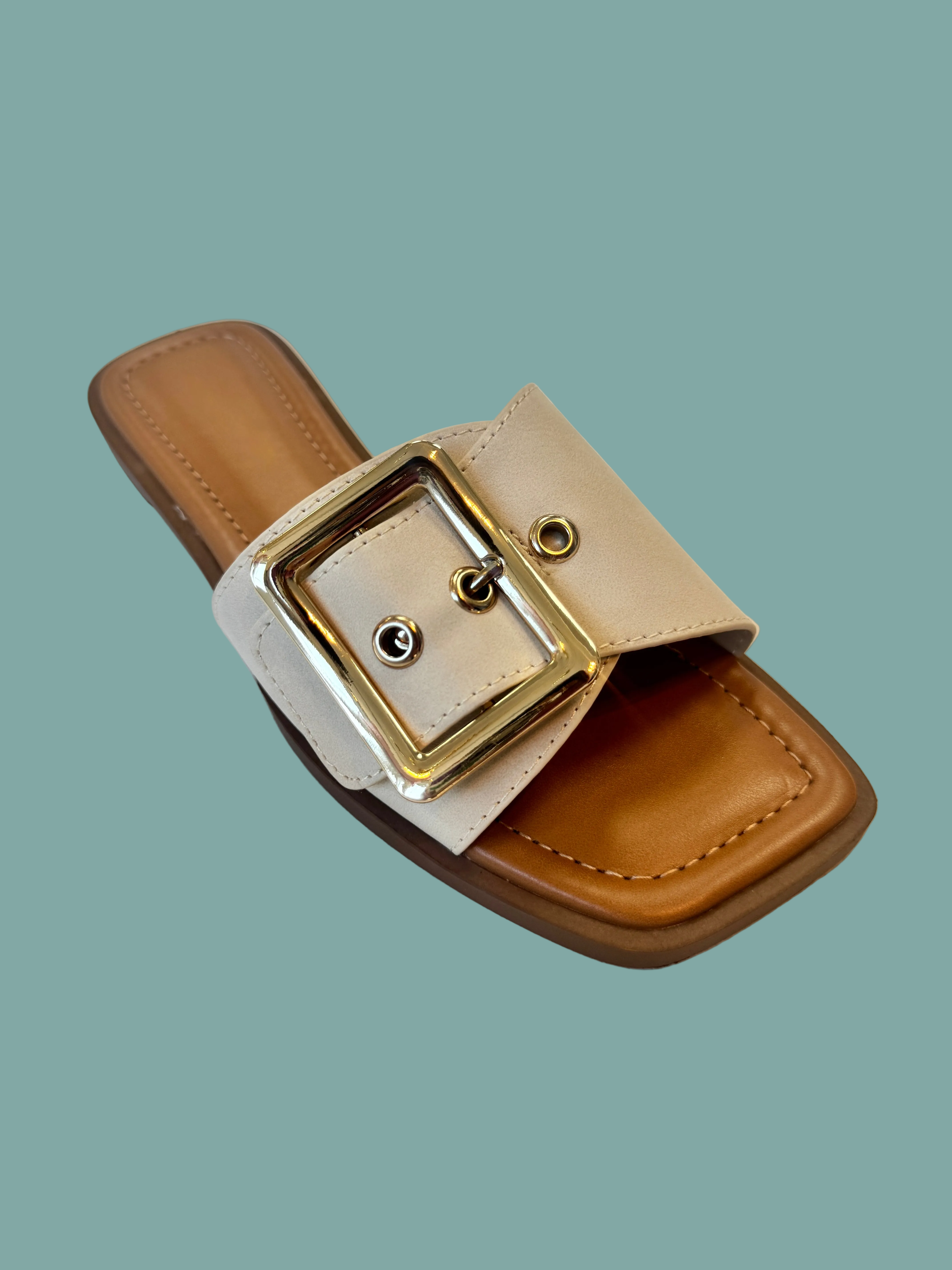 Step into effortless style with the Opera Buckle Sandal, featuring a sleek vegan leather upper paired with an eye-catching oversized gold buckle. Perfect for warm weather adventures, this versatile sandal transitions seamlessly from casual outings to weekend getaways. The comfortable design keeps your feet happy all day long, while the statement buckle adds just the right touch of polish to any outfit. Sustainably crafted without compromising on style or comfort.