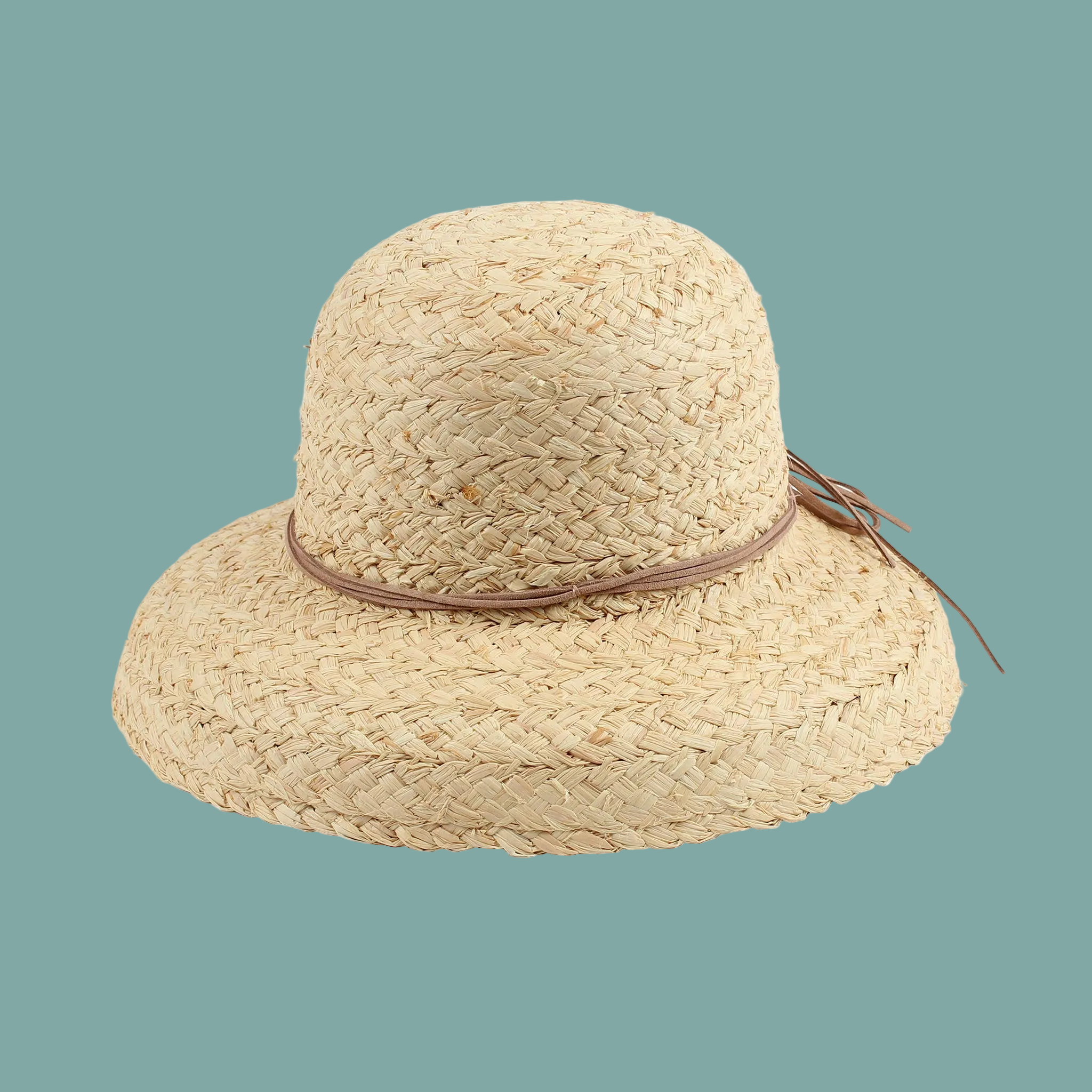 Women's hat, 100% raffia wide braid, triple leather tie, downward bell brim, elastic tie in sweatband, 57cm This hat features a stylish wide braid made from 100% raffia, adorned with a triple leather tie for a chic accent. The downward bell brim provides a trendy silhouette, while an elastic tie in the sweatband ensures a comfortable fit. Designed in a versatile size of 57cm, it combines fashion with functionality, perfect for sun protection or accessorizing any outfit.
