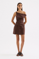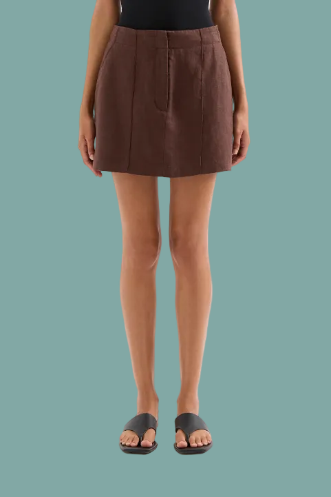 The Theo Linen Skirt is made from 100% linen fabrication with a breathable, soft hand feel. This skirt is mini length and has a high-rise fit. It features a front fly closure and side seam pockets.