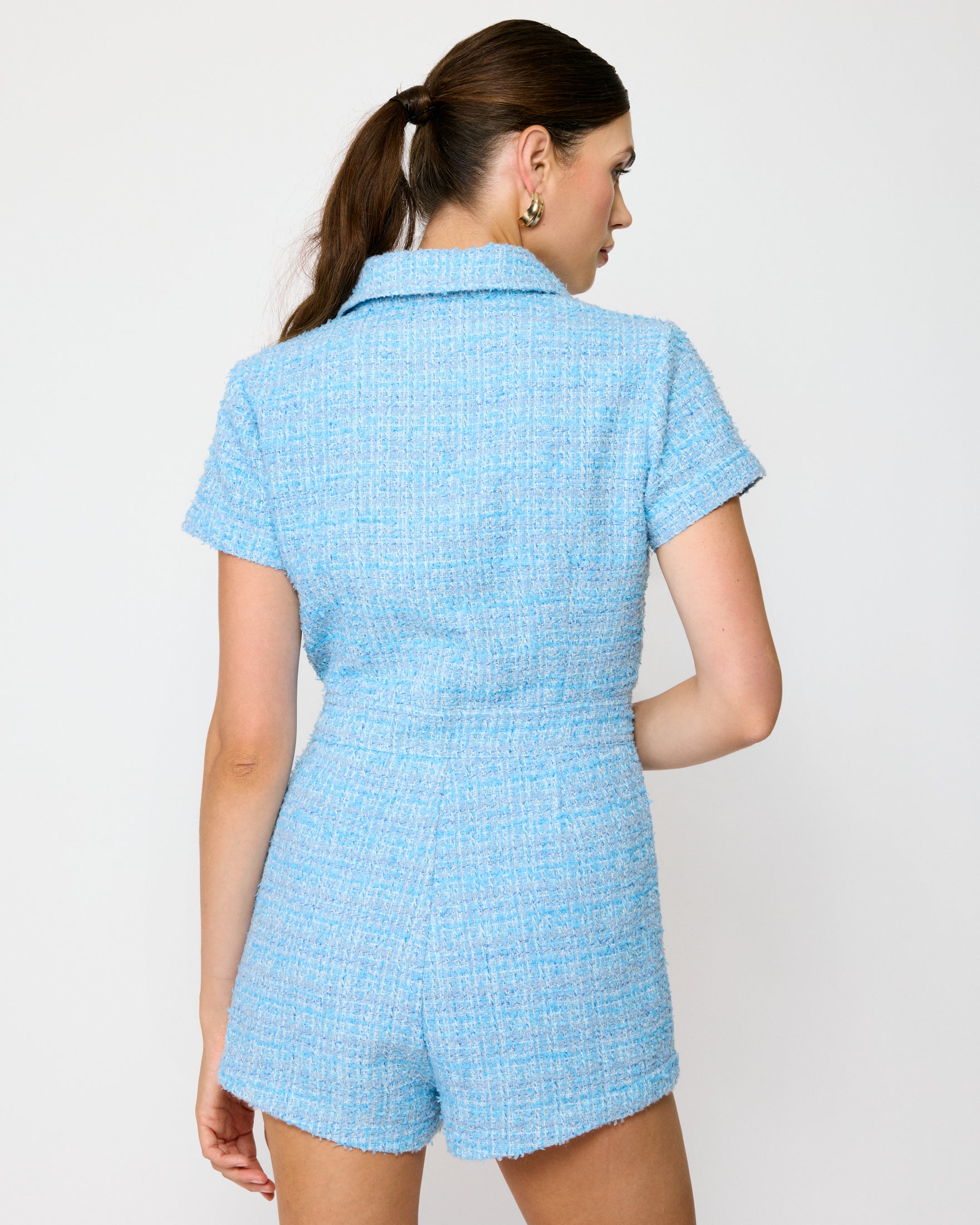 The Kaea Romper combines timeless tweed styling with modern ease. Crafted from mid-weight non-stretch fabric, this piece features a classic collared neckline and short sleeves for versatile layering. A button placket and front welt pocket add functional detail, while the rich blue tweed pattern brings sophisticated color and texture. Perfect for creating polished, put-together looks with minimal effort.