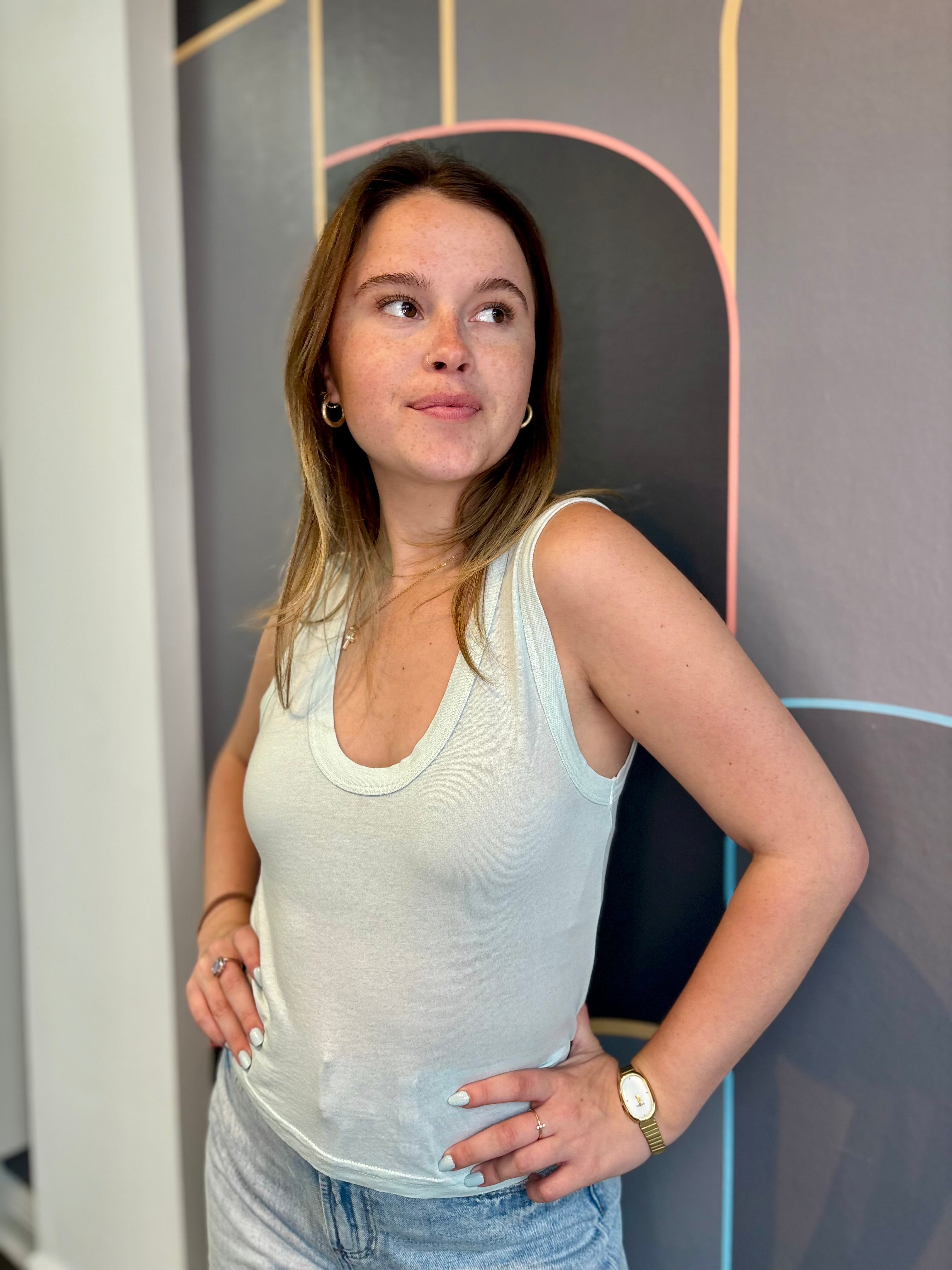 Elevate your everyday with our Khara Rib Scoop Tank. Made from soft cotton, this bra-friendly tank falls naturally at your waistline for ultimate comfort and style. With a u-neckline and wide straps, it's the perfect combination of ease and versatility. *100% cotton for extra softness. Need we say more?