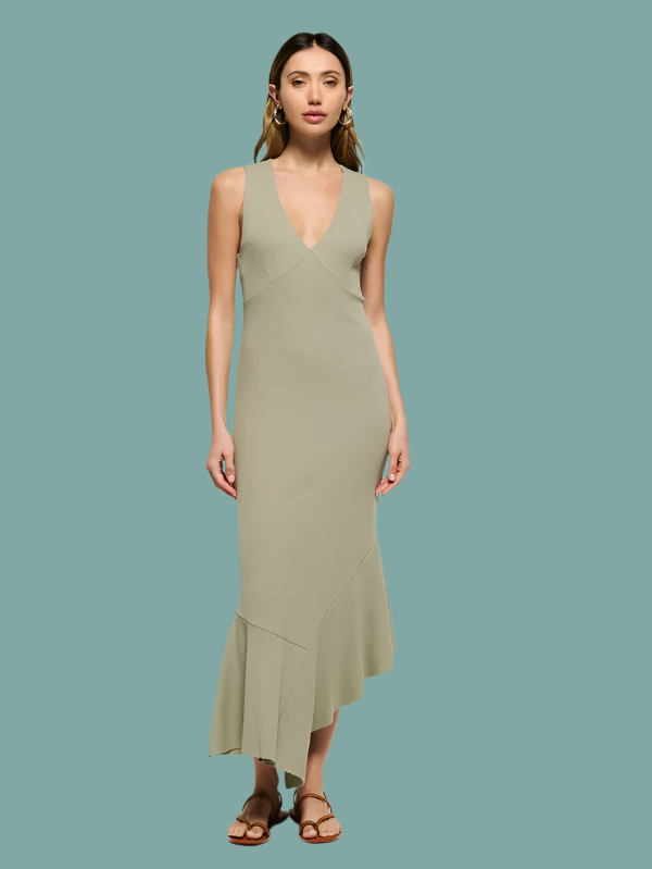 Sophisticated, chic, and beautifully crafted, the Carmel Dress is where minimal effort meets maximum impact. Made in an organic ribbed cotton, this form-fitting midi features a bra-friendly v-neckline, seamed tulip silhouette, and raw edge flutter hem. This one comes in Herb.