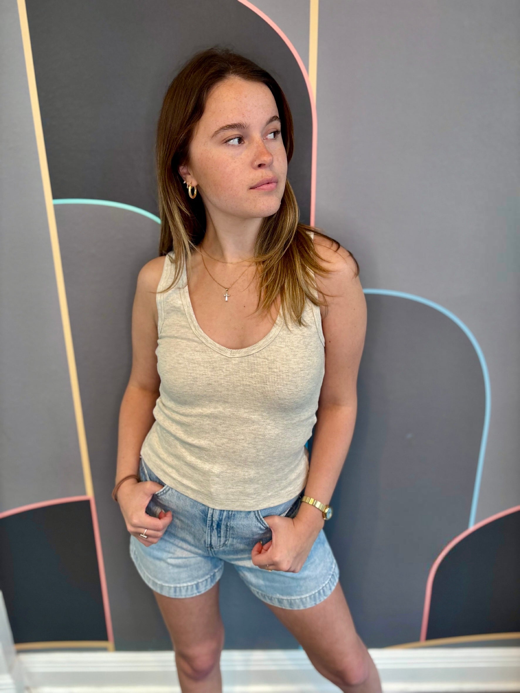 routinely paired with classic denim or one of our relaxed french terry bottoms, you will want to add this ribbed tank into your weekly wardrobe rotation.