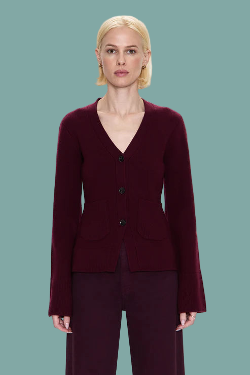 Your perfect layering companion. Aeron features a flattering V-neck silhouette and relaxed fit that feels effortlessly chic. The classic button-front styling brings timeless appeal while the comfortable proportions make it perfect for layering or wearing solo. Crafted from a luxurious blend of 33% viscose, 23% nylon, 20% wool, 20% cotton, and 4% cashmere that feels incredibly soft against the skin. Claret brings rich sophistication with its deep burgundy tone. If you love the Dani, you'll love this V-neck version that brings the same elevated comfort with a more open neckline