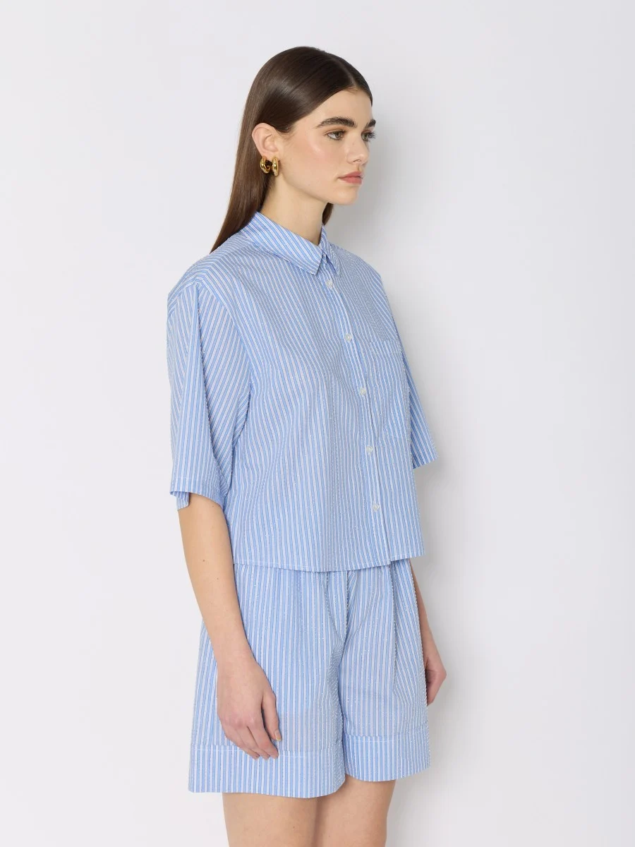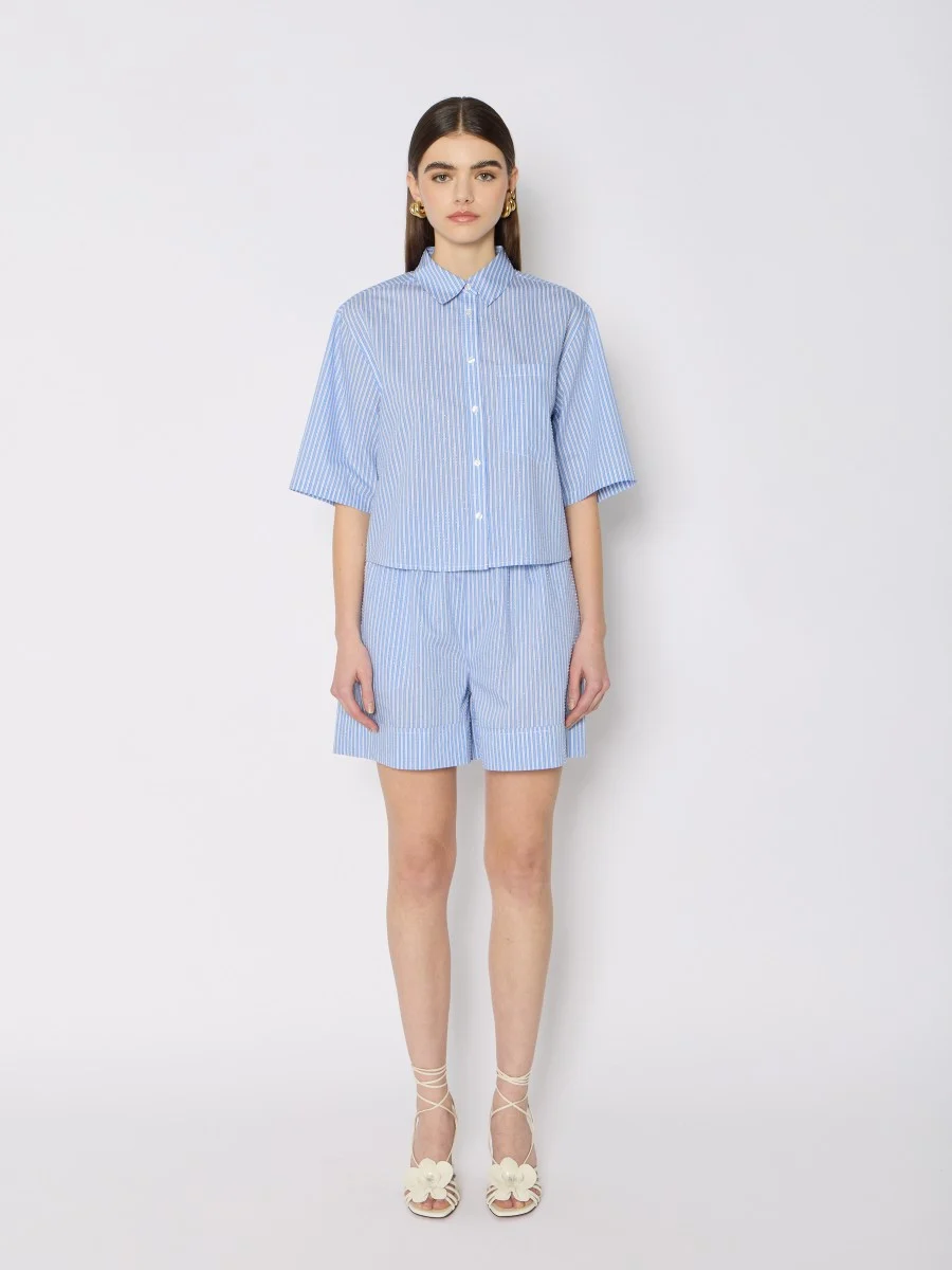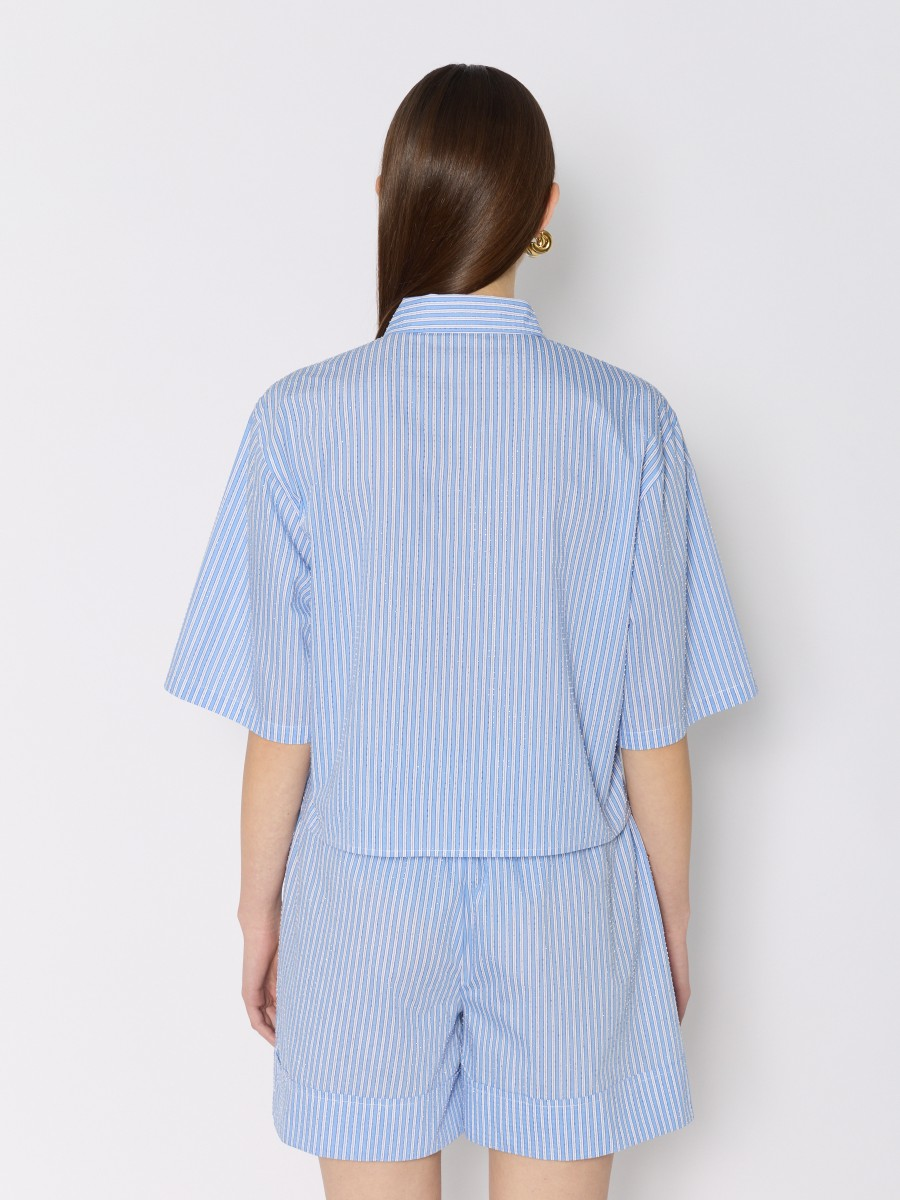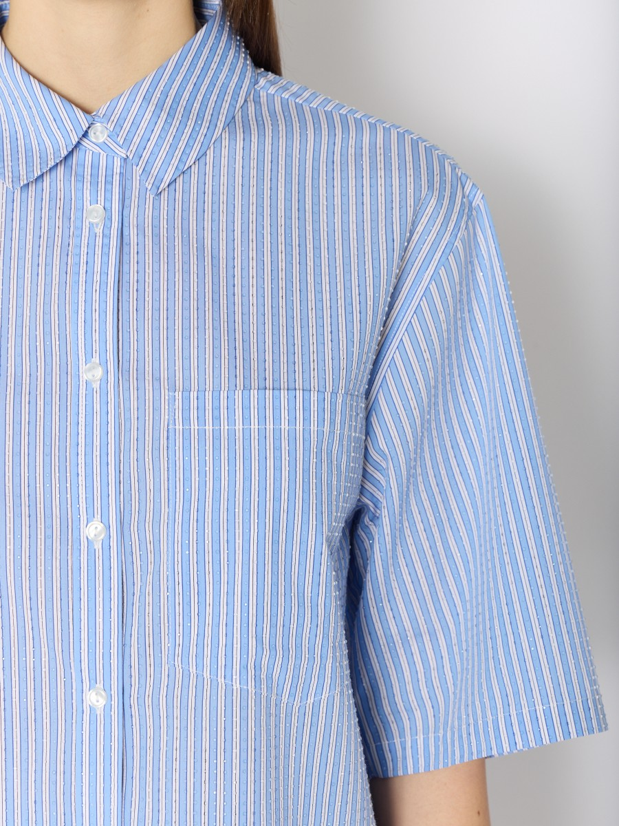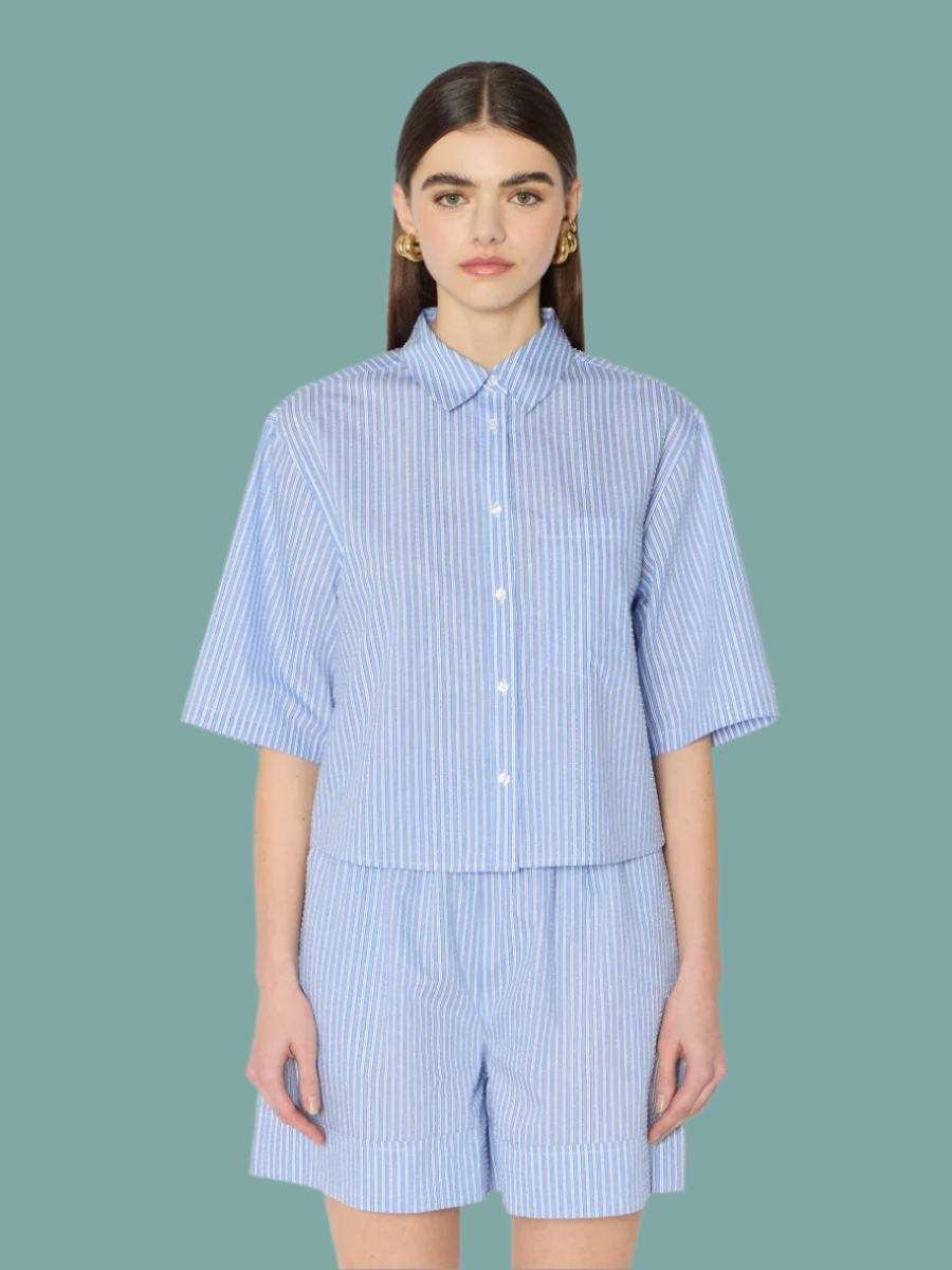 The CIRILLA shirt is a chic and modern summer piece, ideal for adding a touch of shine to your outfit. Made in an elegant blue with white stripes, it has a trendy and refined design. clear rhinestones subtly adorn the shirt, catching the light and providing a discreet sparkle for a cool look. With its short sleeves and short cut, the CIRILLA shirt pairs perfectly with the matching PSELIN shorts, creating a coordinated set that exudes freshness and elegance. The shorts, matching the stripes and details of the shirt, complete the look with style. This set is perfect for a casual day, ensuring a harmonious and trendy style.
