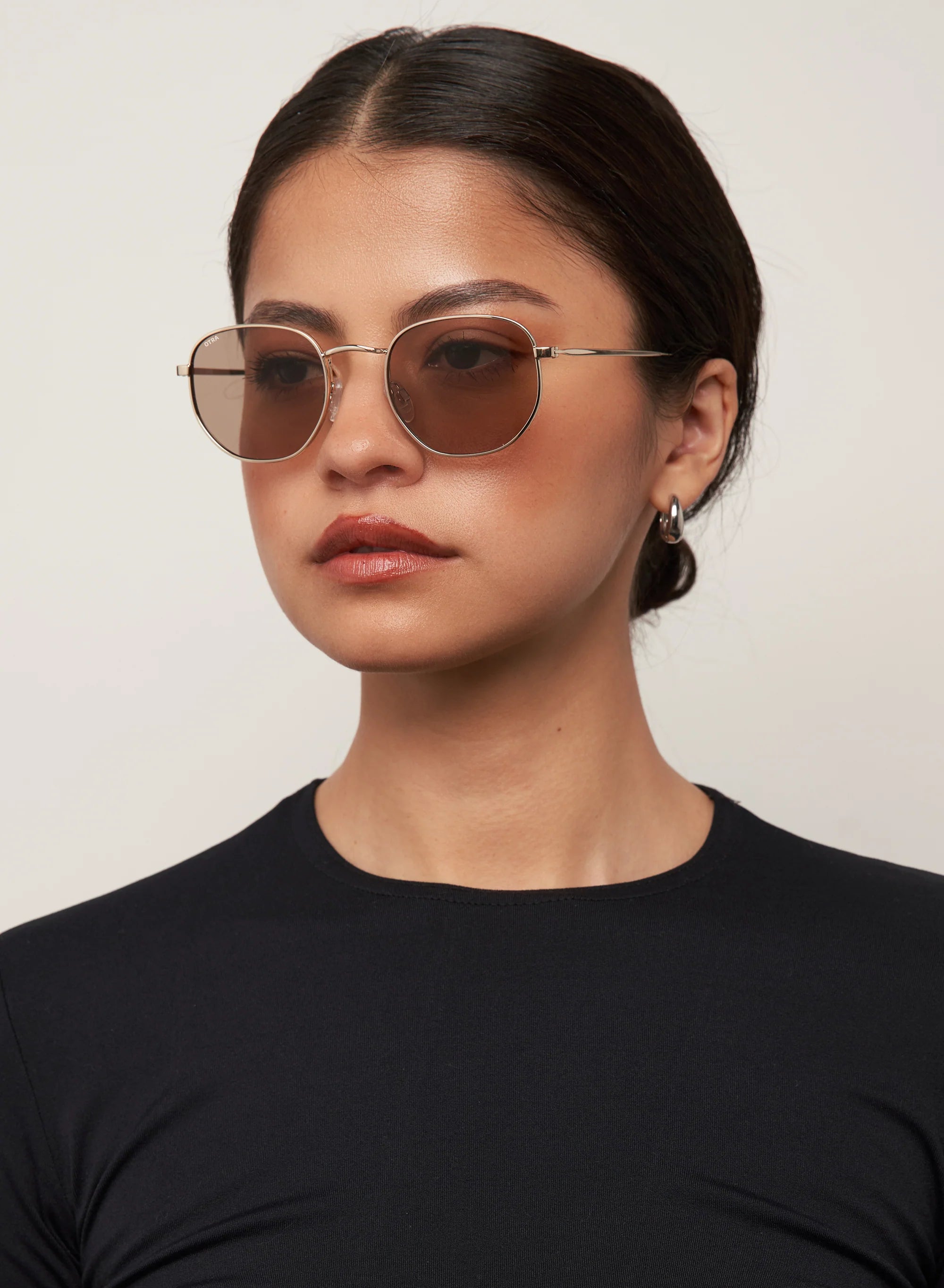Bowie Sunnies feature a sleek hexagonal gold metal frame that perfectly combines vintage vibes with a modern twist. The warm brown lenses add a touch of timeless style while keeping your look fresh and effortless. These sunglasses are your go-to accessory for adding subtle sophistication to any casual outfit.