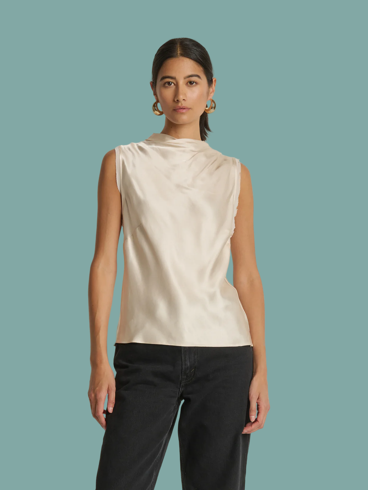 Delilah Tank in Moonbeam Effortless sophistication meets everyday wearability in this hammered satin tank. The cowl neckline and raw edge details create subtle visual interest, while the button-back keyhole closure adds a touch of intrigue. Designed in our signature fit with a sleeveless cut that transitions seamlessly from day to night, this refined piece becomes an instant wardrobe essential. The soft, luminous Moonbeam shade pairs with everything.
