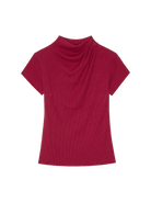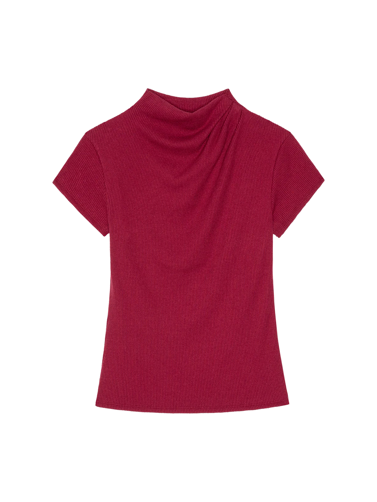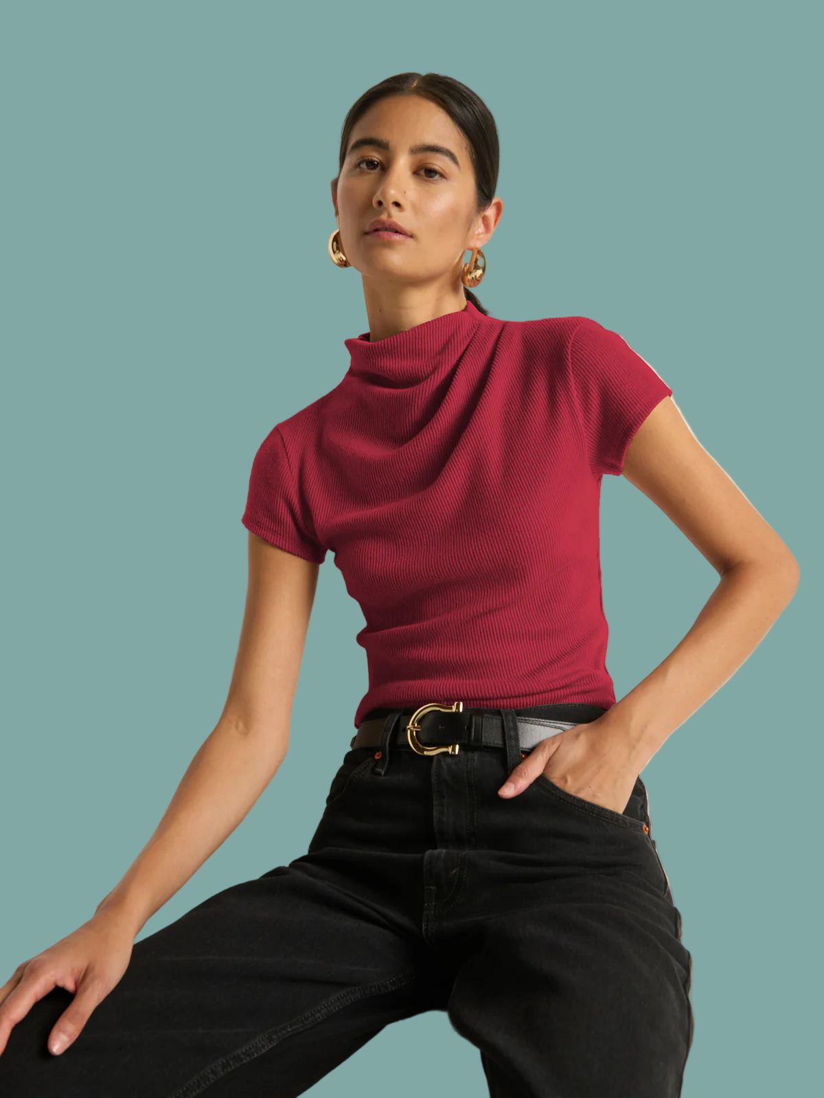 The Katie Draped Top channels effortless Parisian style with its thoughtfully designed silhouette. Featuring strategic pleats and draping that flatters your figure, this piece is crafted with a hint of stretch for comfortable all-day wear. The mock neck and cap sleeves create a polished yet relaxed look that works as a versatile base layer or standalone statement. In rich Sangria, it's the perfect addition to your everyday wardrobe.
