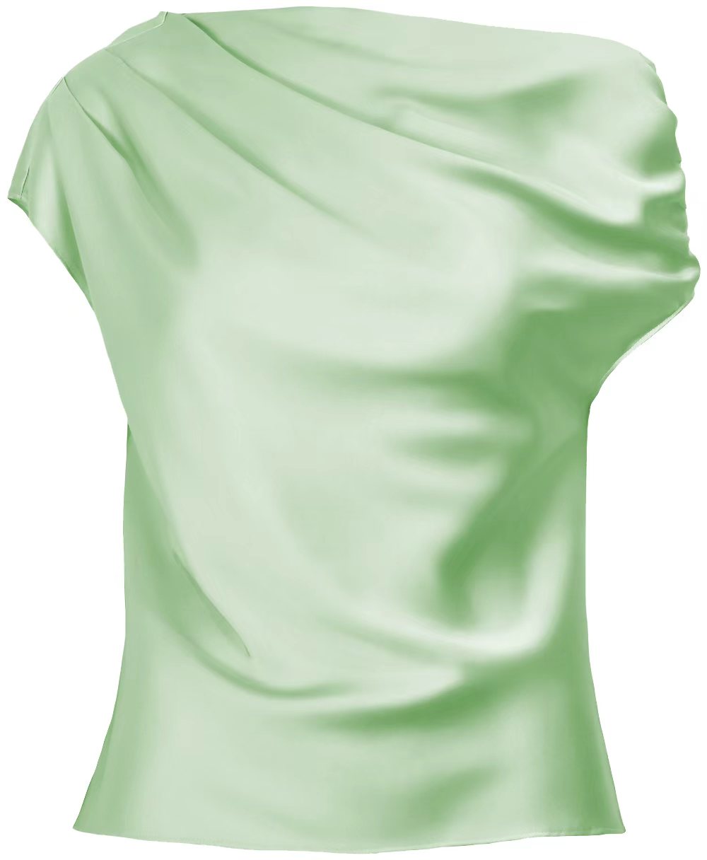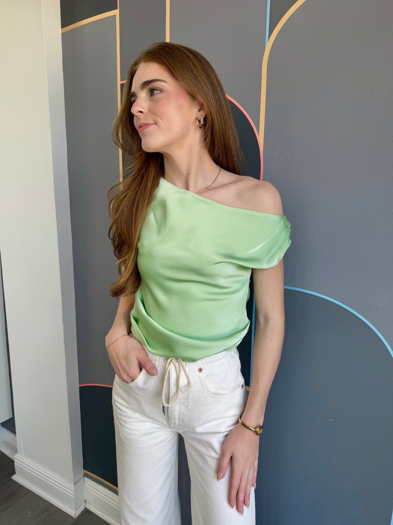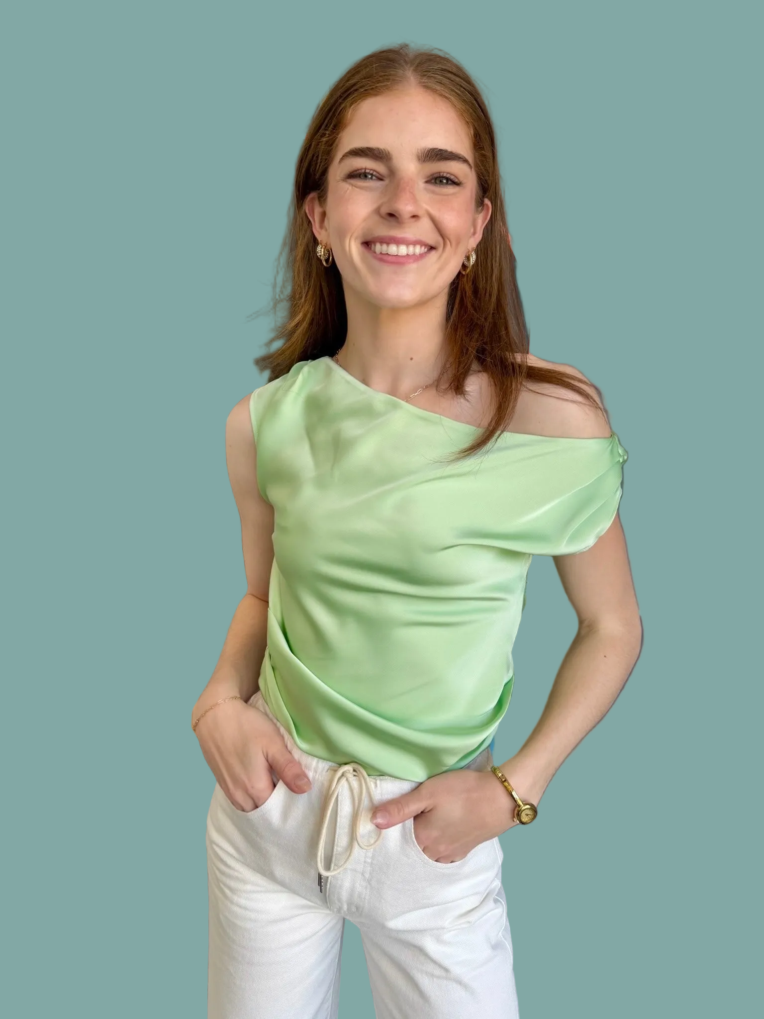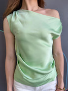 The Liara Asymmetrical Top brings effortless style to your everyday rotation. Crafted in luxe satin, this piece features an eye-catching asymmetrical cut and ruched shoulder detail that adds dimension and movement. The soft light green hue works beautifully with neutrals or bold accessories, making it perfect for dressing up or down. Whether you're heading to brunch or a night out, this versatile top delivers modern sophistication with a relaxed vibe.