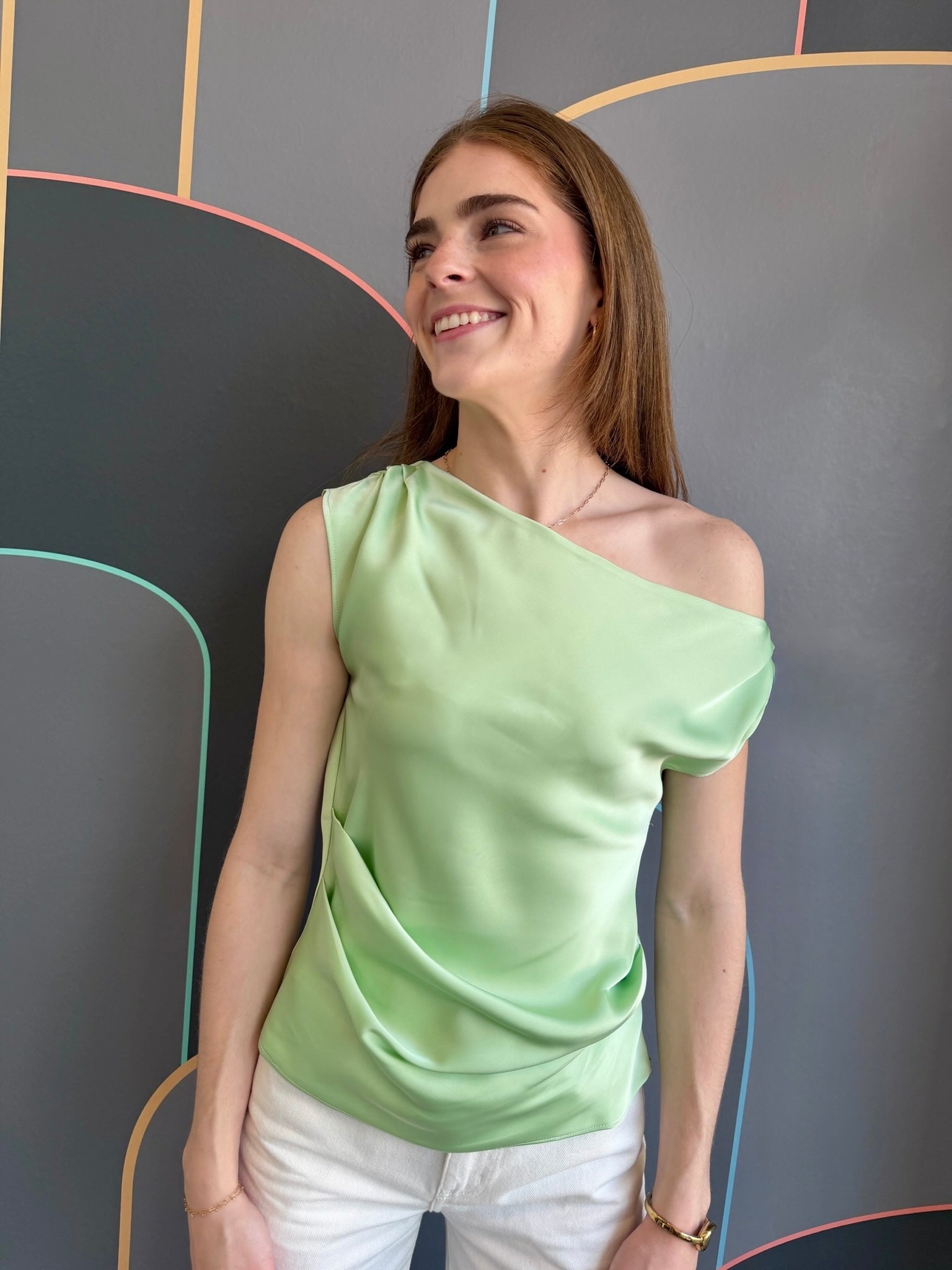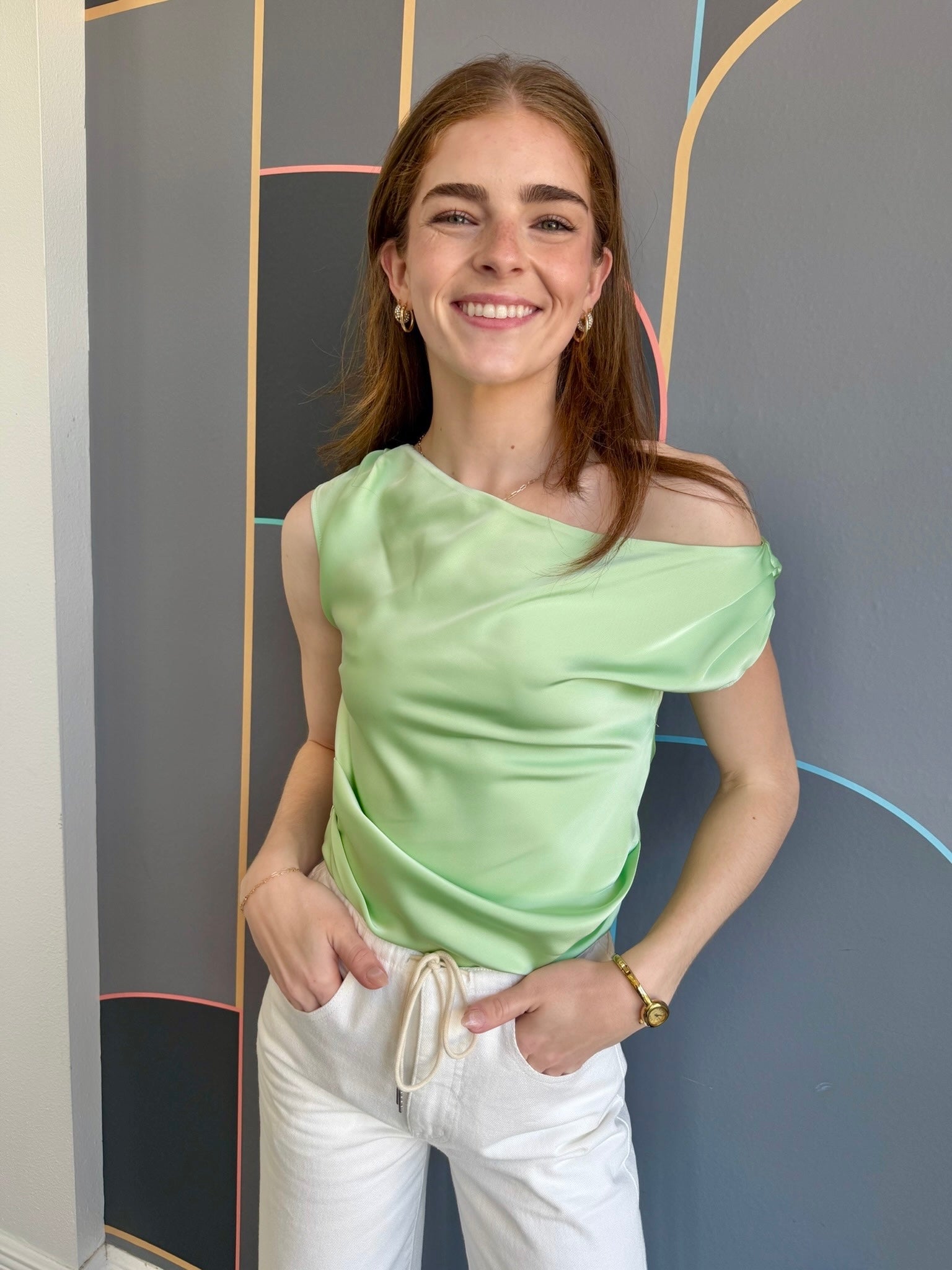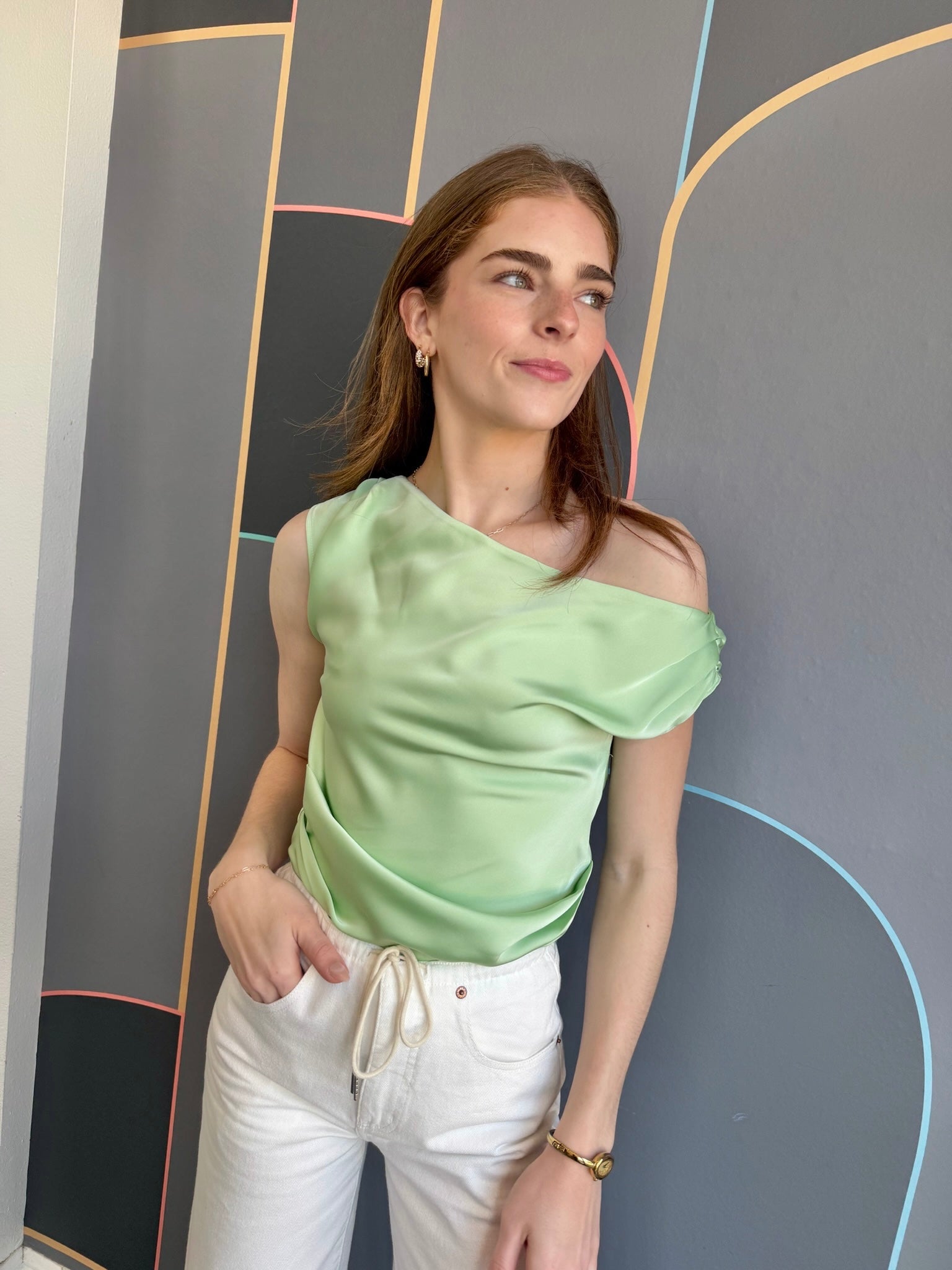 The Liara Asymmetrical Top brings effortless style to your everyday rotation. Crafted in luxe satin, this piece features an eye-catching asymmetrical cut and ruched shoulder detail that adds dimension and movement. The soft light green hue works beautifully with neutrals or bold accessories, making it perfect for dressing up or down. Whether you're heading to brunch or a night out, this versatile top delivers modern sophistication with a relaxed vibe.