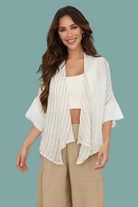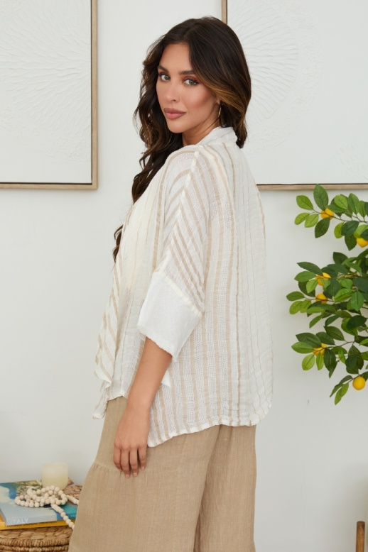 Effortless layering meets timeless style with this striped fishnet knit cardigan. Crafted in a soft cream and beige palette, the open front design lets you wear it loose and relaxed over your favorite tees or dresses. The delicate knit texture adds visual interest while keeping things breathable and comfortable. Perfect for transitional seasons or as a lightweight layer year-round.