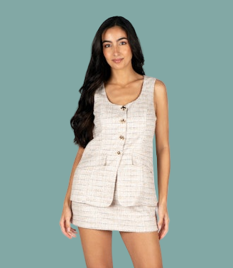 The Angeline Romper in Beige Tweed blends vintage charm with a modern twist. Made from a premium tweed blend, its textured fabric and warm beige tone offer a polished, casual look. The sleeveless design features a flattering scoop neck, gold-tone buttons, and front flap details, while the tailored fit and mini length keep it chic and comfortable. Ideal for business casual outings, luncheons, or daytime events, this romper lets you dress up with ease and confidence.