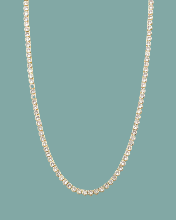 Elevate your jewelry game with the Baroness Tennis Necklace—a timeless piece that's made for mixing and matching. Featuring 81 shimmering simulated diamonds set in sleek bezels, this 15" necklace delivers serious sparkle without the serious price tag. Whether you're stacking it with other delicate chains or letting it shine solo, this versatile stunner works for everything from everyday glam to special occasions. A wardrobe essential that's as practical as it is gorgeous.
